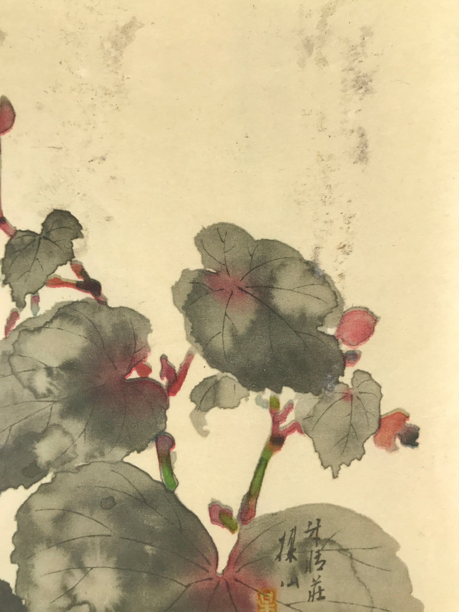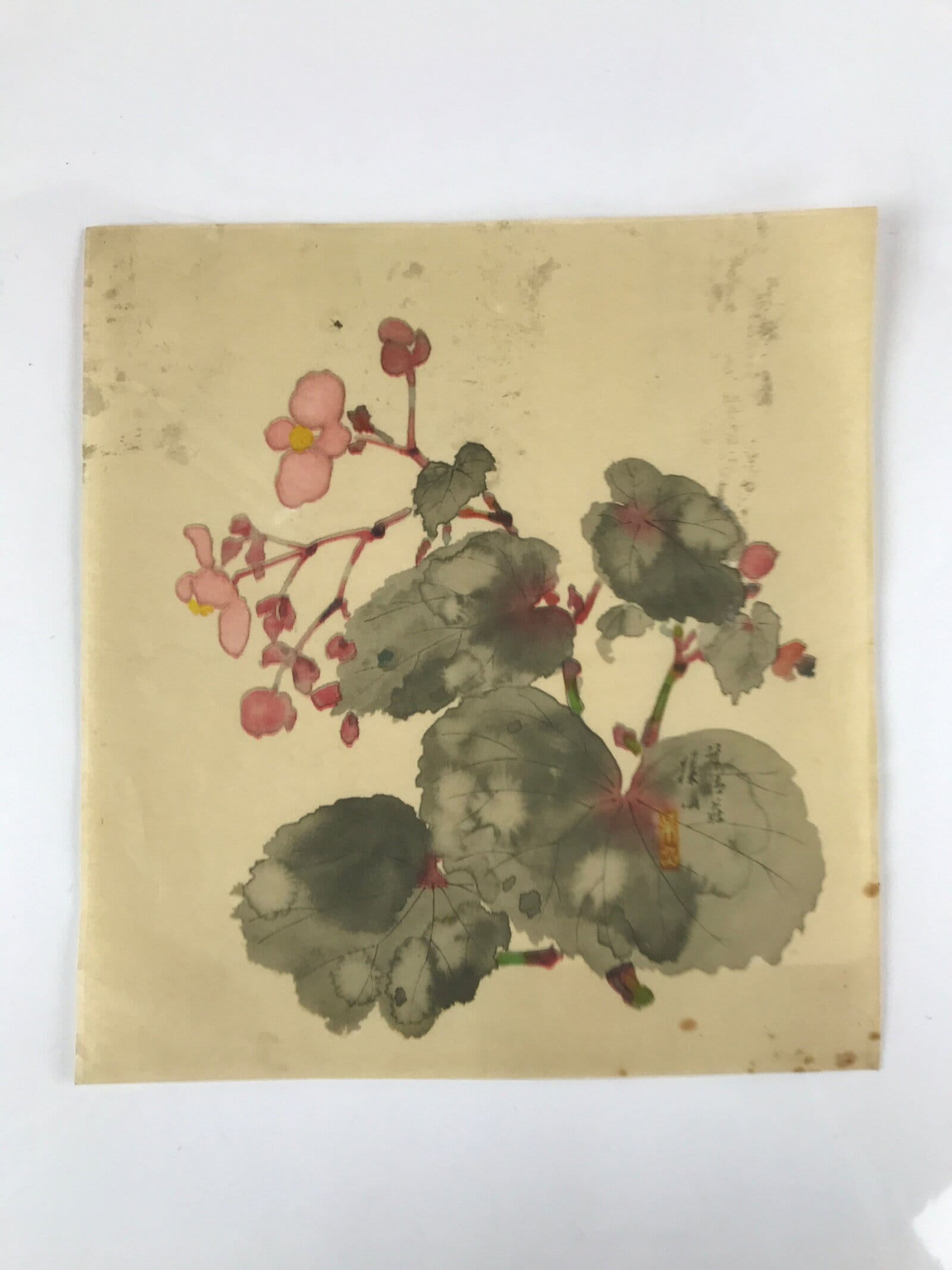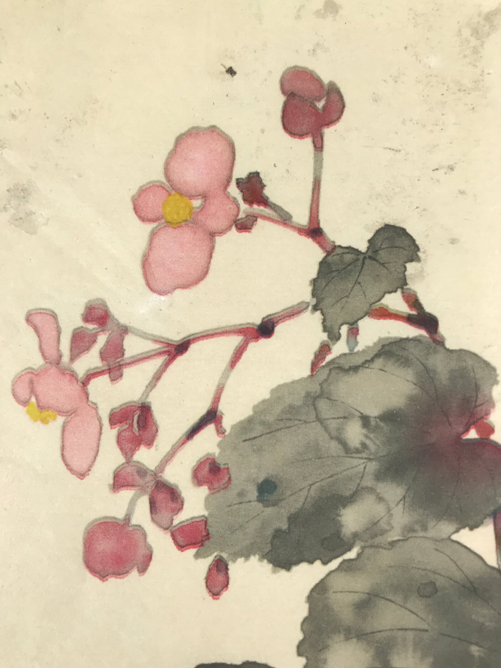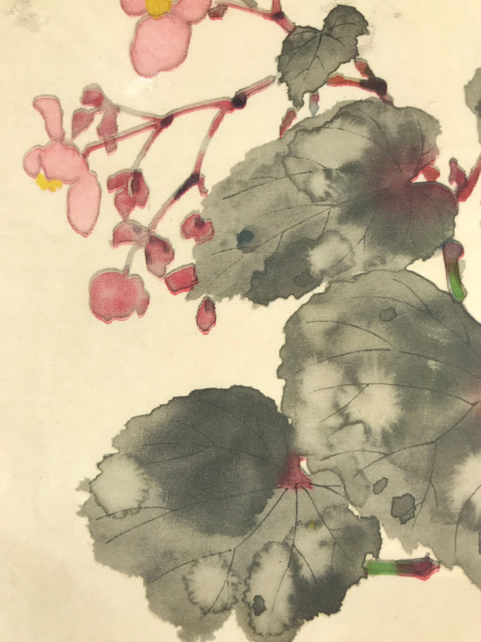 This is a vintage Japanese art reproduction featuring a picture of begonia flowers painted in pink and yellow with begonia leaves painted in gray and red. It is a simple yet dynamic composition.