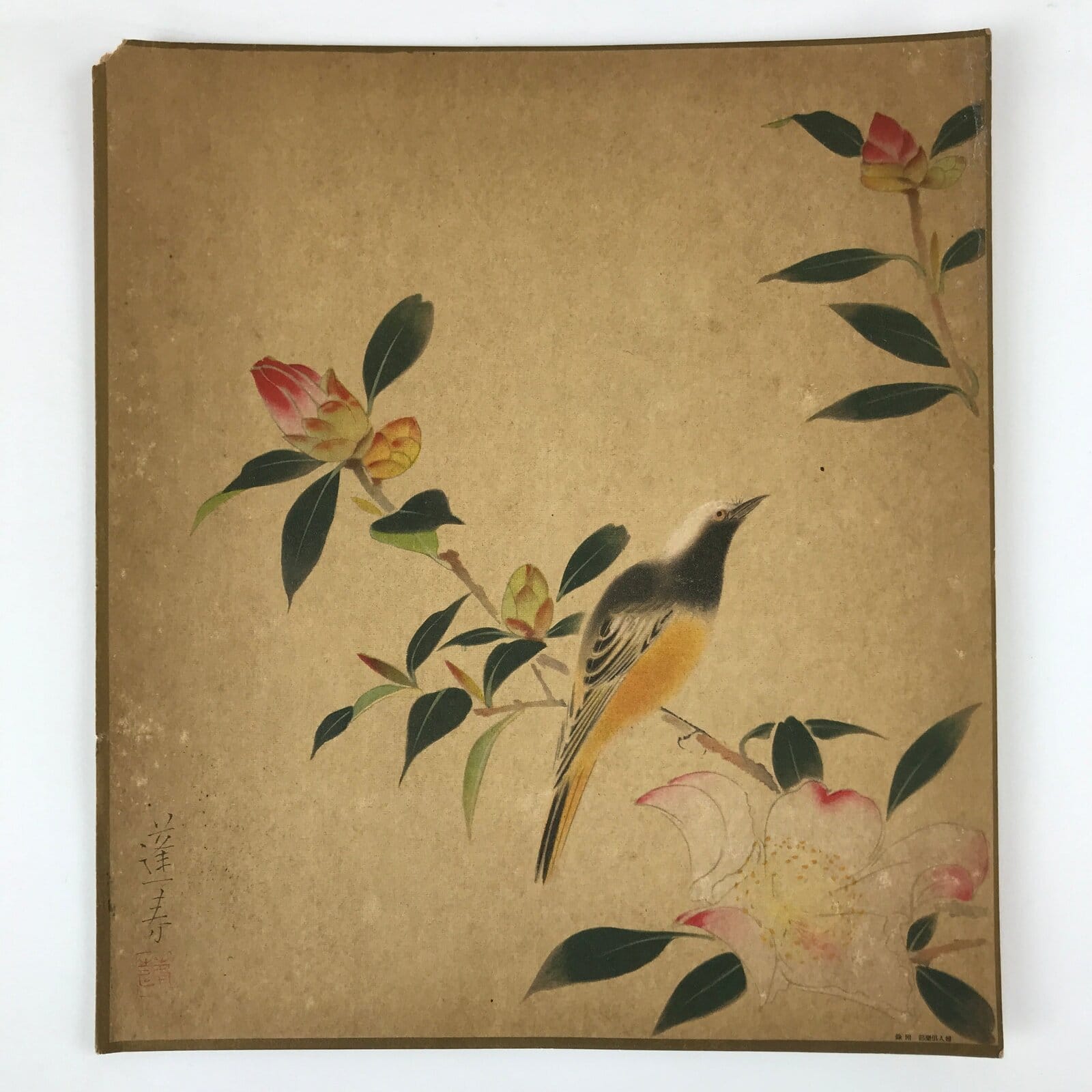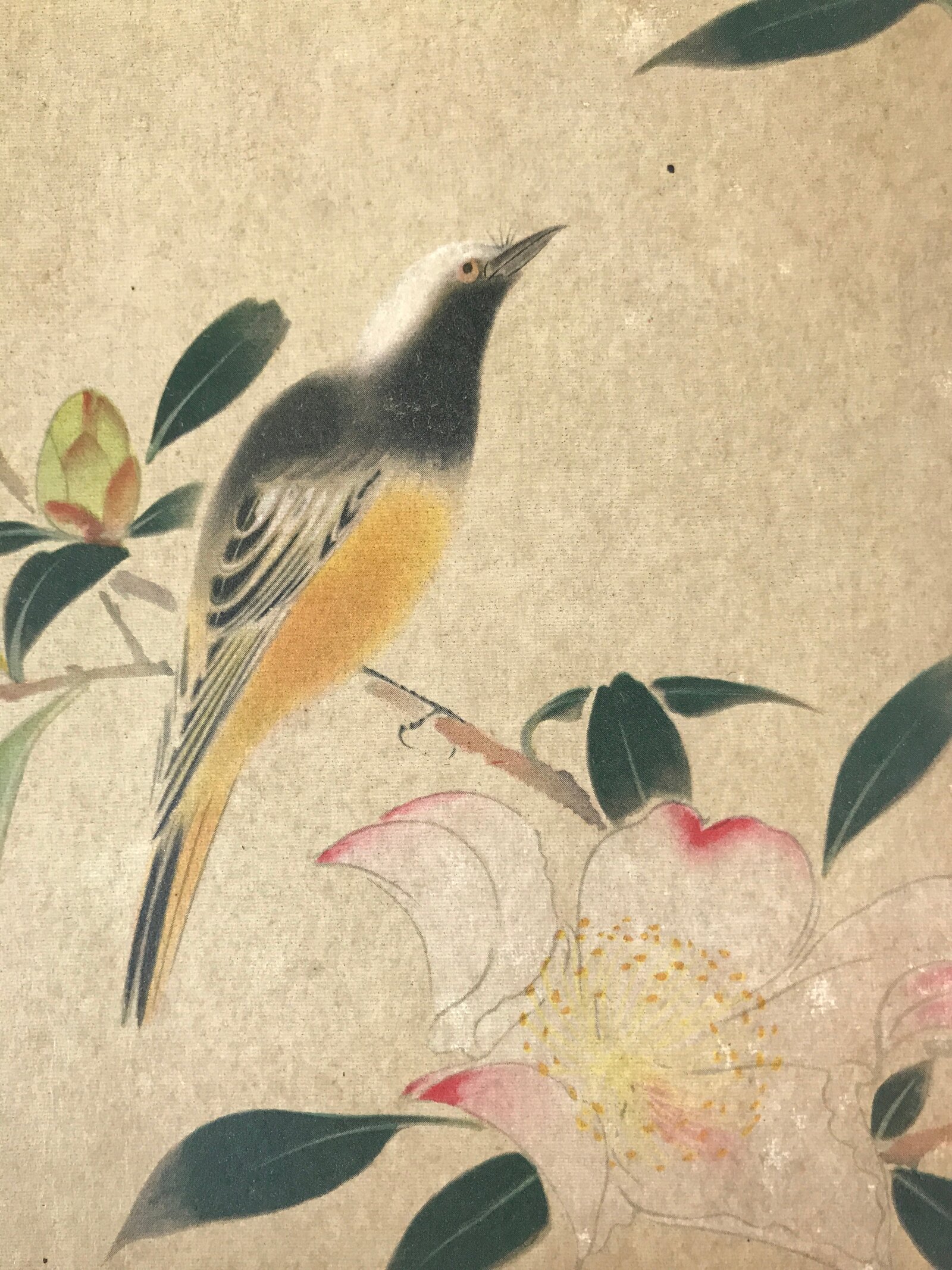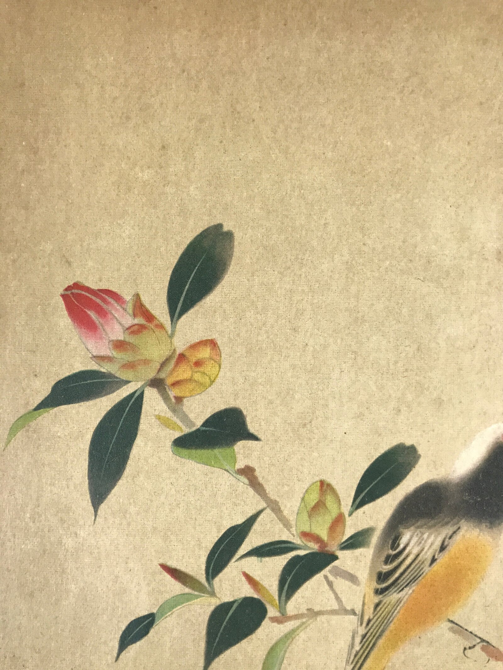 This is a vintage Japanese art reproduction by Japanese artist Hoshun Yamaguchi. It represents a bird on a camellia branch. This type of painting is called Kacho, literally flowers and birds.