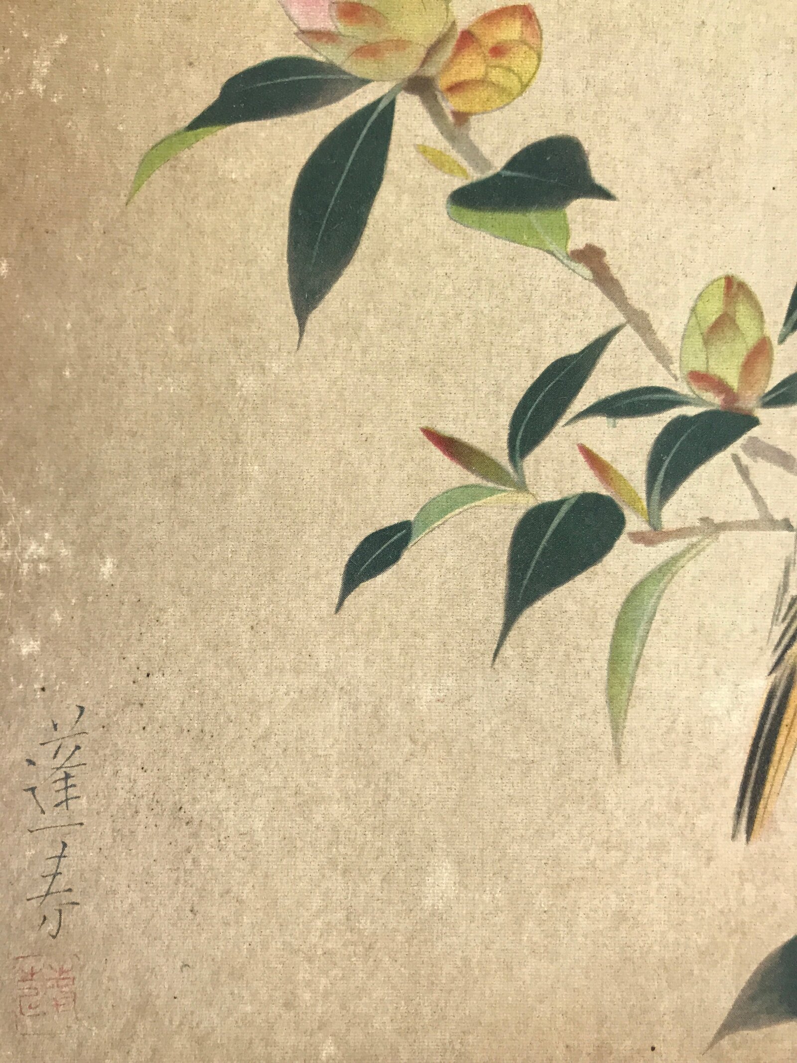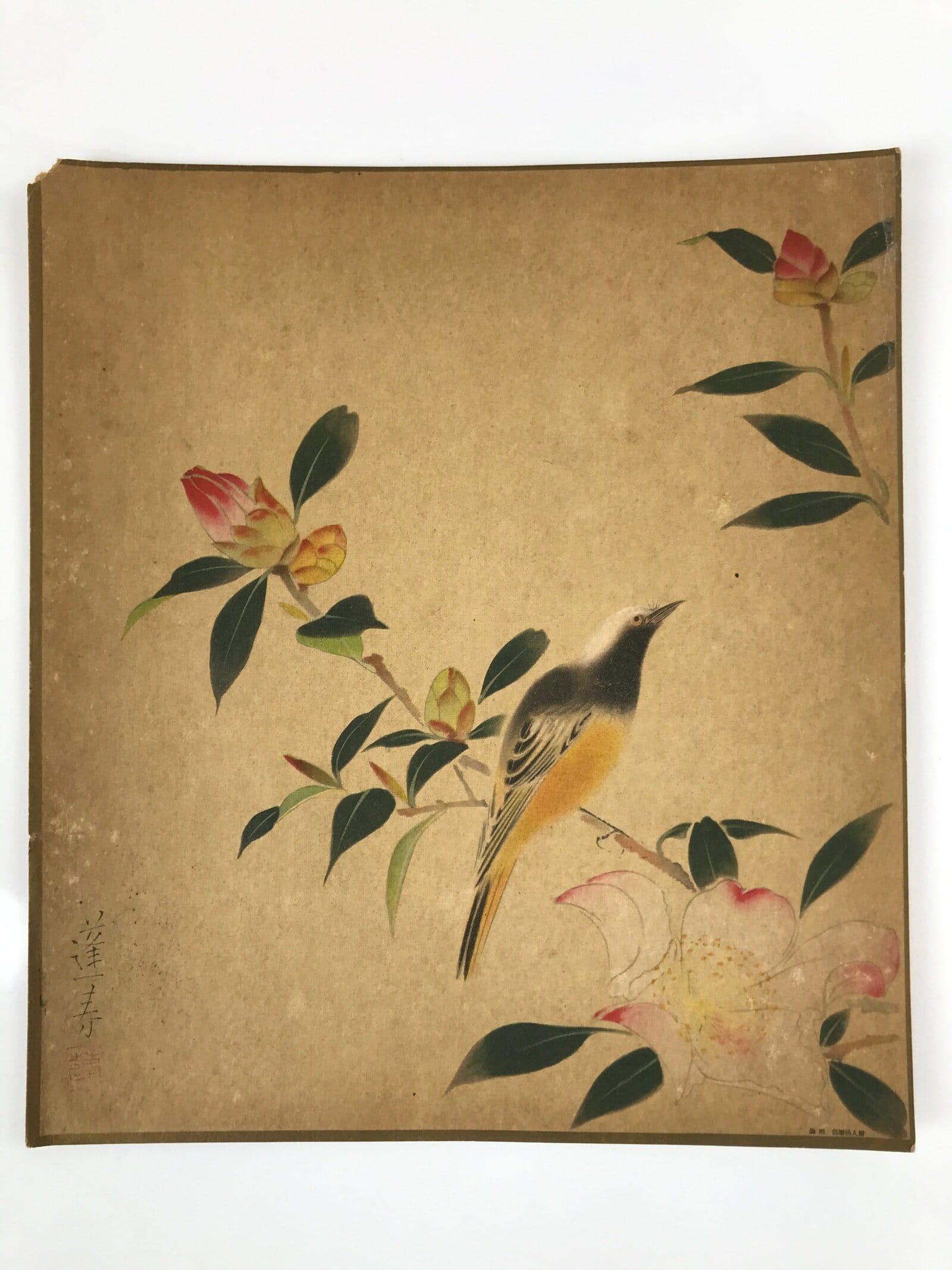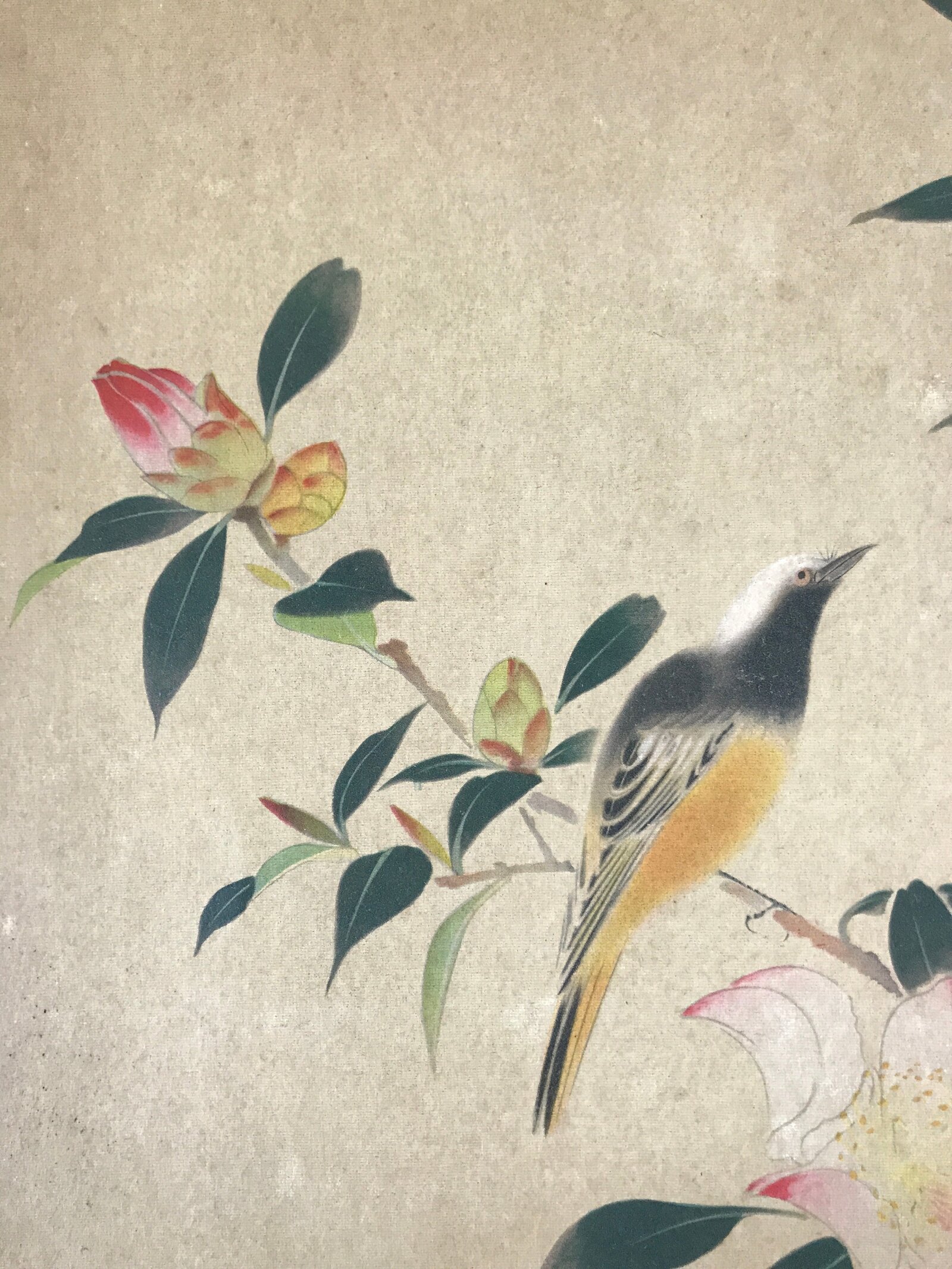 This is a vintage Japanese art reproduction by Japanese artist Hoshun Yamaguchi. It represents a bird on a camellia branch. This type of painting is called Kacho, literally flowers and birds.