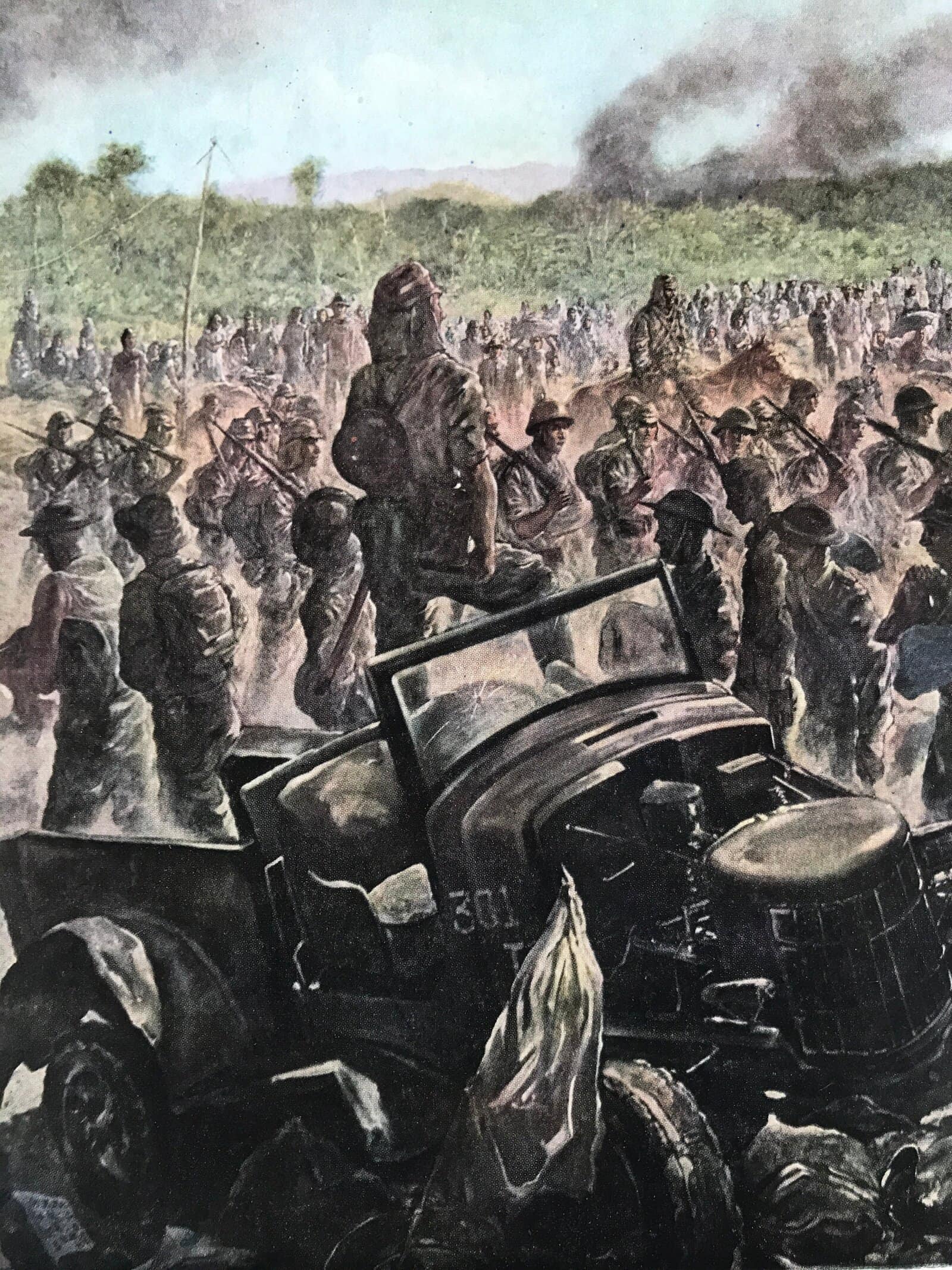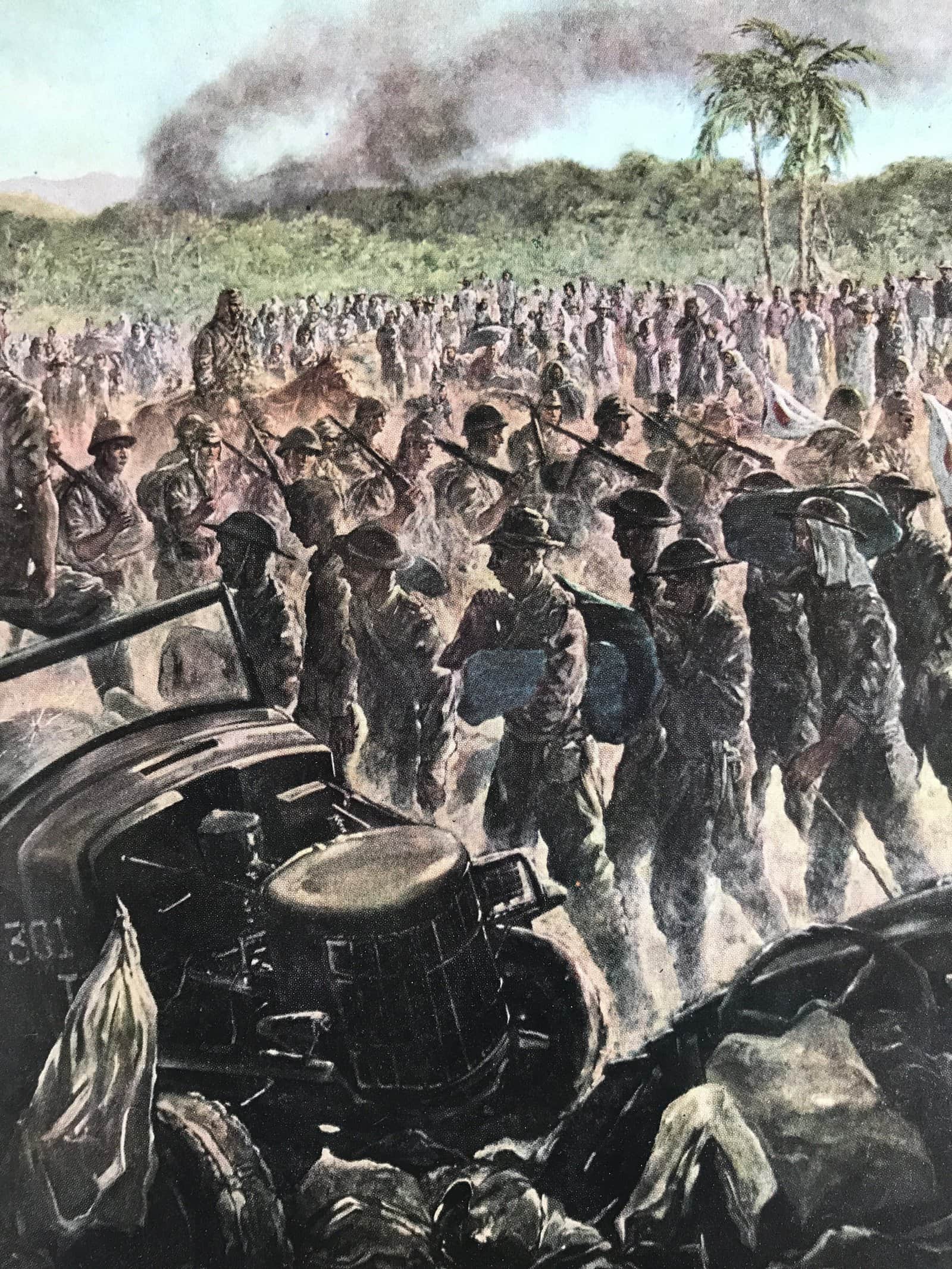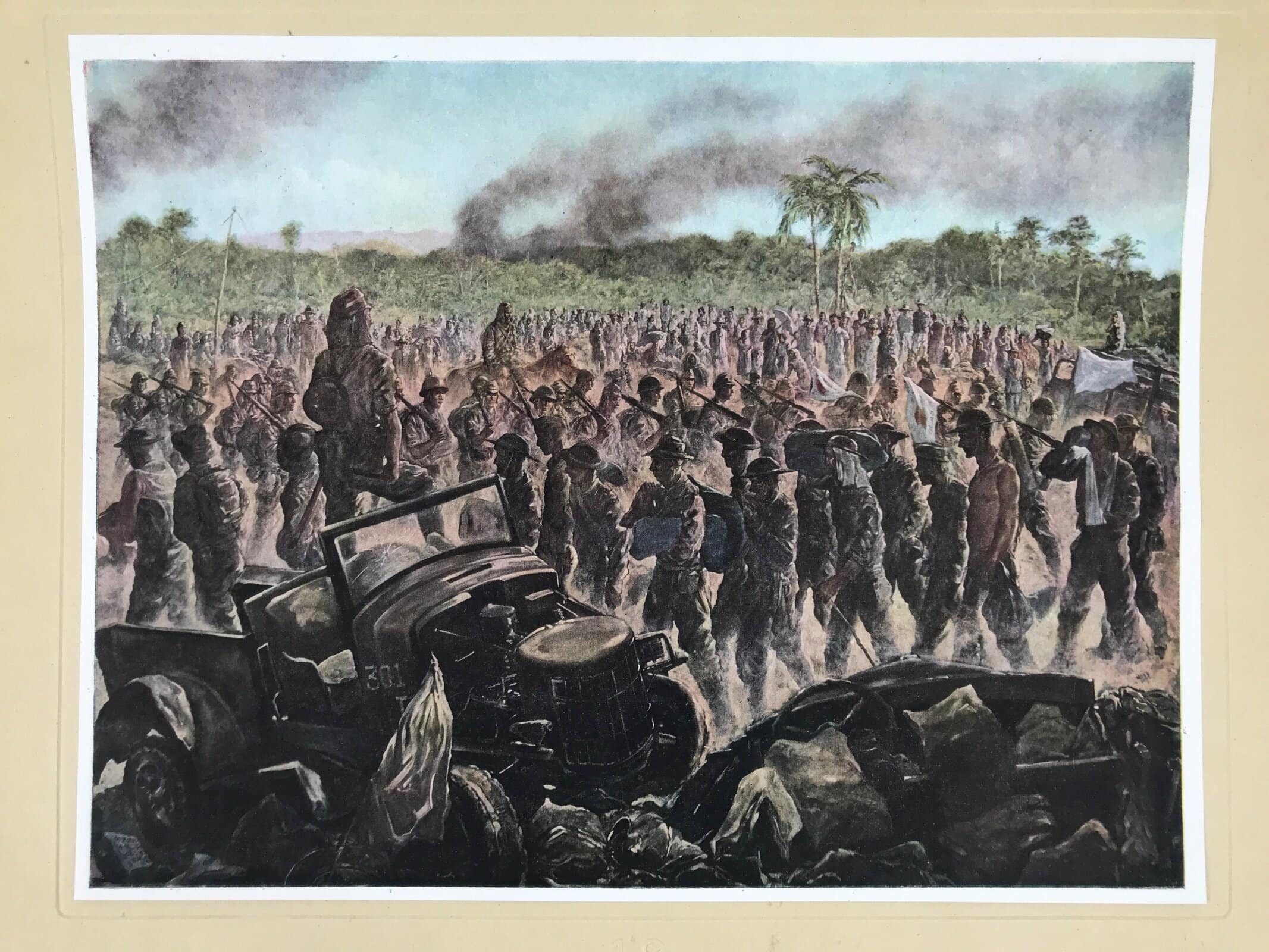 This is a vintage Japanese machine-printed reproduction of military art by Junkichi Mukai. The piece is called ‘Record of April 9’ and refers to the Fall of Bataan (1942, Apr. 9th). The piece is placed on a piece of cardboard with a protective sheet of paper on top, with explanations in Japanese.