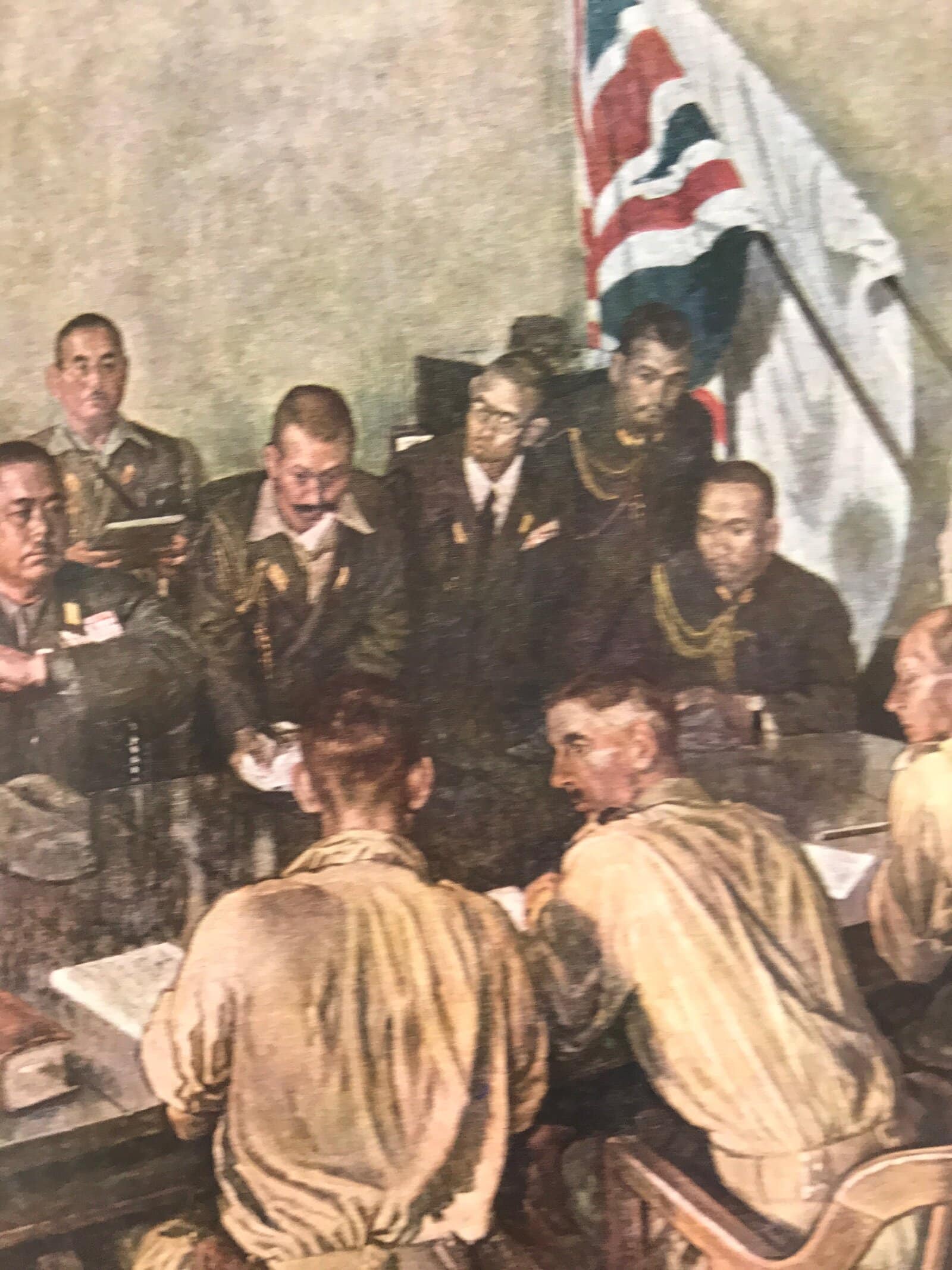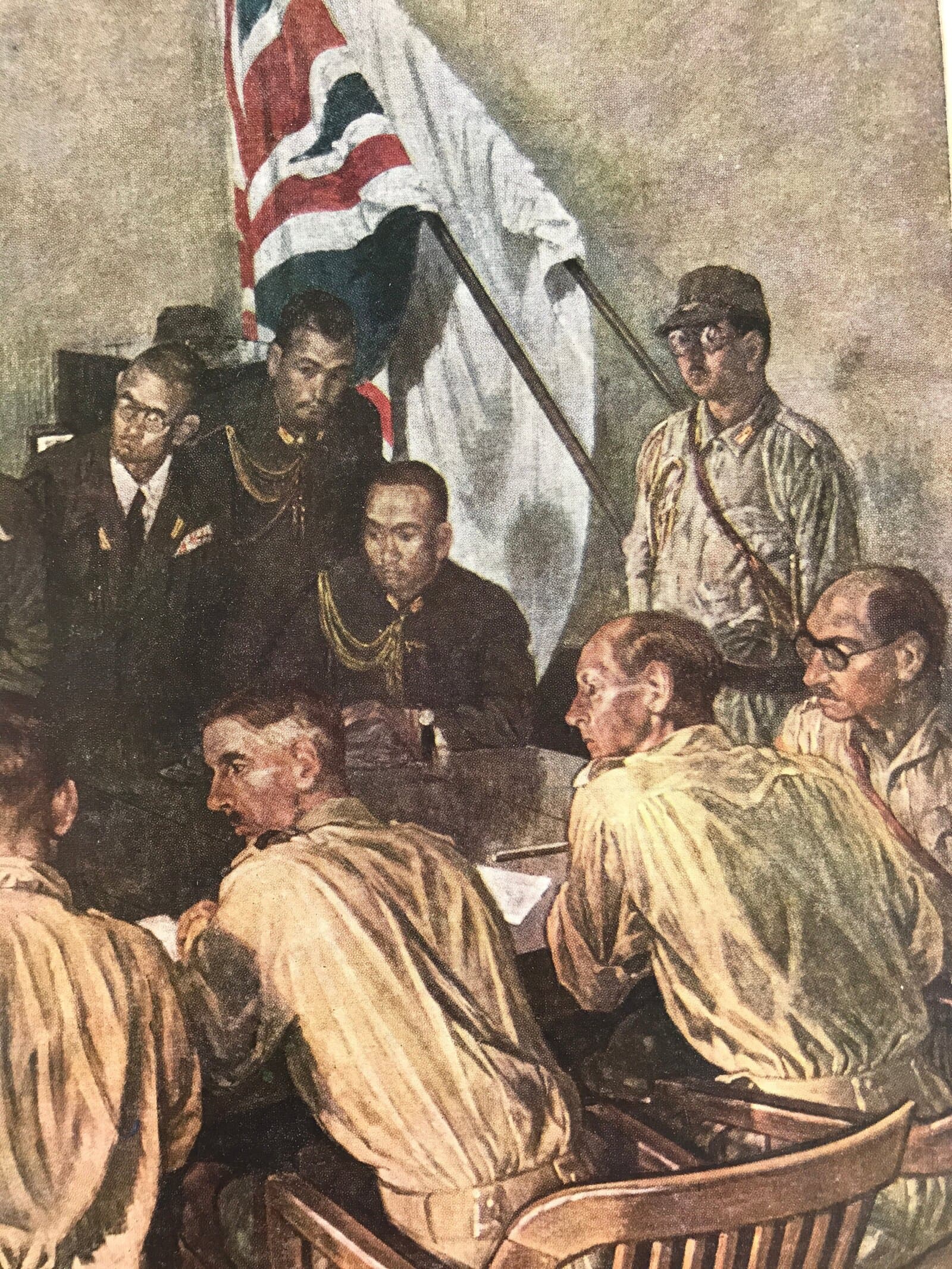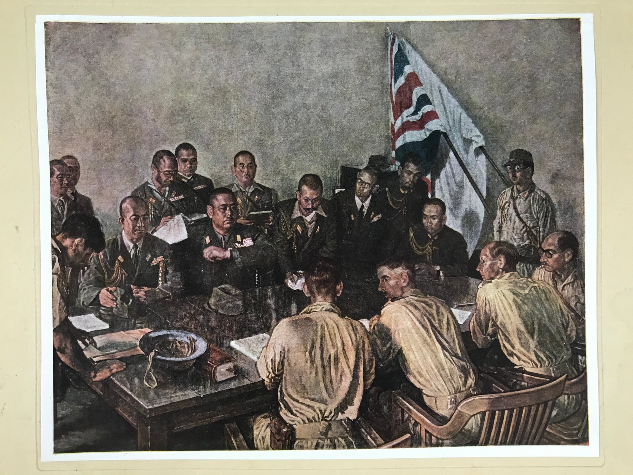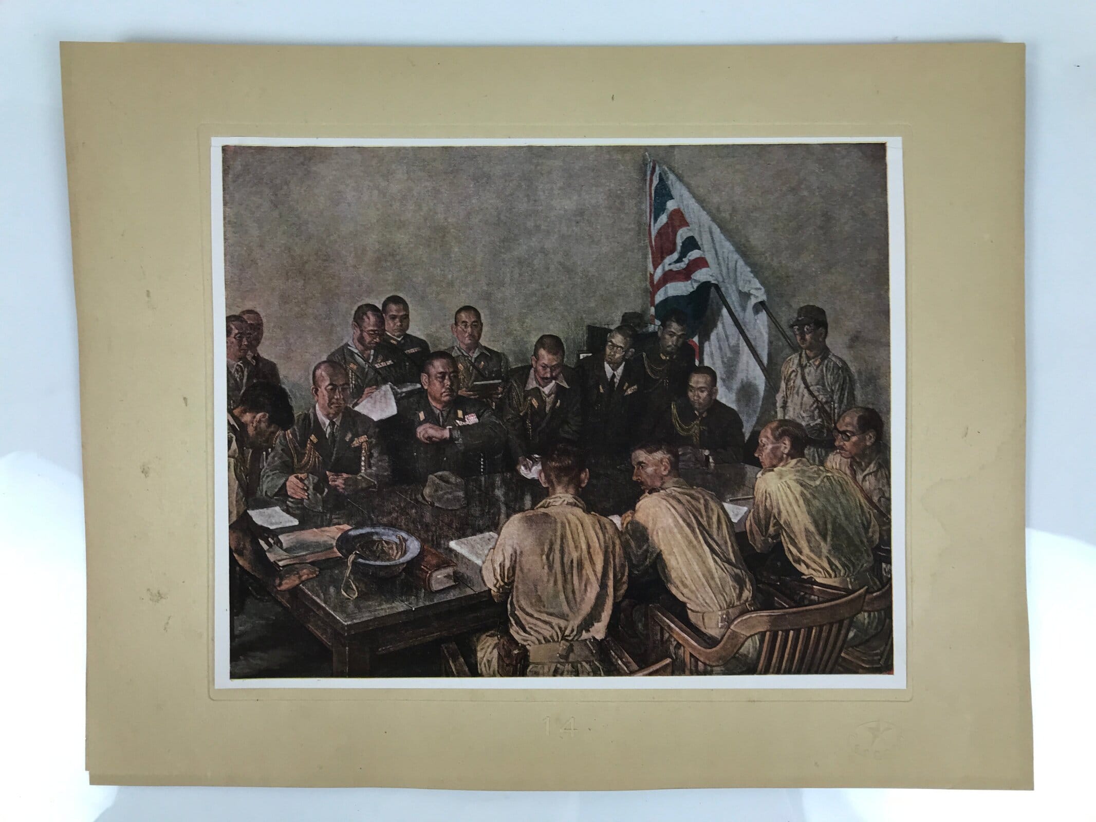 This is a vintage Japanese machine-printed reproduction of military art by Miyamoto Saburo. The piece is called ‘Meeting of Generals Yamashita and Percival’. It represents men meeting around the table in Singapore in 1942. The piece is placed on a piece of cardboard with a protective sheet of paper on top, with explanations in Japanese.