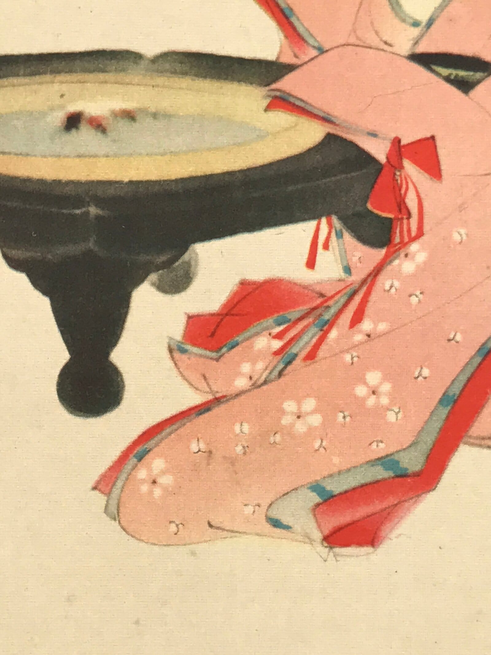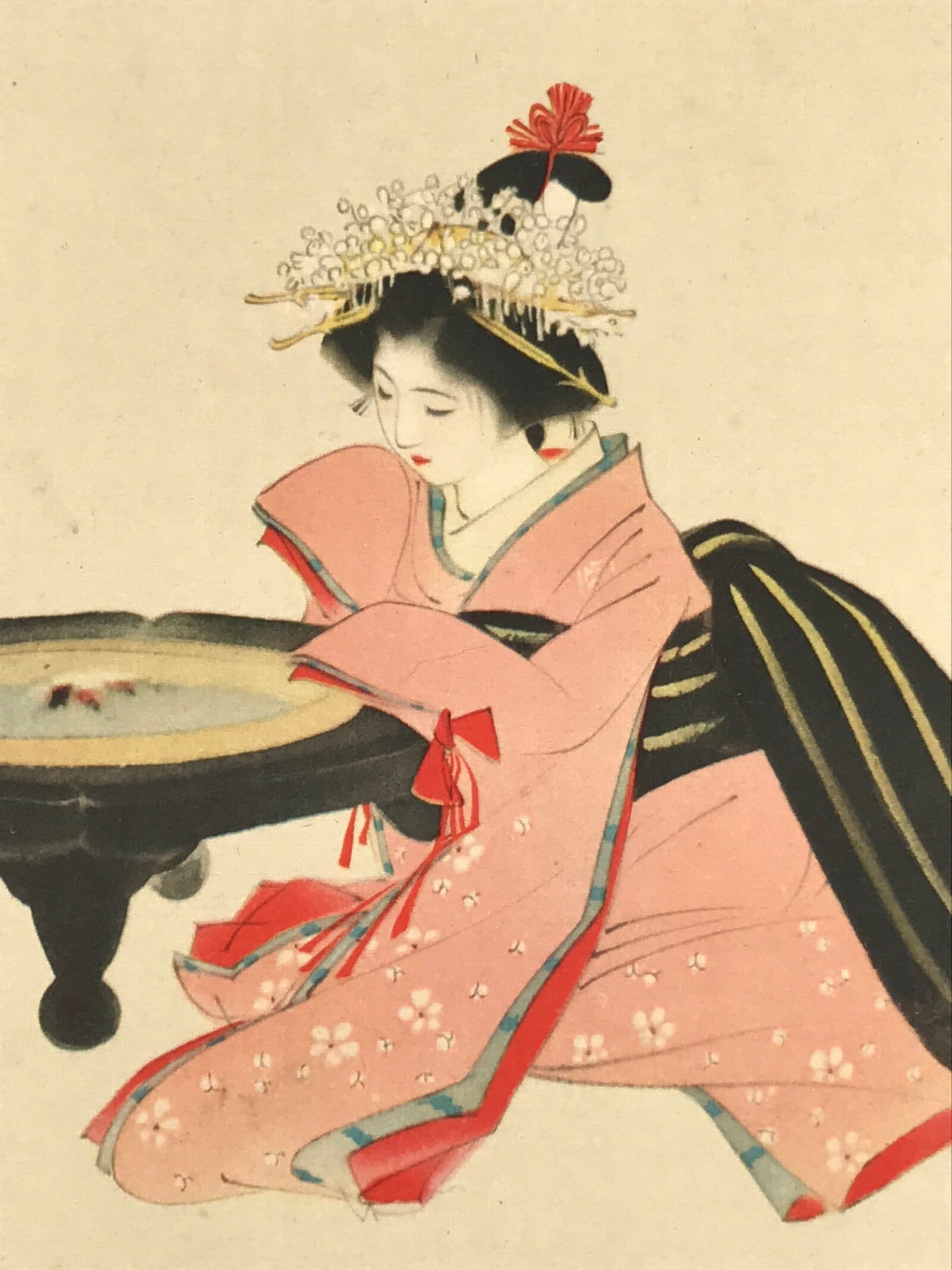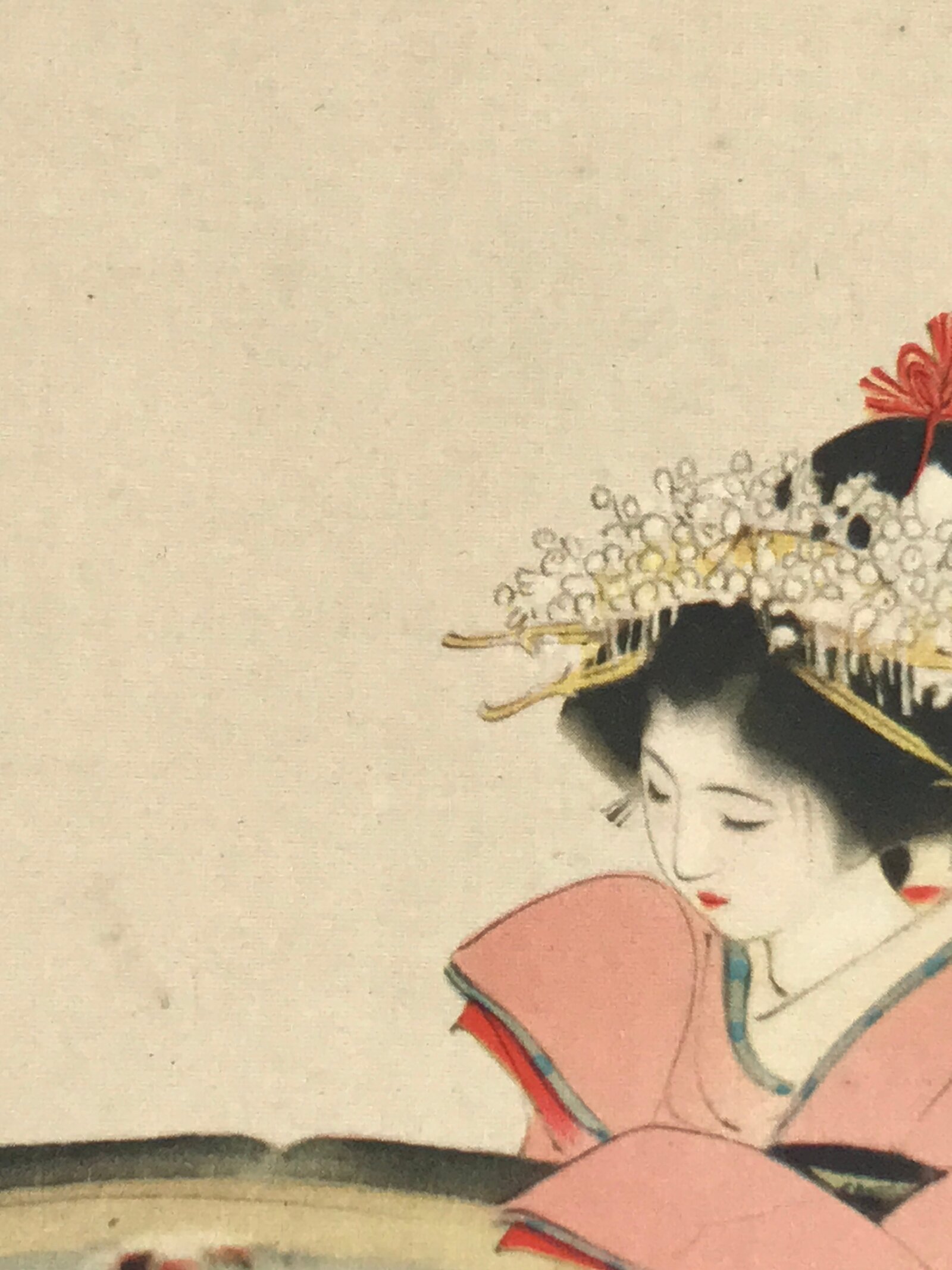 This is a vintage Japanese art reproduction of an artwork by Japanese artist Yamakawa Shuho called Kamuro. It represents a woman (probably an oiran) dressed in a pink kimono with a black obi belt. The woman is wearing a gorgeous headpiece and is looking at a table with burnt incense.