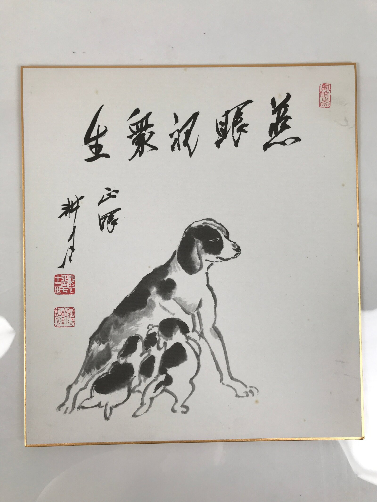 This Japanese shikishi art board features a printed reproduction of an artwork, likely by Tani Kogetsu, the head priest of the Myoshinji temple of the Rinzai Zen school in Japan. The artwork represents a dog nursing puppies. There is a calligraphy on the top, likely a Zen phrase. This shikishi is signed with names and red seals.