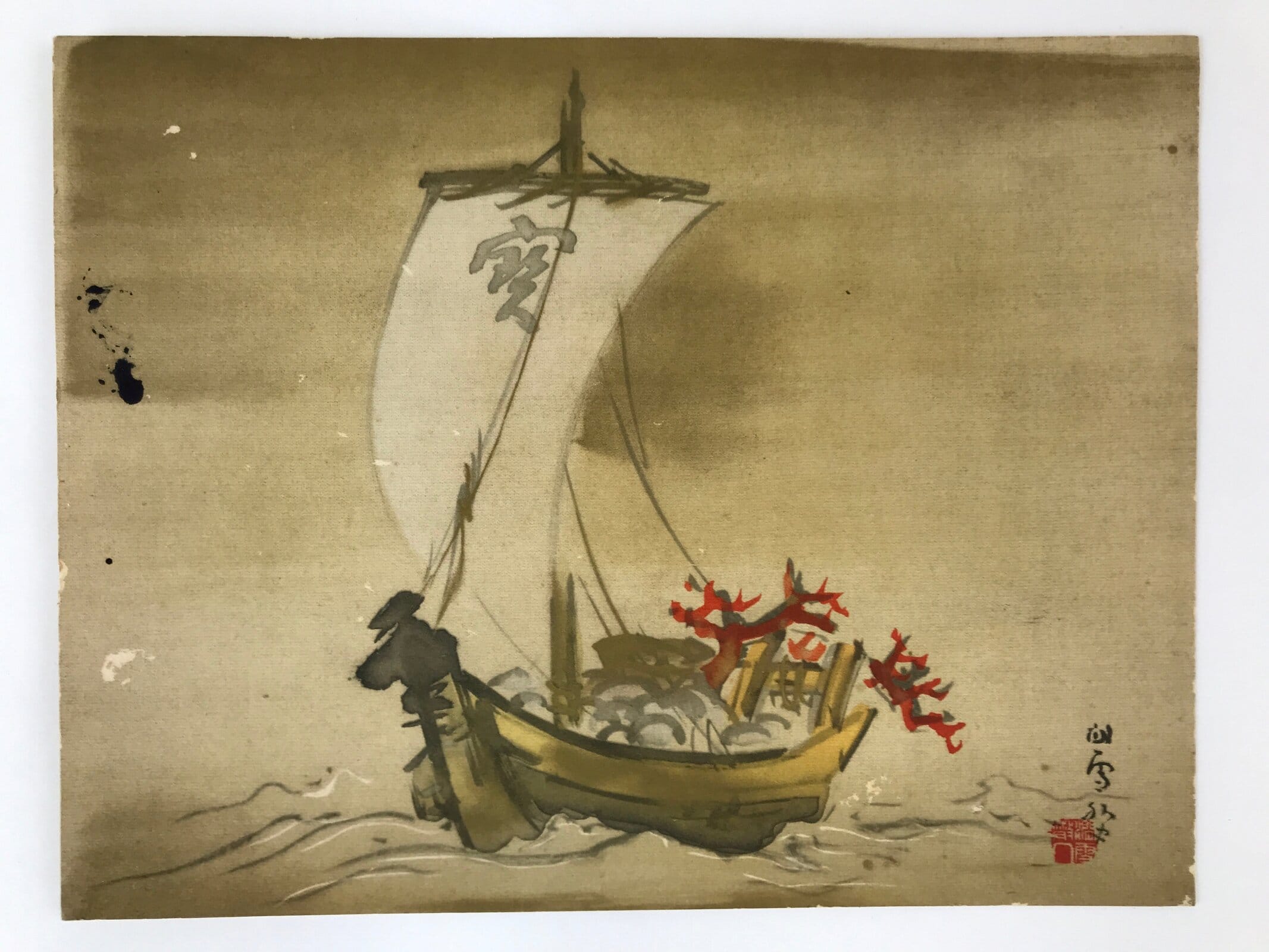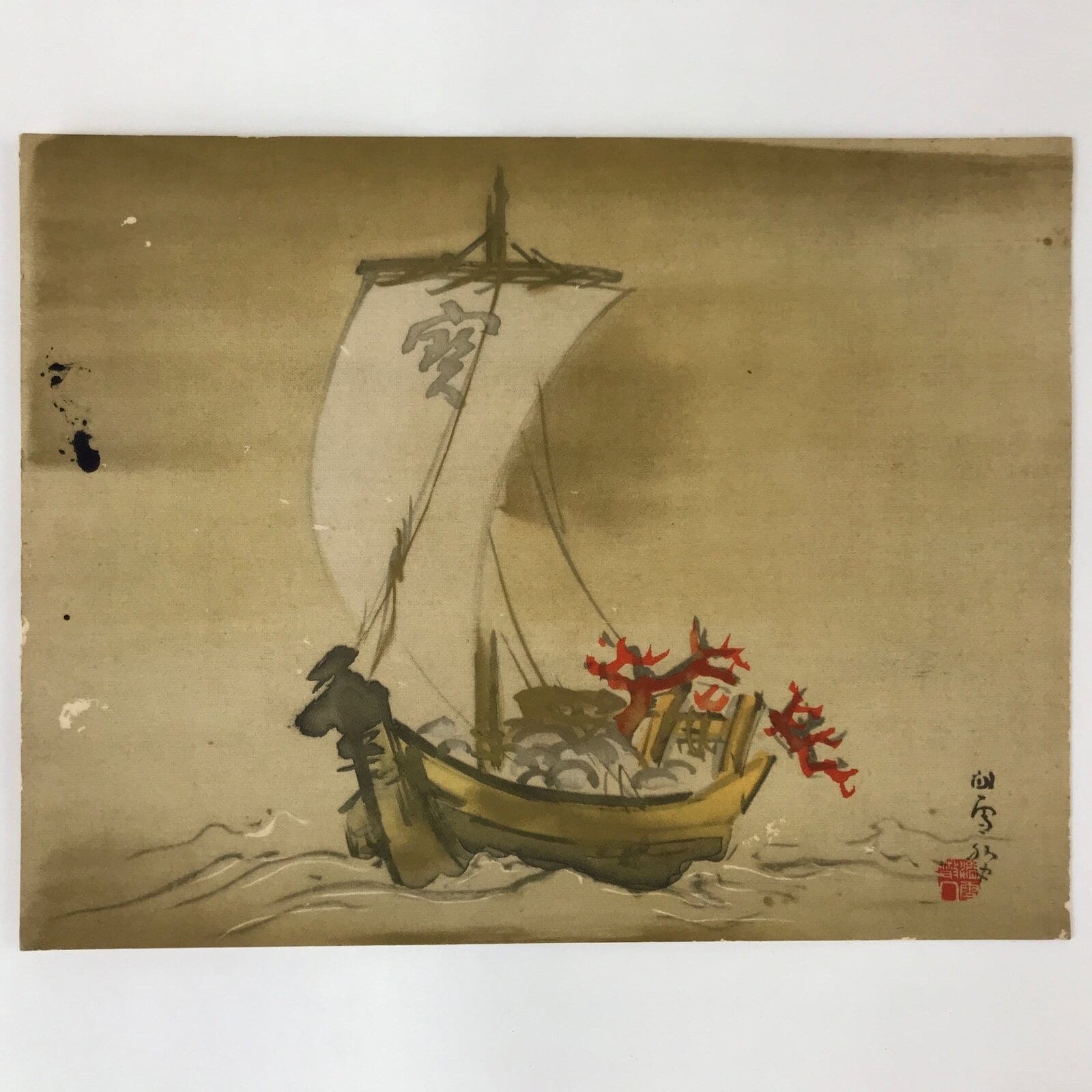 This item is Japanese shikishi art board. It is a printed reproduction of the artwork Takarabune (Treasure Ship) by artist Hashimoto Kansetsu. It represents a sailing ship loaded with goods. There is a Japanese character on the white sail of the ship. Takarabune is the ship of the Seven Lucky Gods.