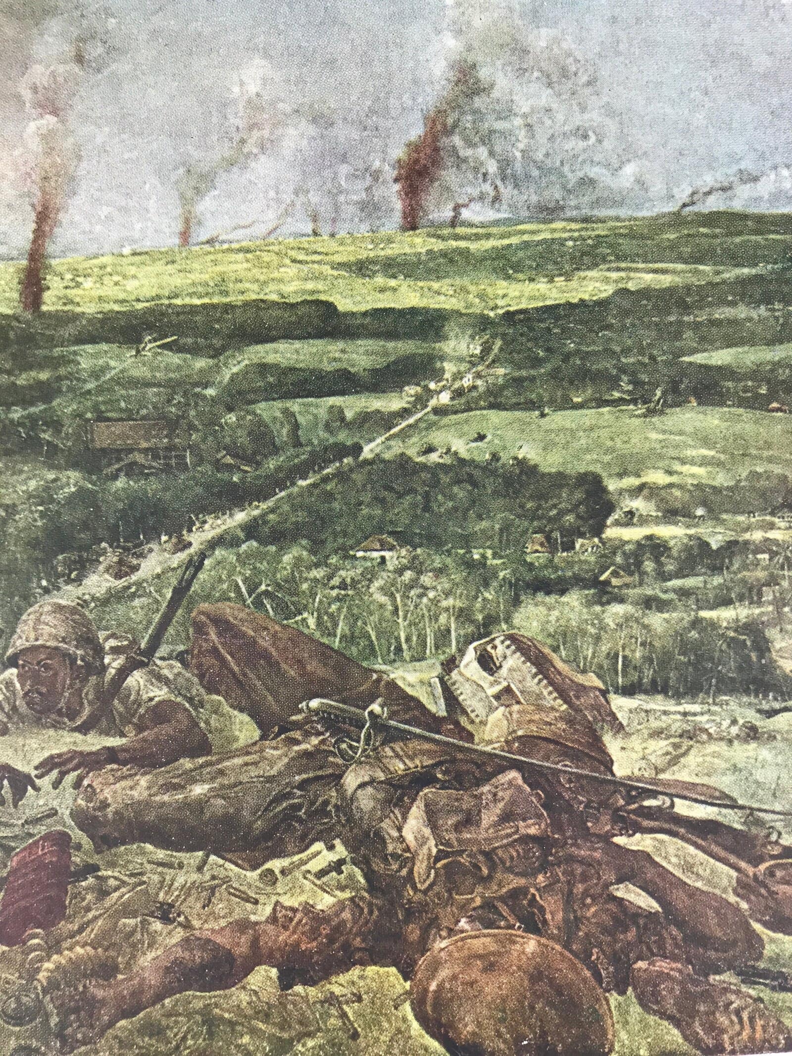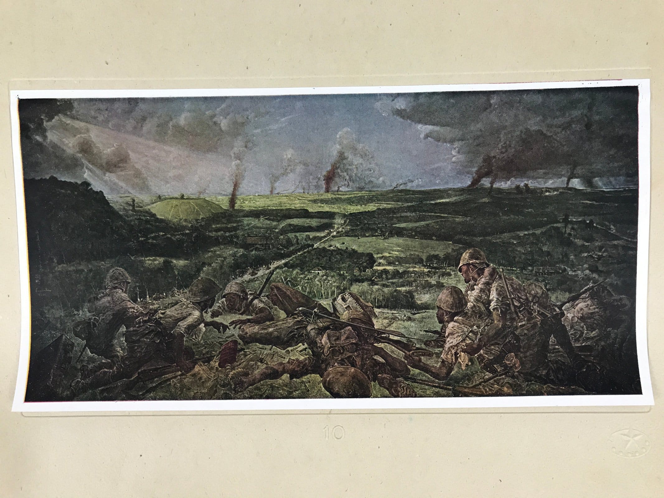 This is a vintage Japanese machine-printed reproduction of military art by Fujita Tsuguharu, also known as Léonard Tsuguharu Foujita. The piece is called ‘Last Day in Singapore (Bukit Timah)’. The Battle of Singapore took place in 1942. The piece is placed on a piece of cardboard with a protective sheet of paper on top, with explanations in Japanese.