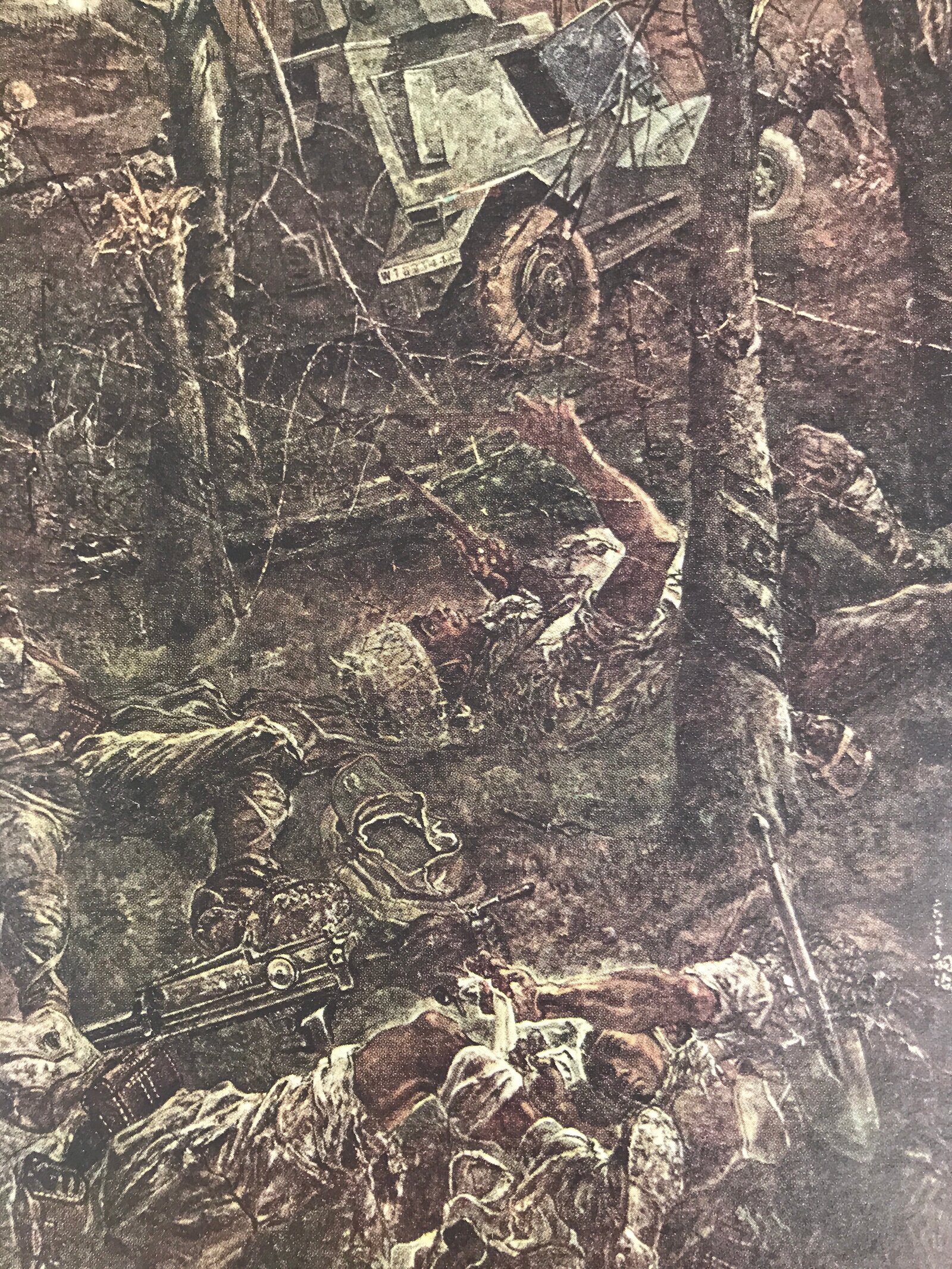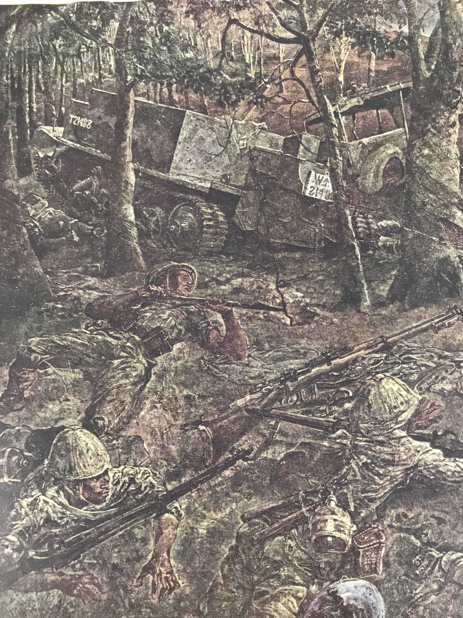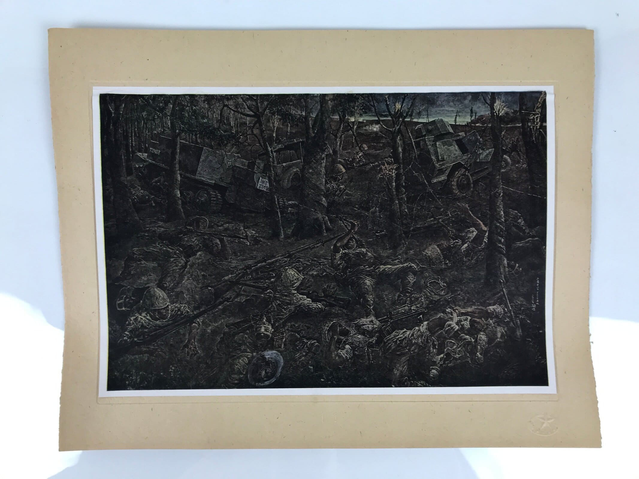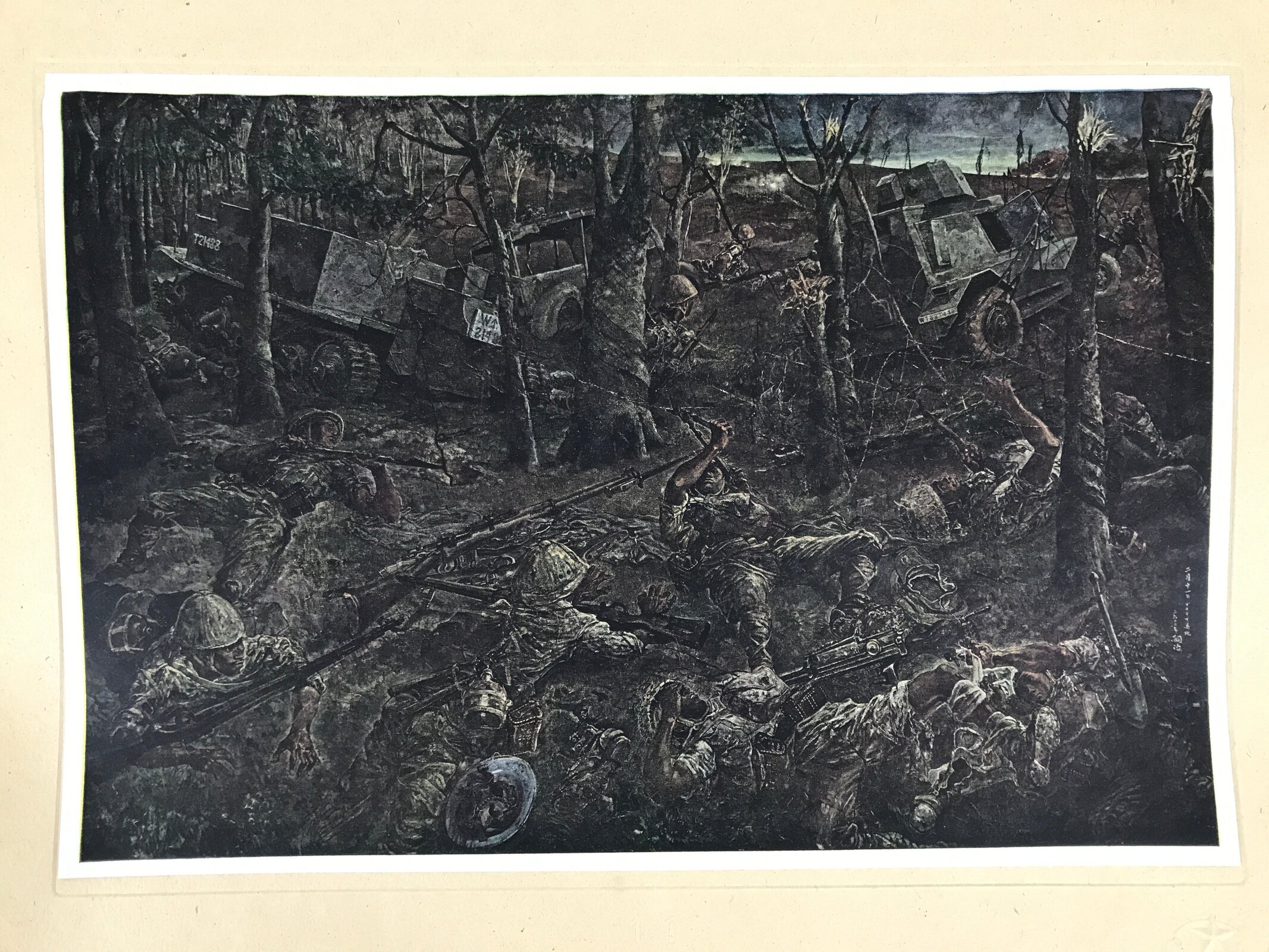 This is a vintage Japanese machine-printed reproduction of military art by Fujita Tsuguharu, also known as Léonard Tsuguharu Foujita. The piece is called ‘February 11st (Bukit Timah highland)’. The Battle of Singapore took place in 1942. The piece is placed on a piece of cardboard with a protective sheet of paper on top, with explanations in Japanese.