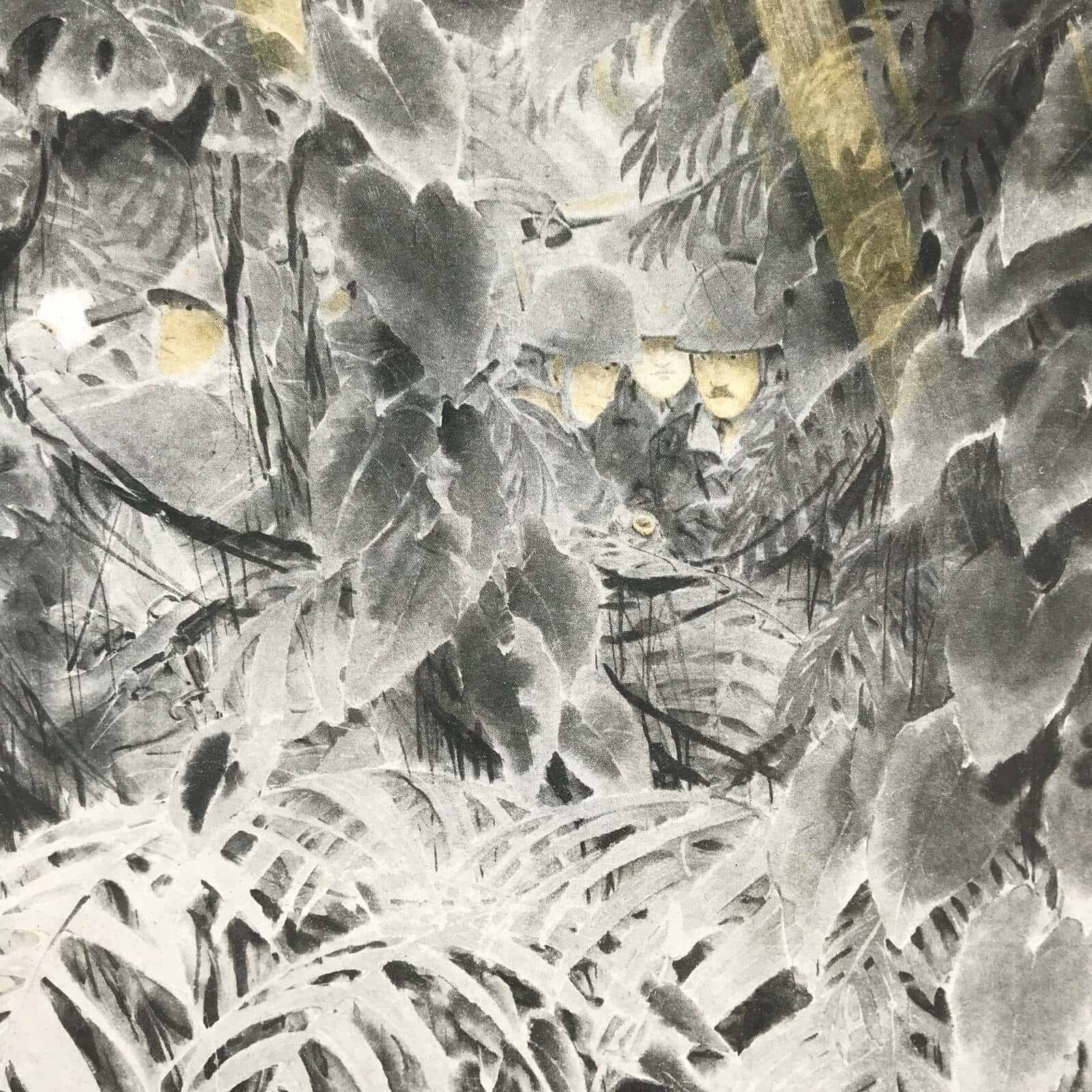 This is a vintage Japanese machine-printed reproduction of military art by Kawabata Ryushi. The piece is called ‘The thorn jungle challenge’. It represents soldiers in the jungle. The piece is placed on a piece of cardboard with a protective sheet of paper on top, with the title and the name of the painter.