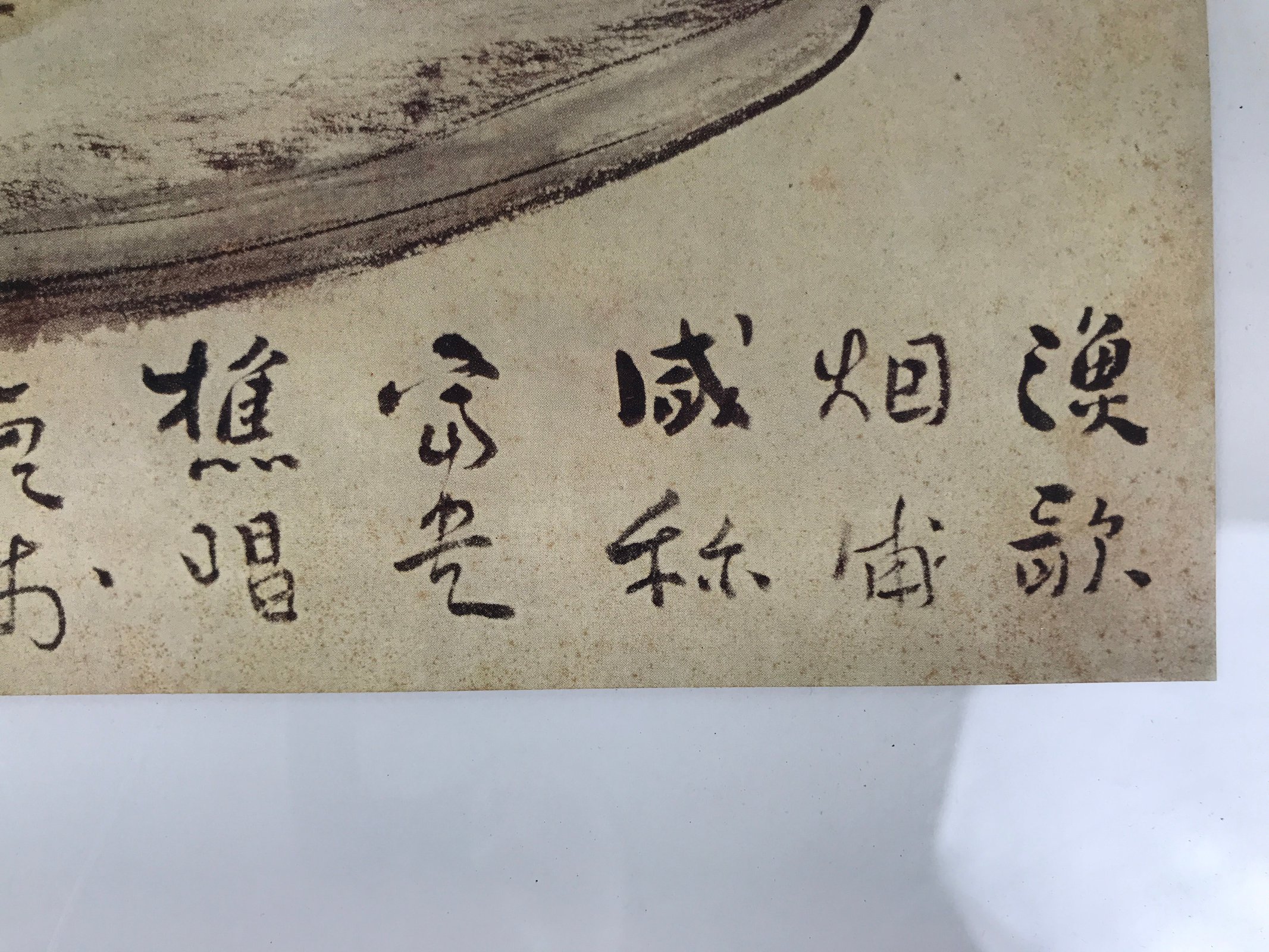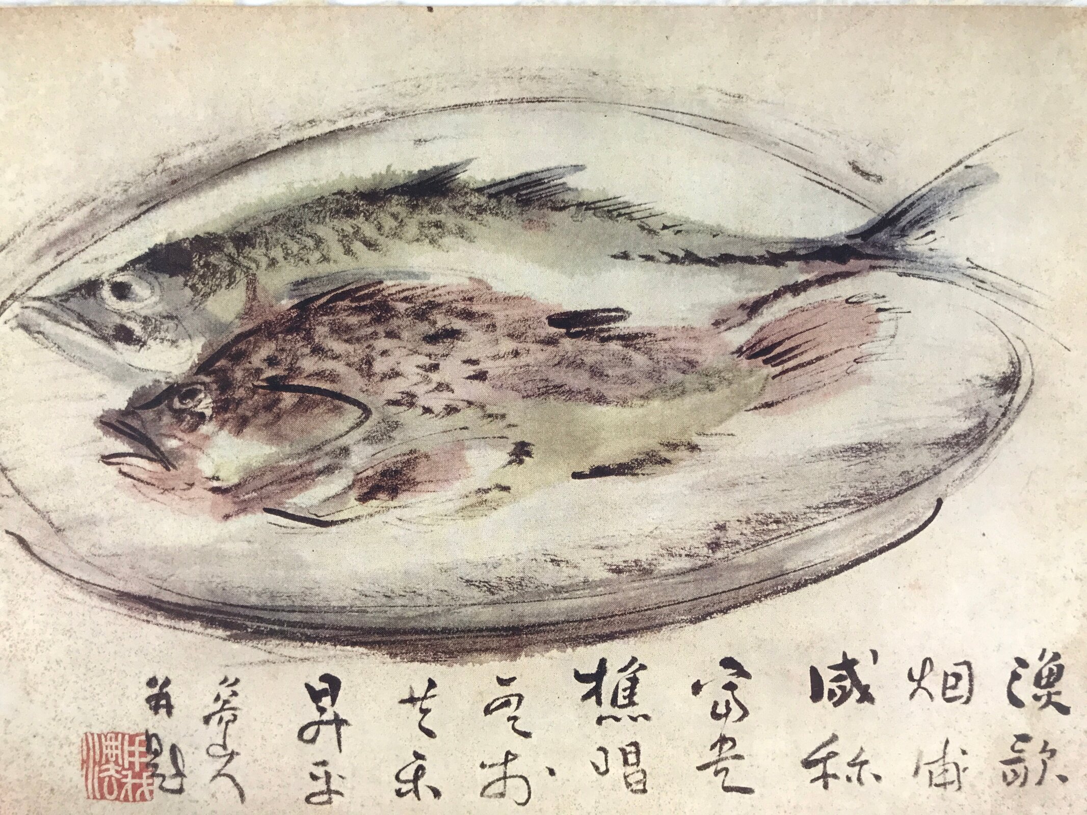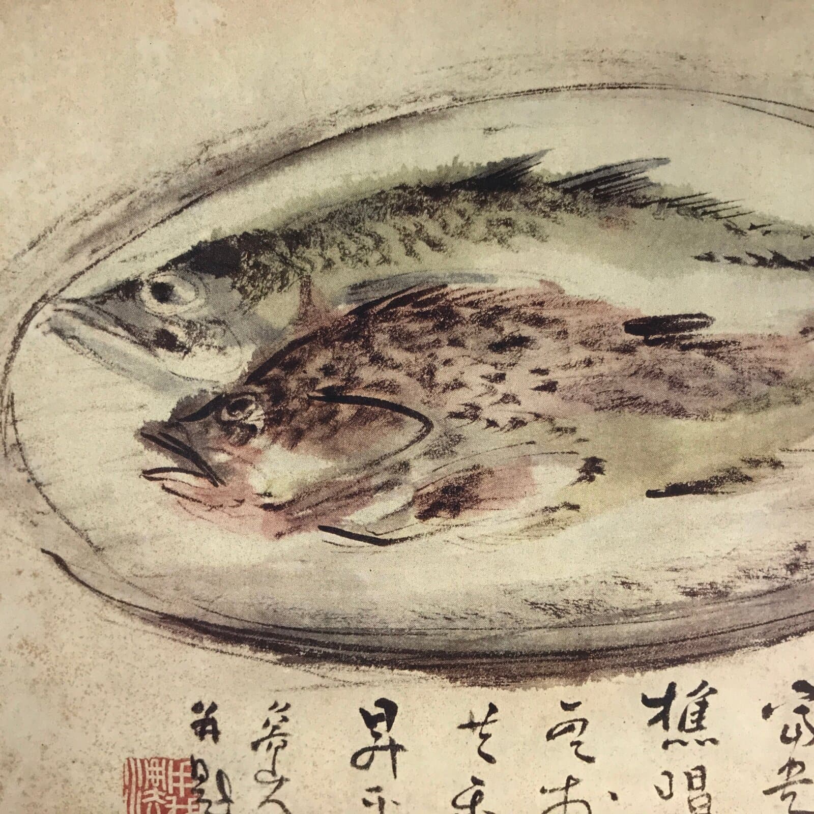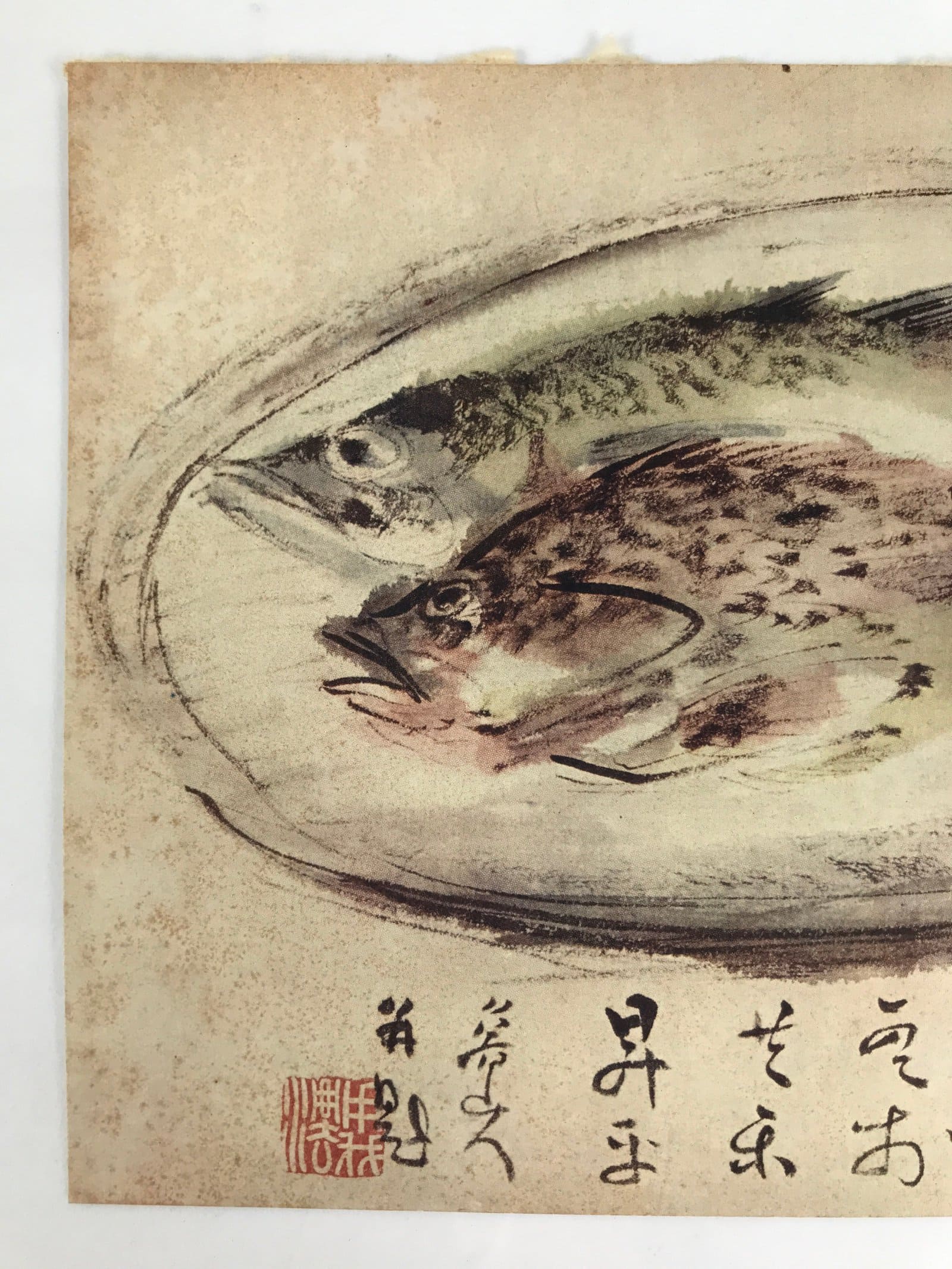 This Japanese art print reproduction features two fish placed on a plate. There is a calligraphy on the bottom, likely a poem. This is a reproduction of an original artwork by, possibly, Kitaoji Rosanji. This reproduction is in color.