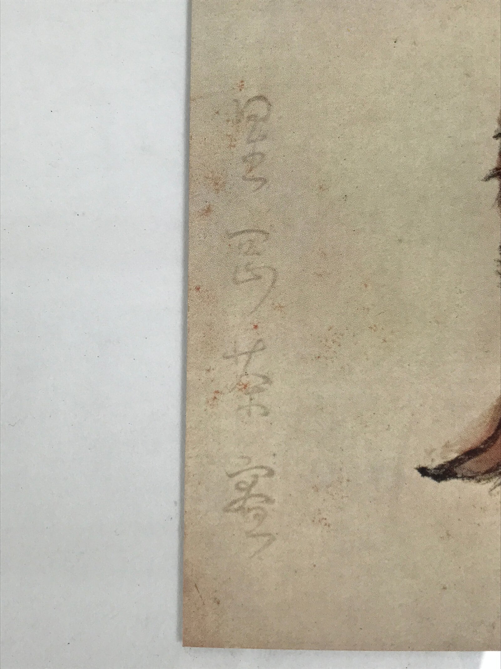 - Good condition considering age. Paper missing on the bottom right corner. Damage(?) on the back. The red tiny stains are printed. Wear and tear due to age. Please see the photos.
