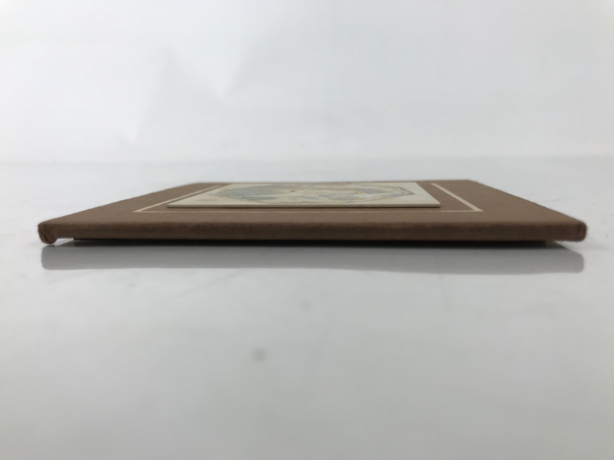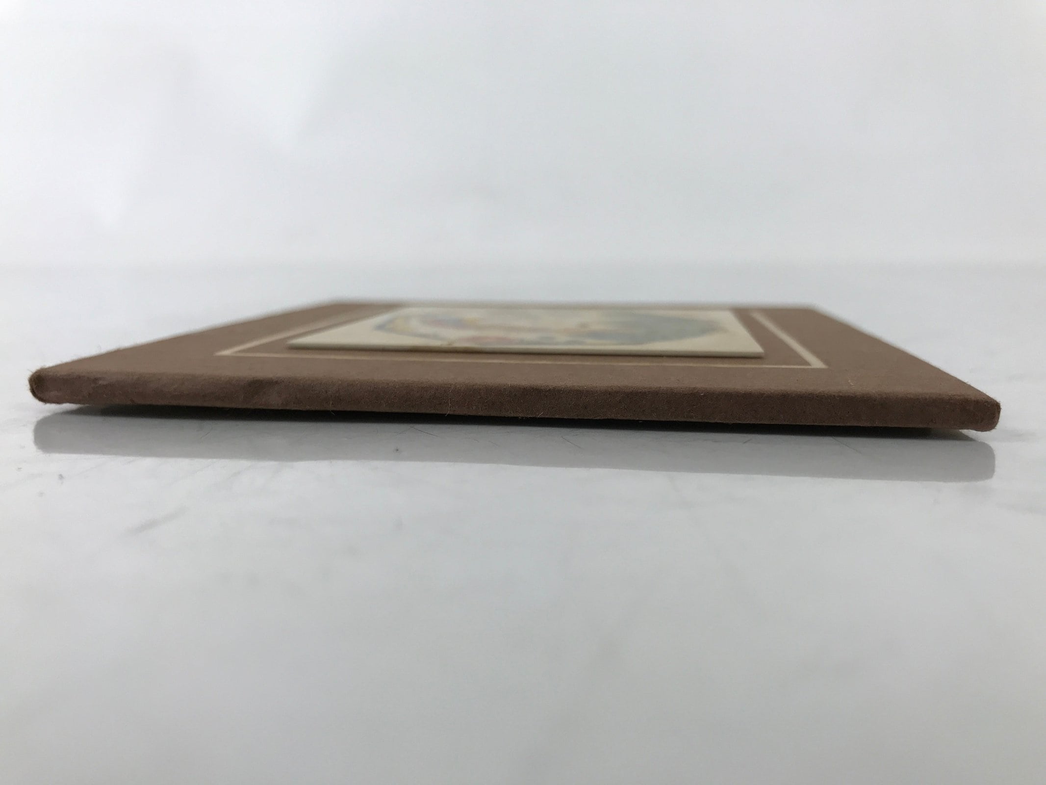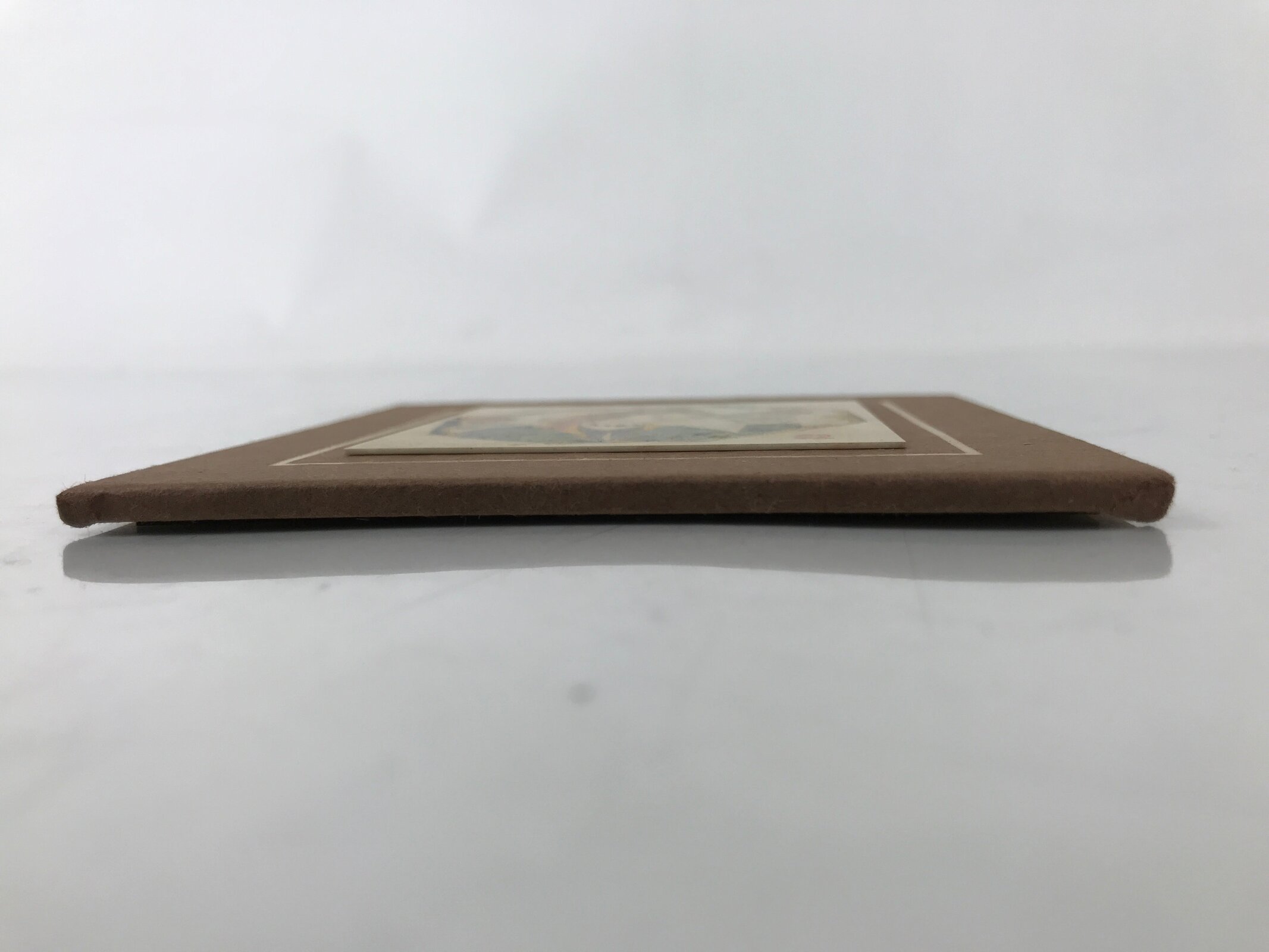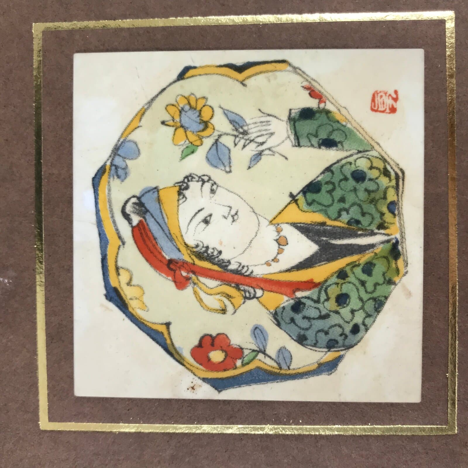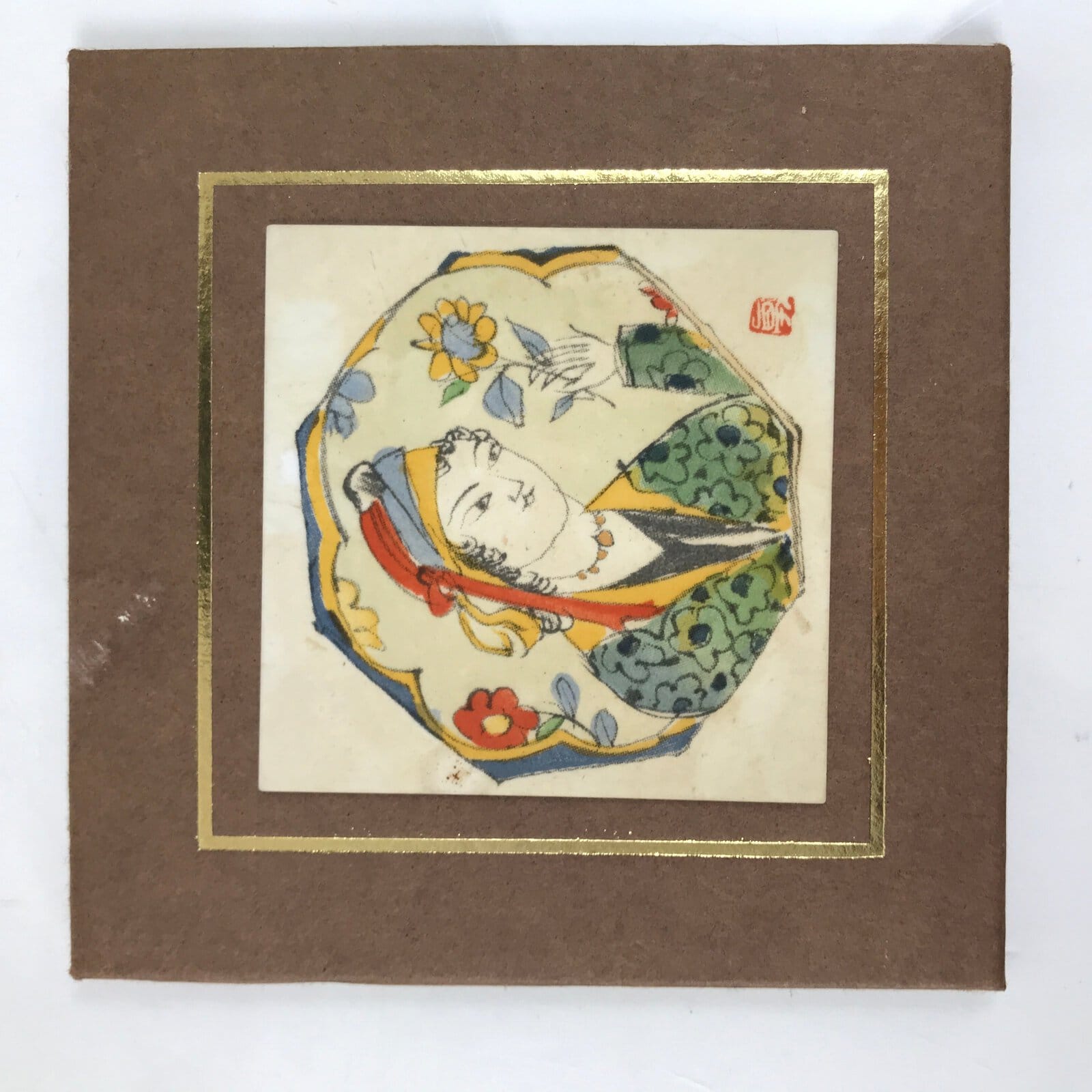 This vintage Japanese mini shikishi art board features a reproduction of an artwork called Persian princess holding a flower by Japanese artist Takuo Kato. It is a small and delicate colored illustration, pasted on a brown cardboard paper.