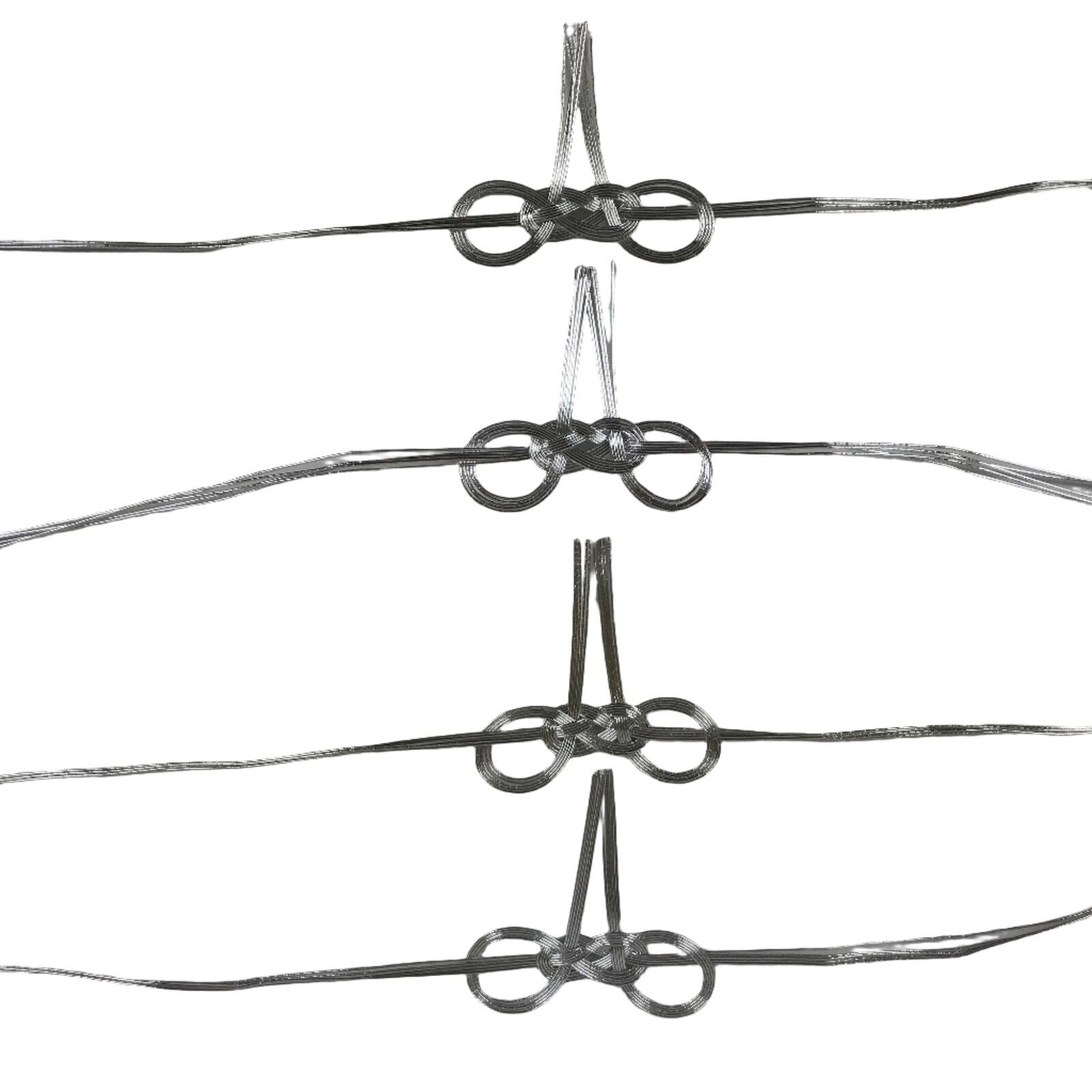 This item is a set of four ceremonial awaji-musubi knots in silver. These mizuhiki knots are commonly seen on gifts in numerous circumstances, such as funerals, weddings, and other congratulatory moments. Awaji-musubi style in particular is meant for one-time occasions. Silver (like these), black, and or white are universally used only for funerals with some regional differences. The tails of the knot are typically faced upward. They are made of stiff washi paper cord.