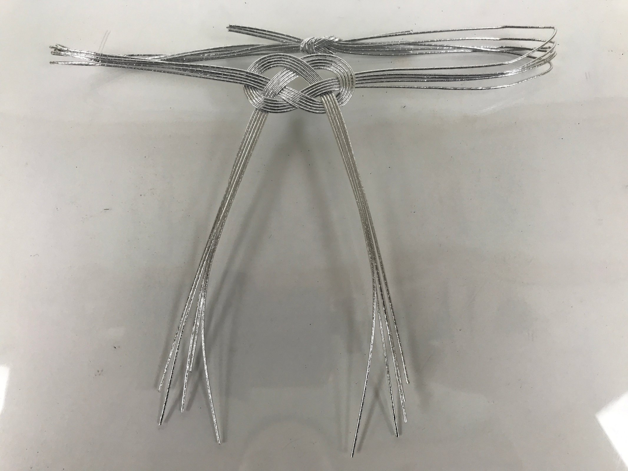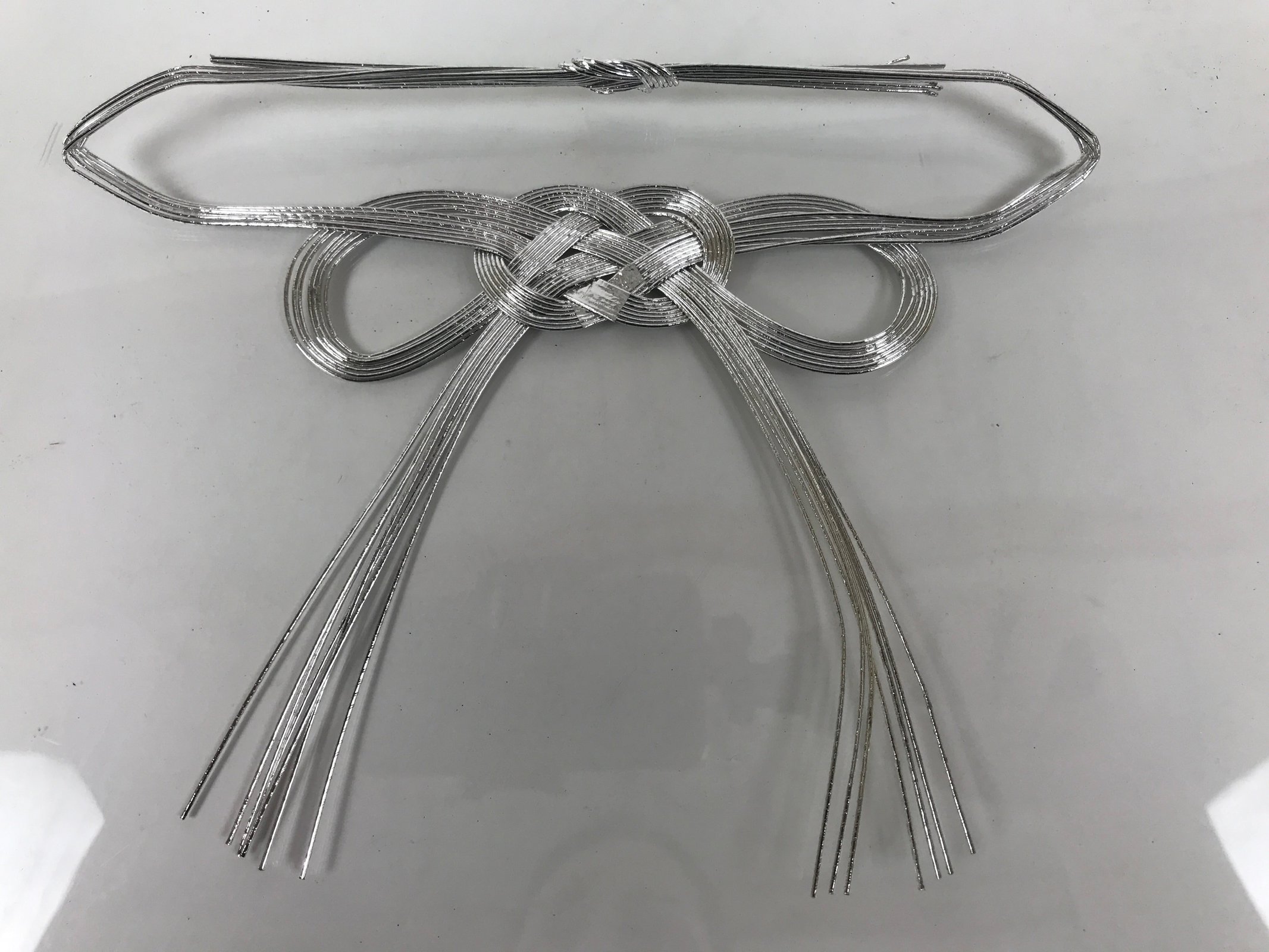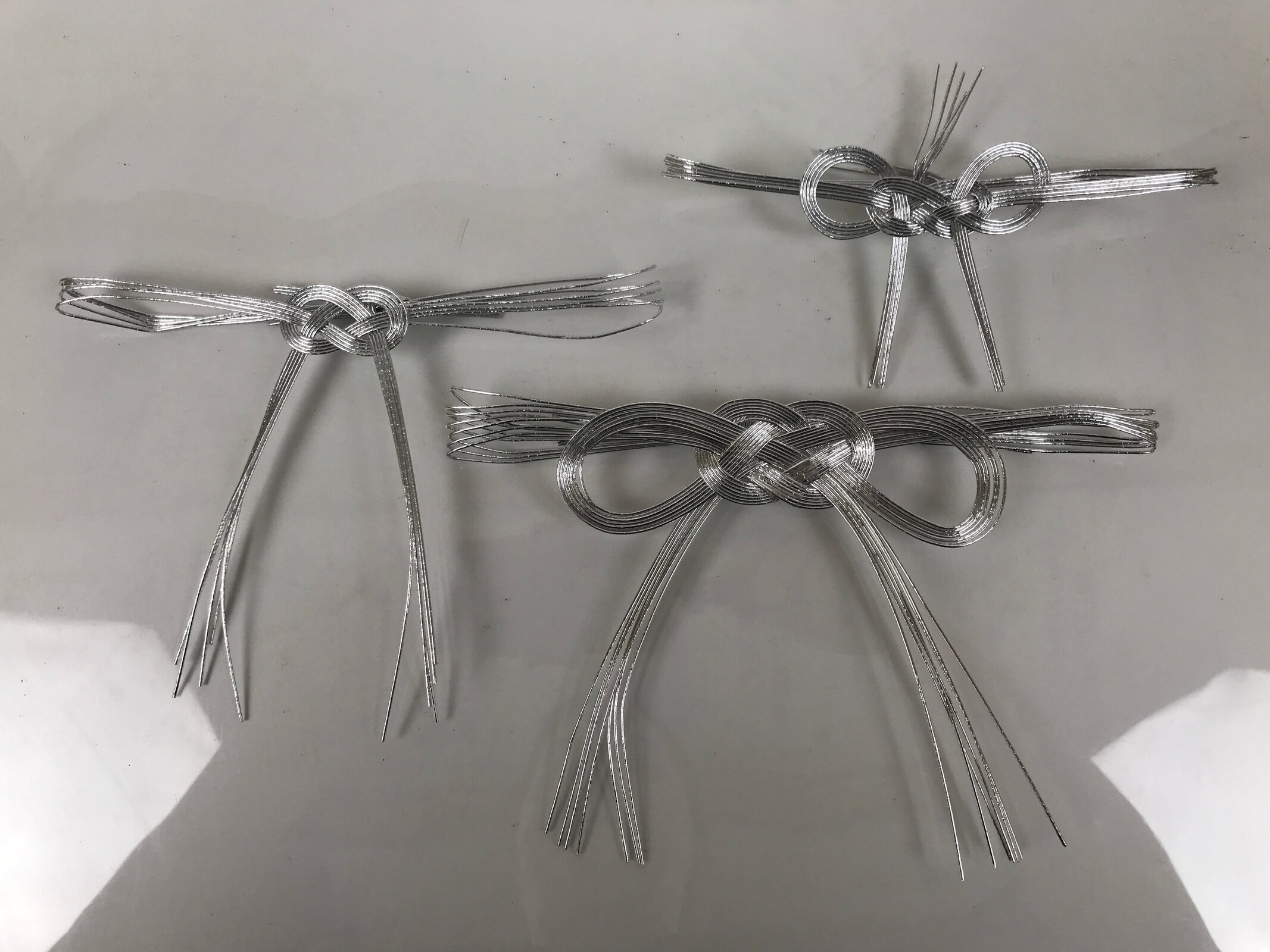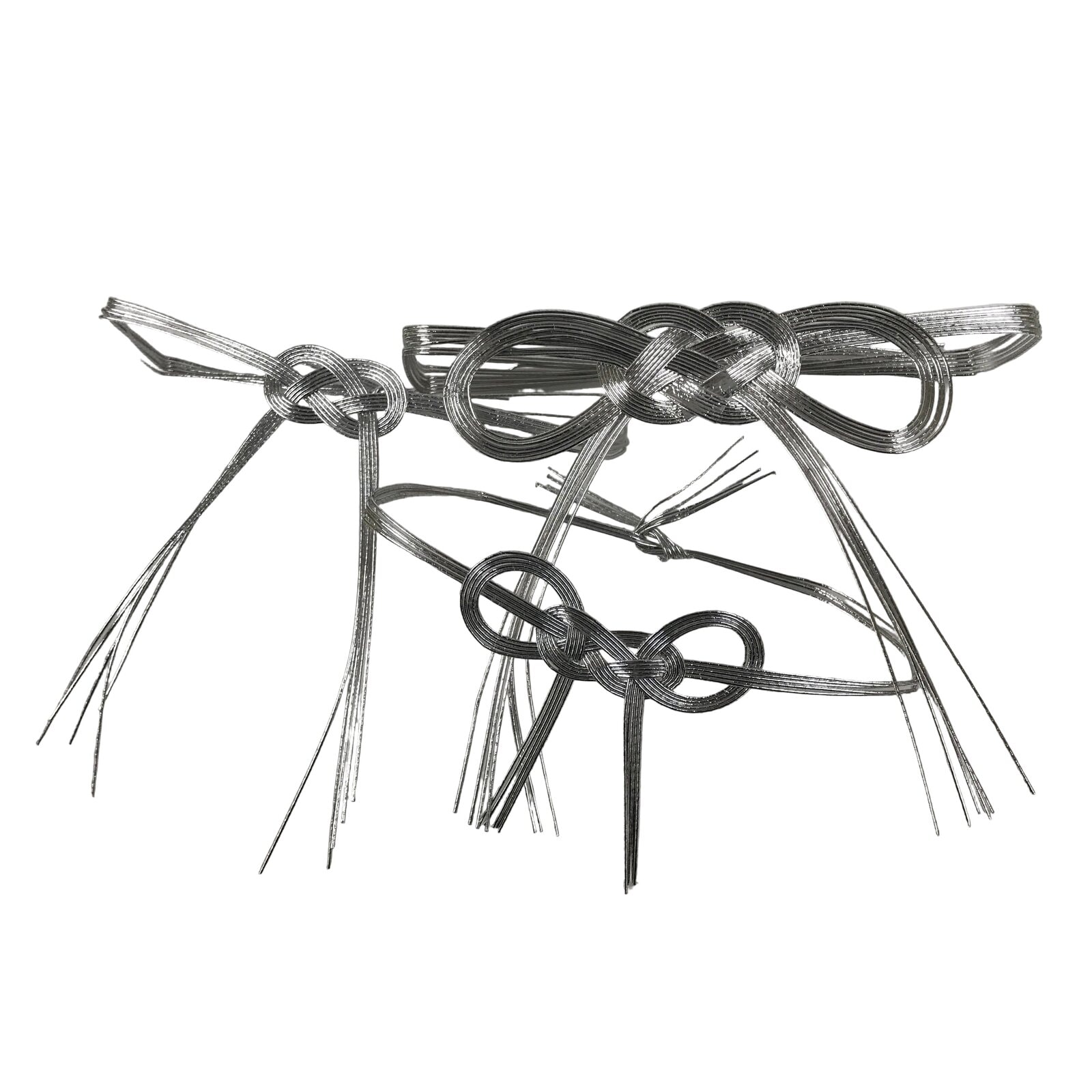 This item is a set of three ceremonial awaji-musubi knots in silver. These mizuhiki knots are commonly seen on gifts in numerous circumstances, such as funerals, weddings, and other congratulatory moments. Awaji-musubi style in particular is meant for one-time occasions. Silver (like these), black, and or white are universally used only for funerals with some regional differences. The tails of the knot are typically faced upward. They are made of stiff washi paper cord.