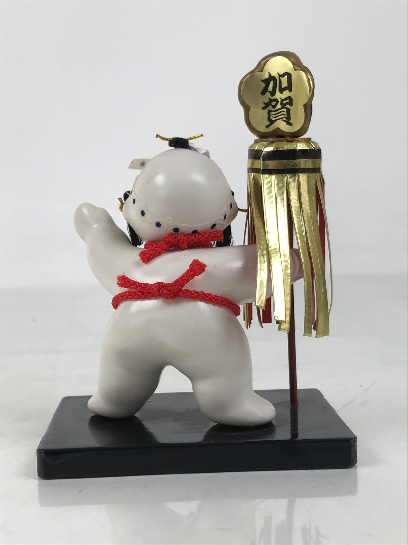 This is a vintage Japanese Kaga ningyo, a folk toy from Kanazawa, Ishikawa. This decorative figurine represents a chubby baby in a fireman or Hikeshi-like costume of the Edo era. It holds a Matoi or a banner symbolizing a firemen’s group. The baby’s hairstyle, tying his hair on the top and near the ears, is a common style for children in the Edo era.