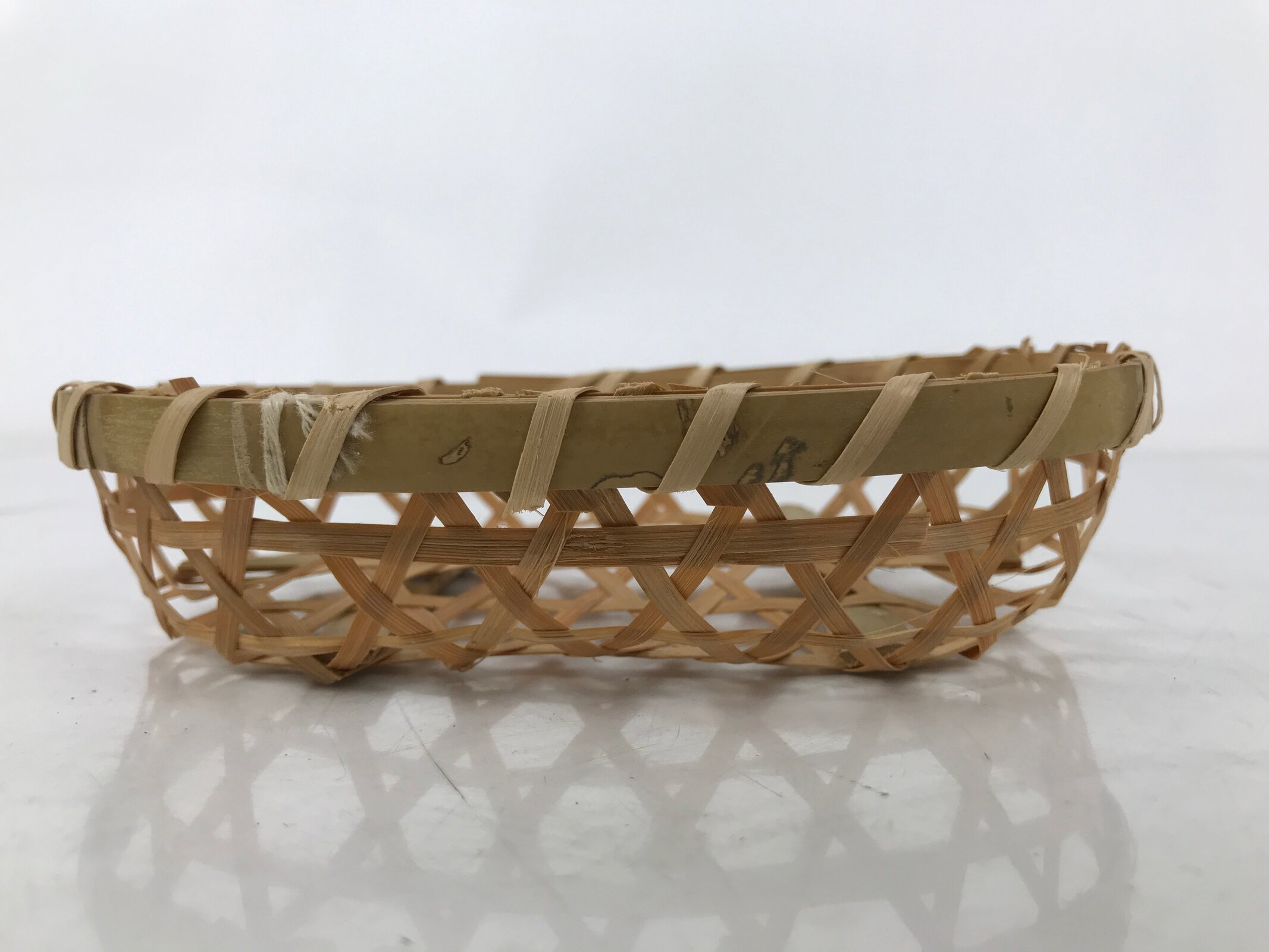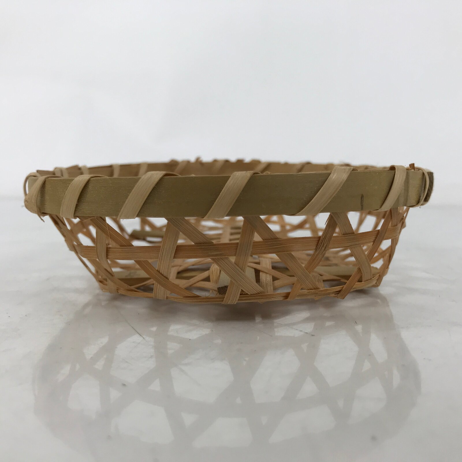 Woven with fine strips of bamboo in the hexagonal mutsume-ami style (also called Shaker), this beautiful little shallow oval basket is the perfect addition to any home or office decor.
