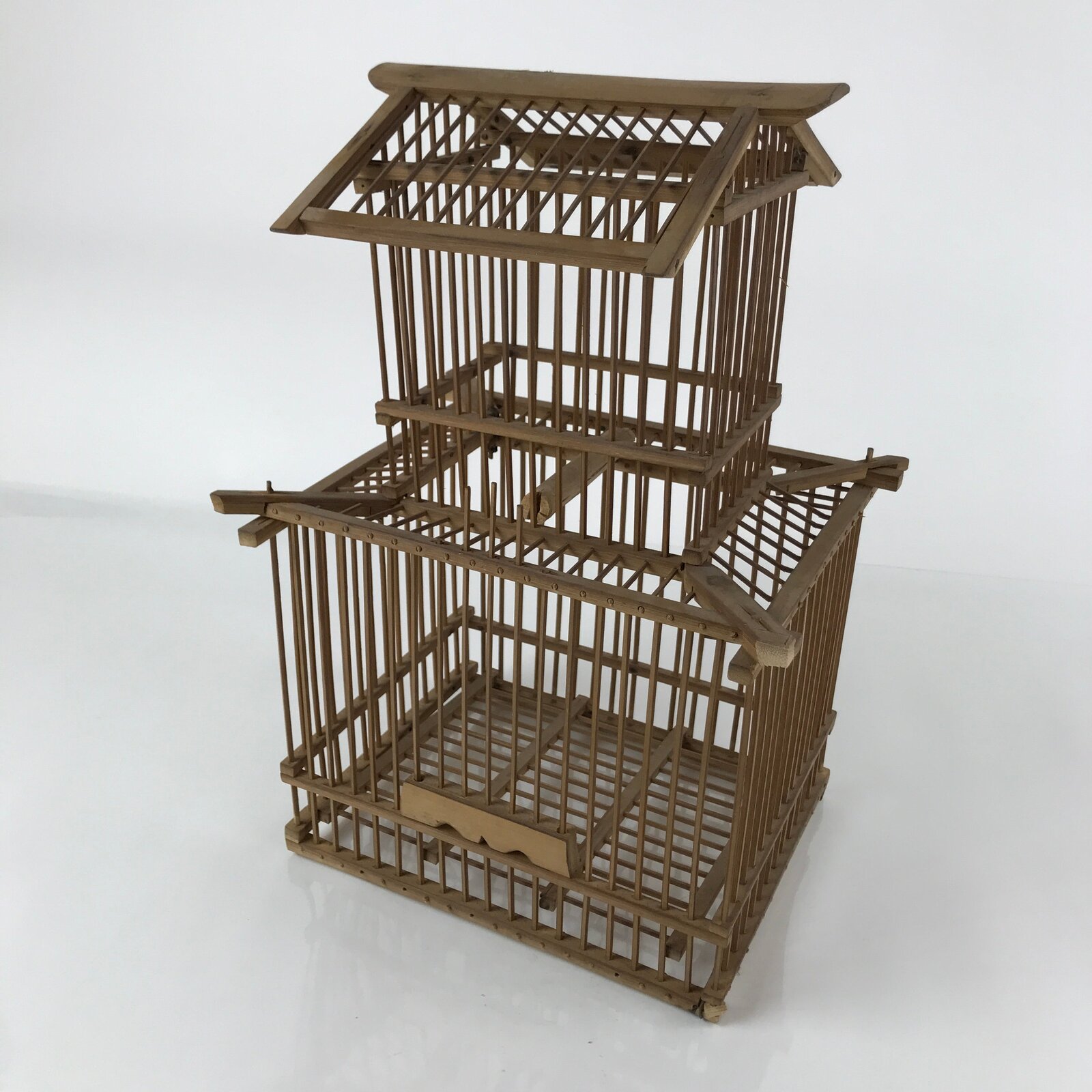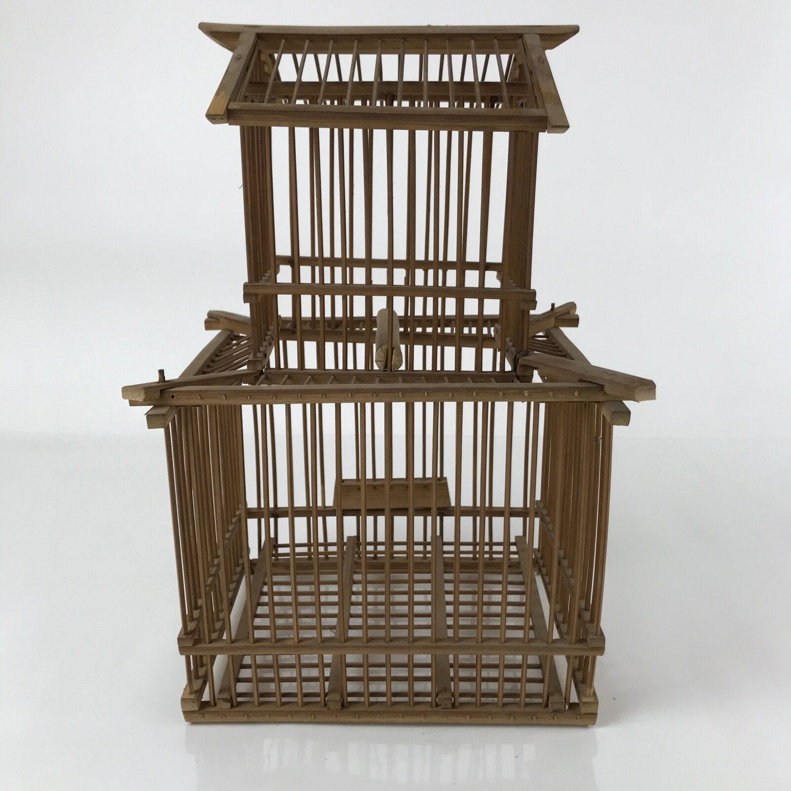 This is a vintage Japanese bamboo birdcage, or torikago. This unique cage with two levels is built up of small strips and dowels of bamboo and fitted together without the use of glue or other adhesives. There is one sliding door that moves up smoothly, a stick a piece of wood that is fitted firmly at the upper level for a bird to sit on, as well as a removable bottom panel for easy cleaning access. This cage is meant for a single small bird, but is also a very visually appealing decorative piece.