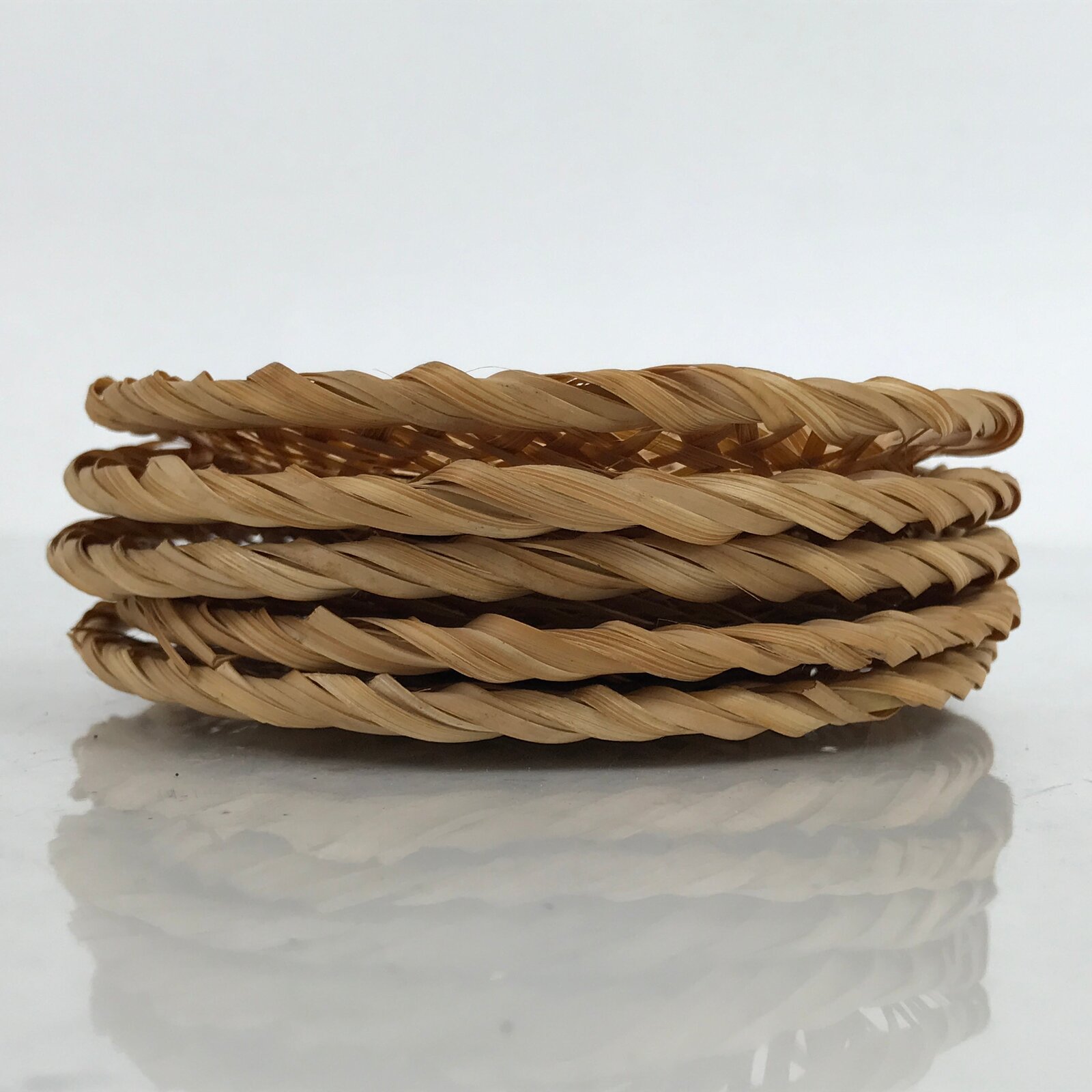 This item is a set of vintage Japanese drink saucers/coasters, also known as chataku. A set of five, these chataku are handwoven with thin strips of bamboo and are lightweight. At the center is a flat woven surface to hold the cup in place.