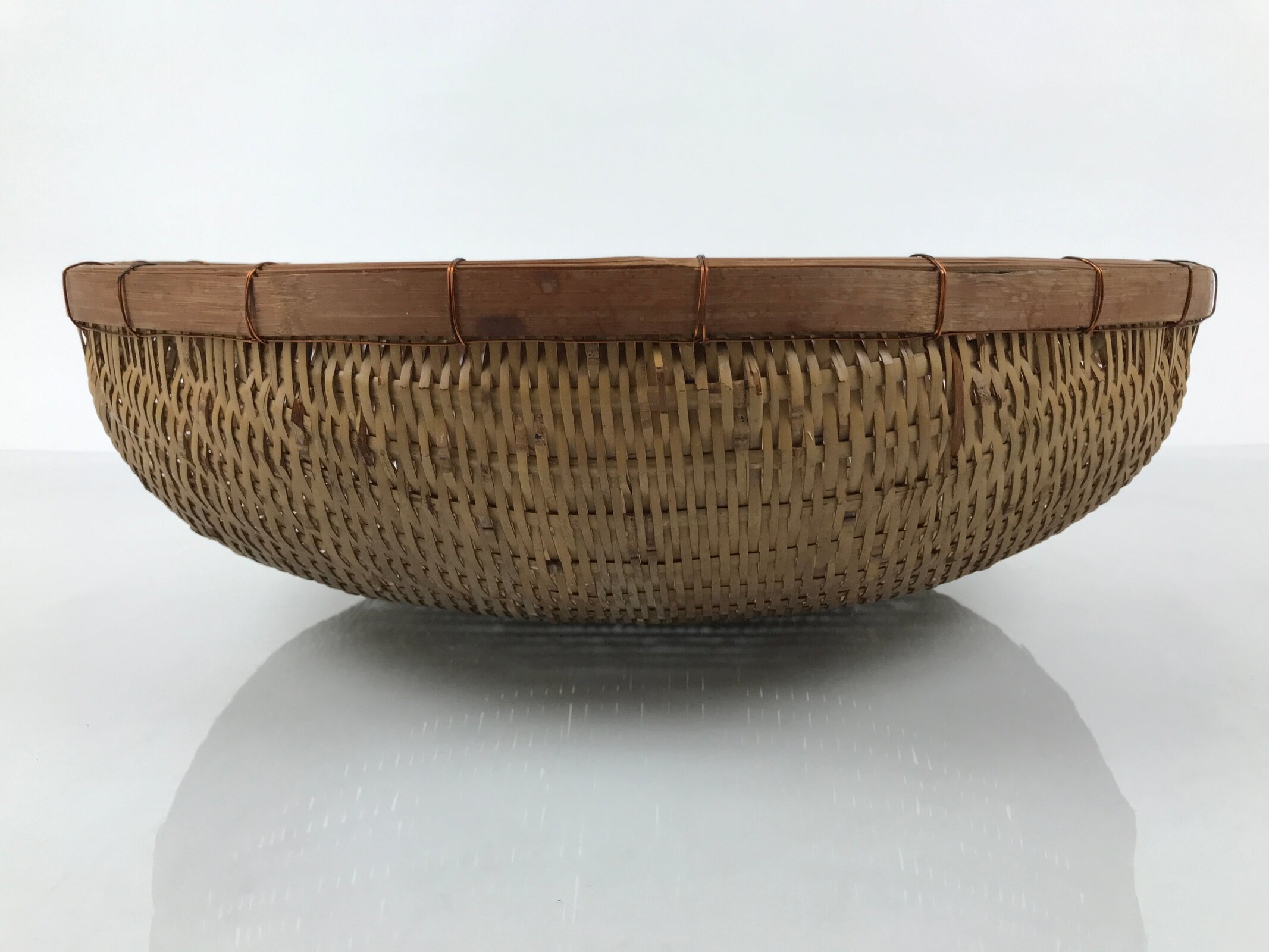 This is a vintage traditional natural bamboo woven basket used for drying or draining water from various items such as tea leaves, small vegetables like edamame pods, etc. This particular type of handwoven zaru is completely round with no open sides, and is bound together by copper metal wire.