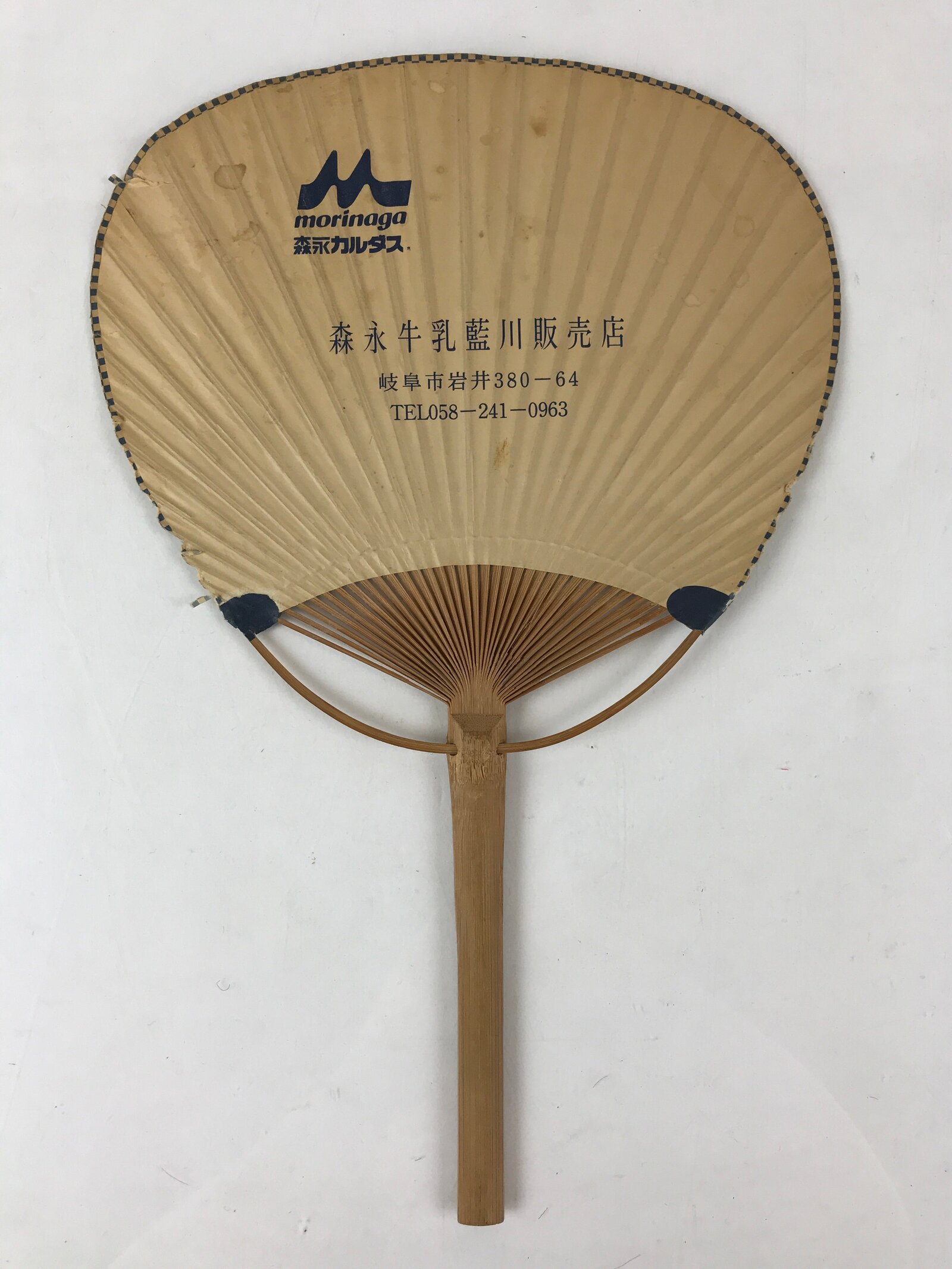 This is a vintage Japanese Uchiwa. Uchiwa (fan) is a tool that creates wind by fanning it with your hand. This fan has a picture of a smiling woman wearing a kimono on the front and an advertisement for the company (Milk Company, Morinaga, address, phone number) on the back.