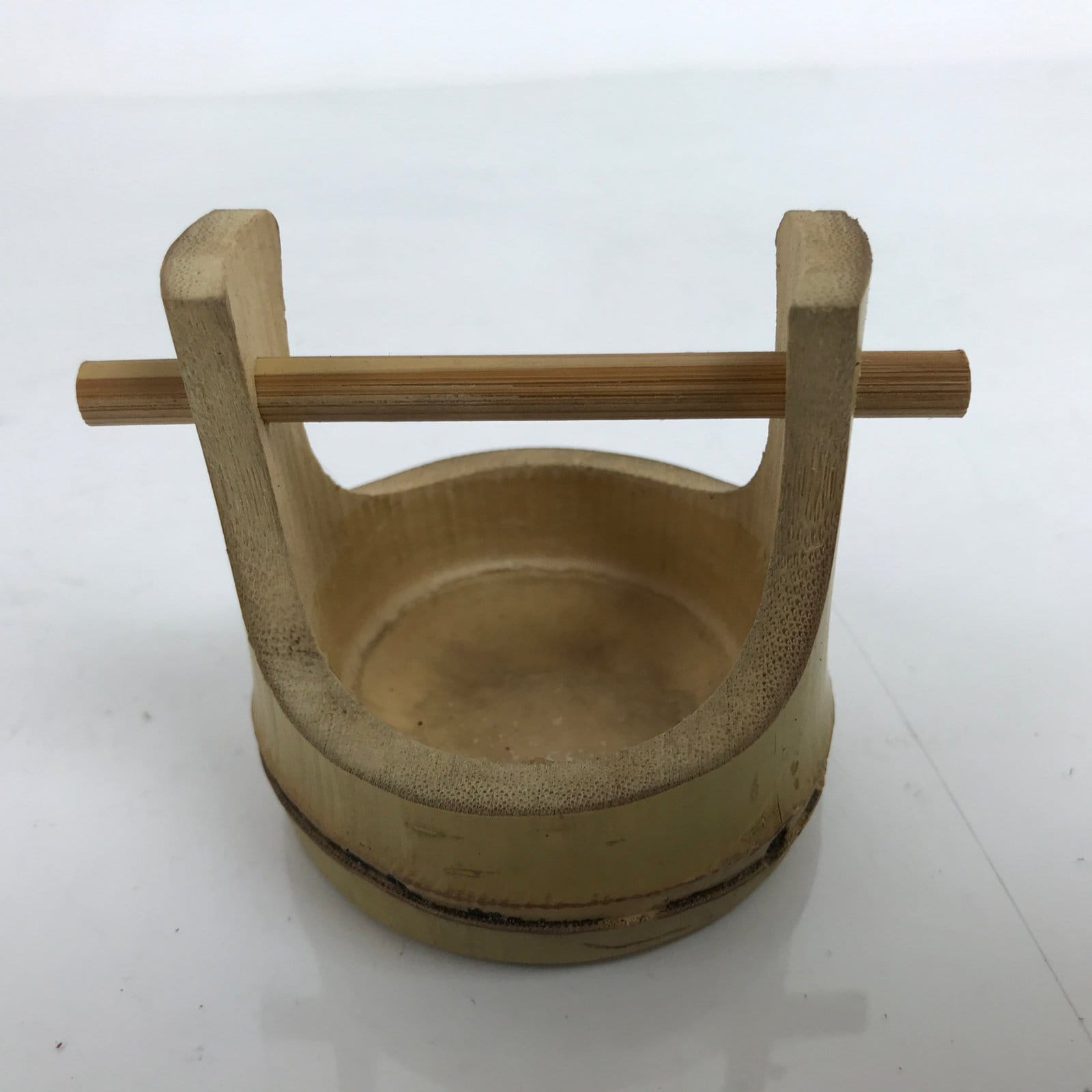 This item is a vintage Japanese serving dish in the shape of a miniature hand bucket (teoke). This is likely used for small aesthetic dishes often served during traditional multi-course kaiseki meals. It is made from cut bamboo and easily washable. It can just as easily be used for dipping sauces and condiments, a small holder for jewelry, and it also makes a lovely stand for the ladle during Japanese tea ceremony.
