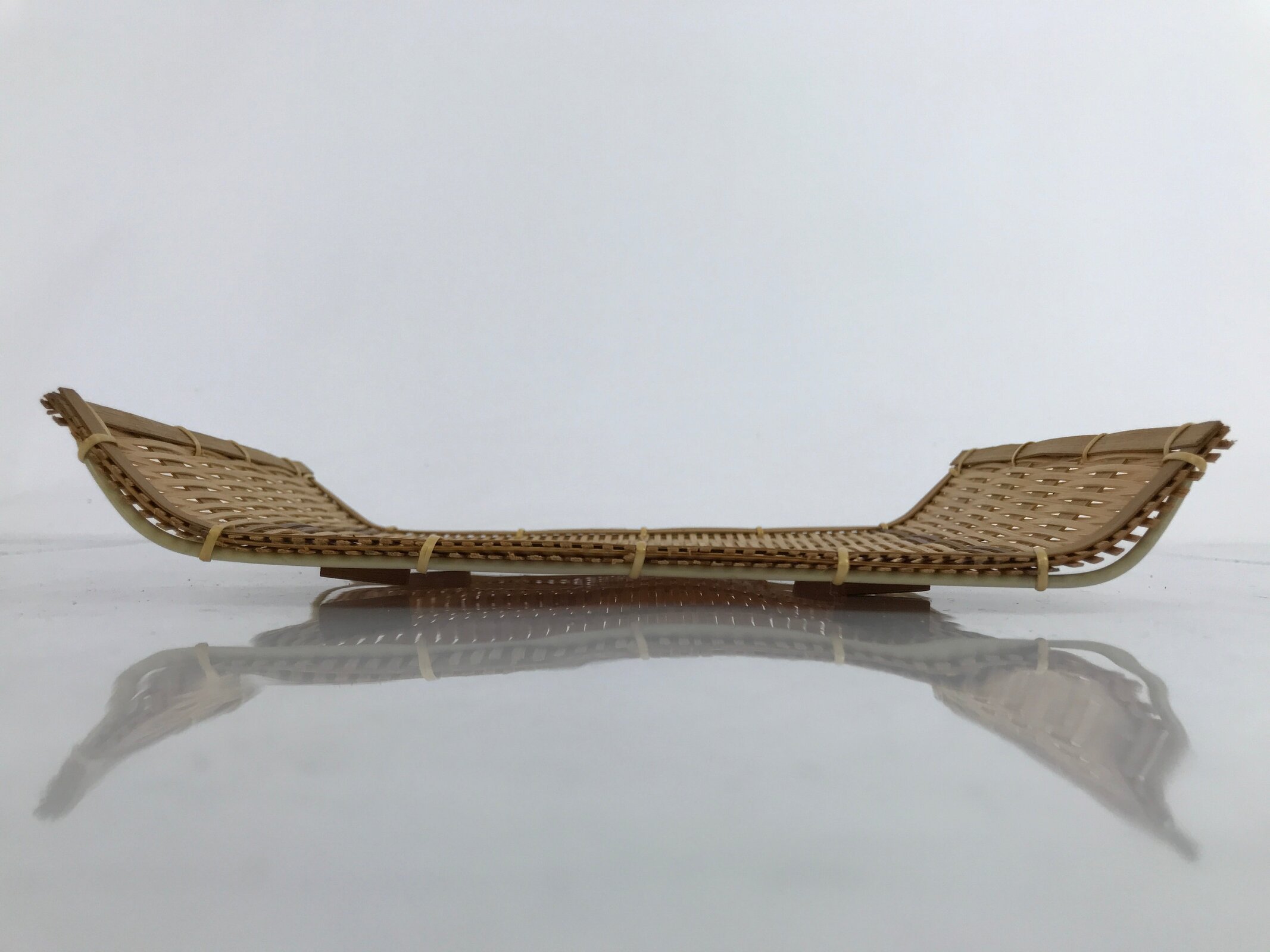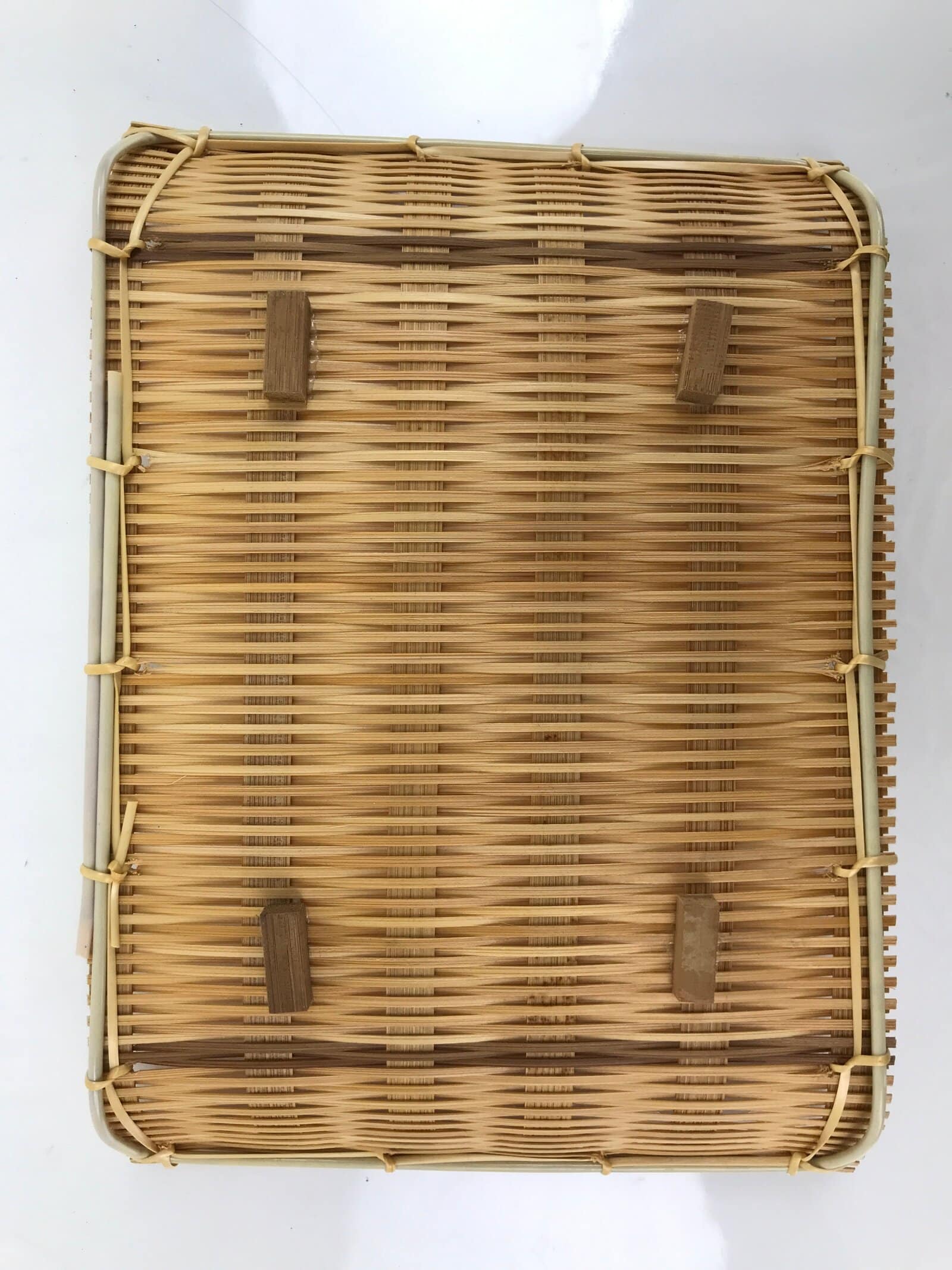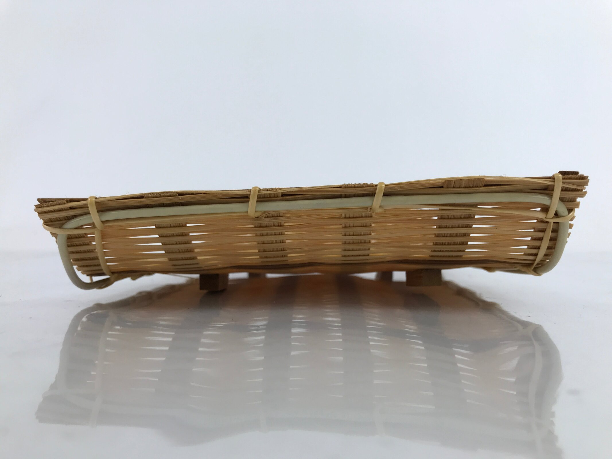 This is a vintage Japanese bamboo plate. Woven with finely cut, thin strips of bamboo, this lightweight plate stands on four small block legs and has a plastic pipe frame to give it strength. This can be used for many purposes including for traditional wagashi and mochi sweets and for presenting rolled wet hand towels (oshibori) for guests. This item can also be used as a general serving or trinket tray.