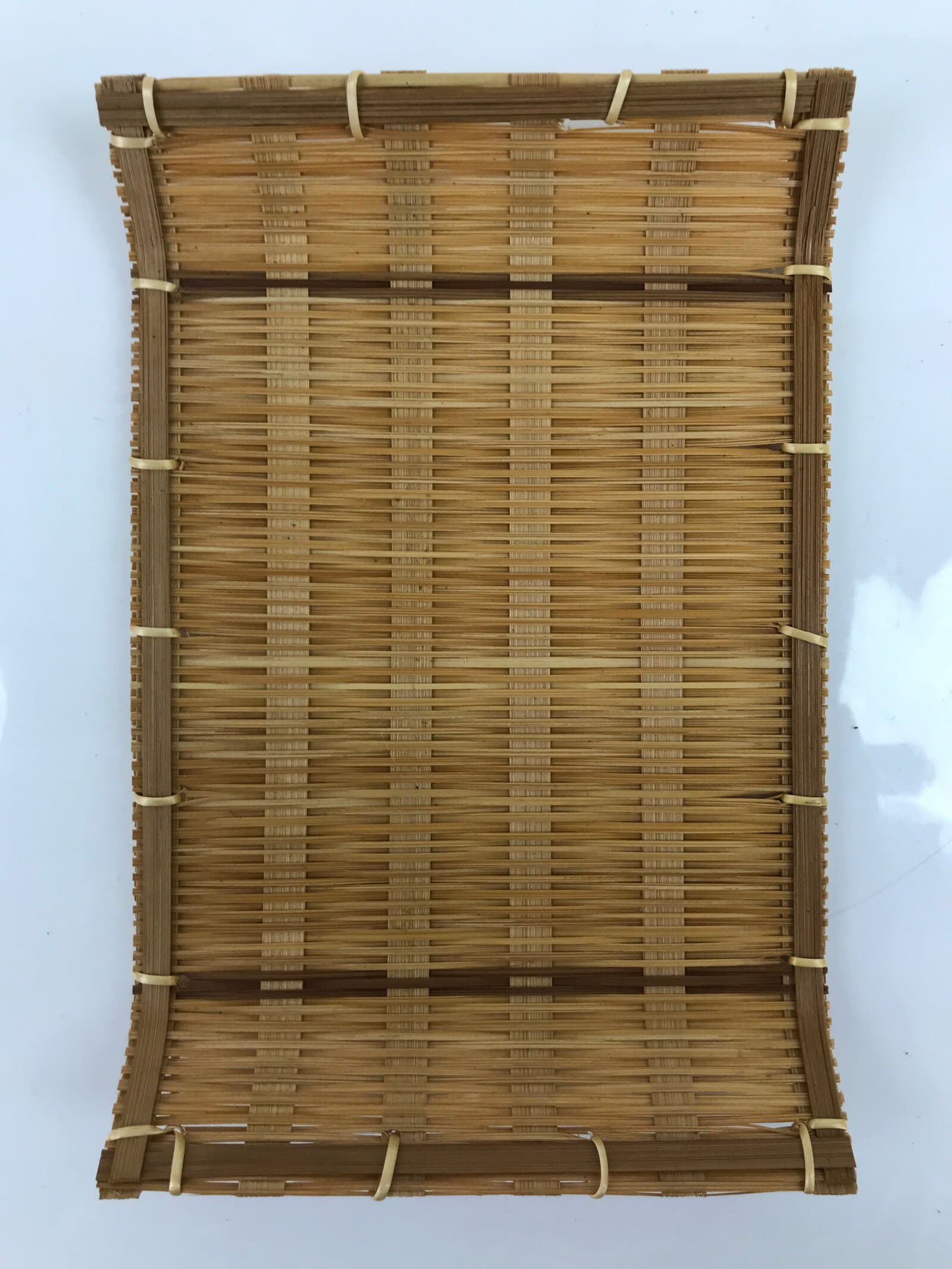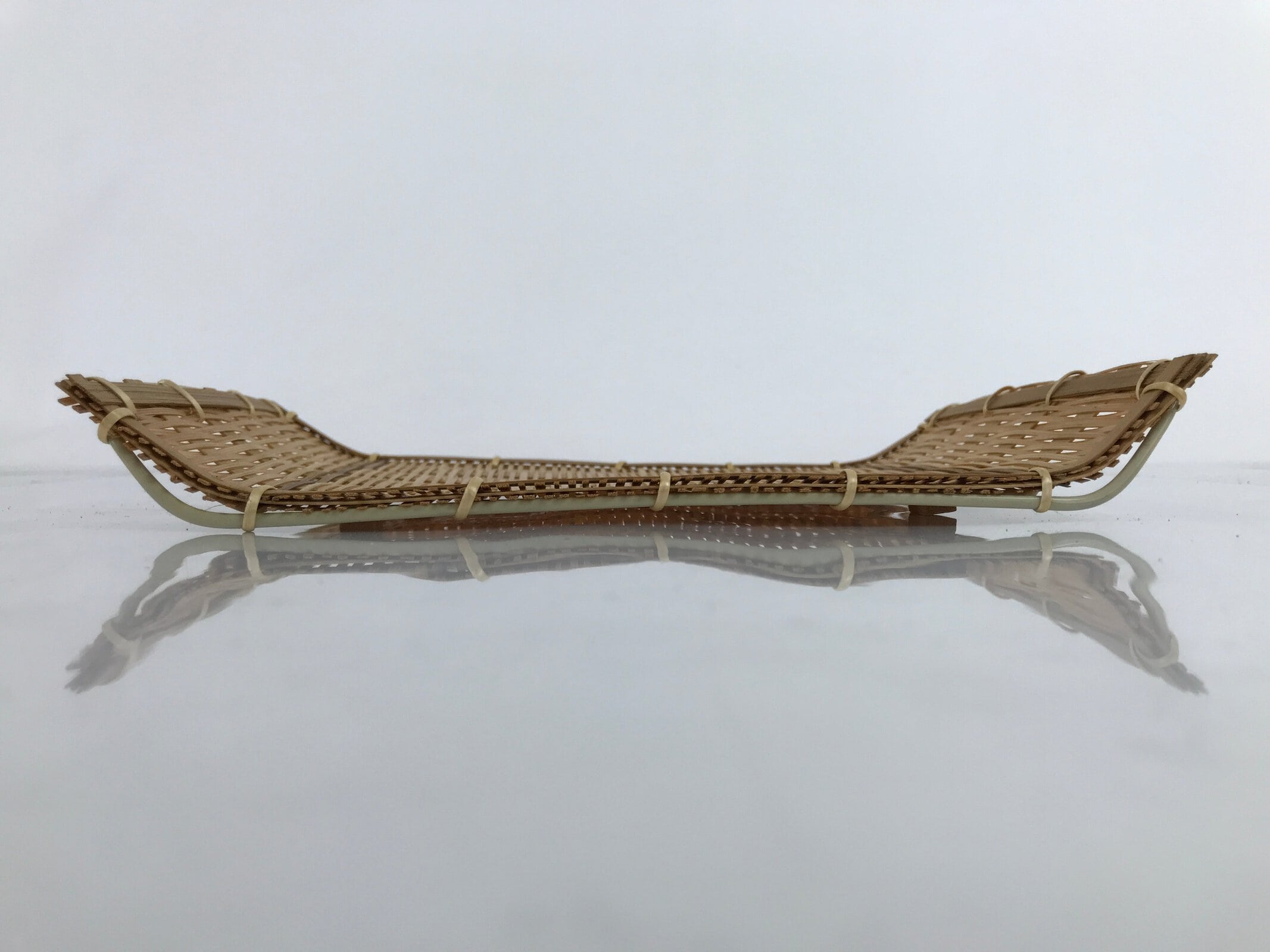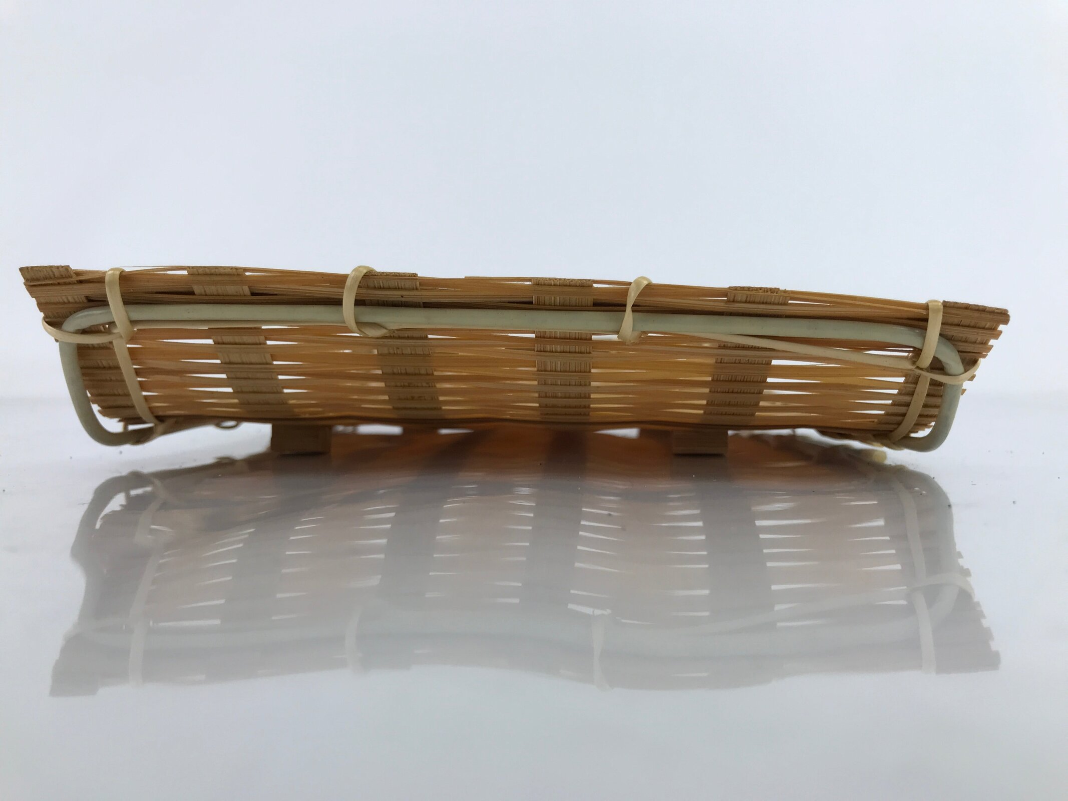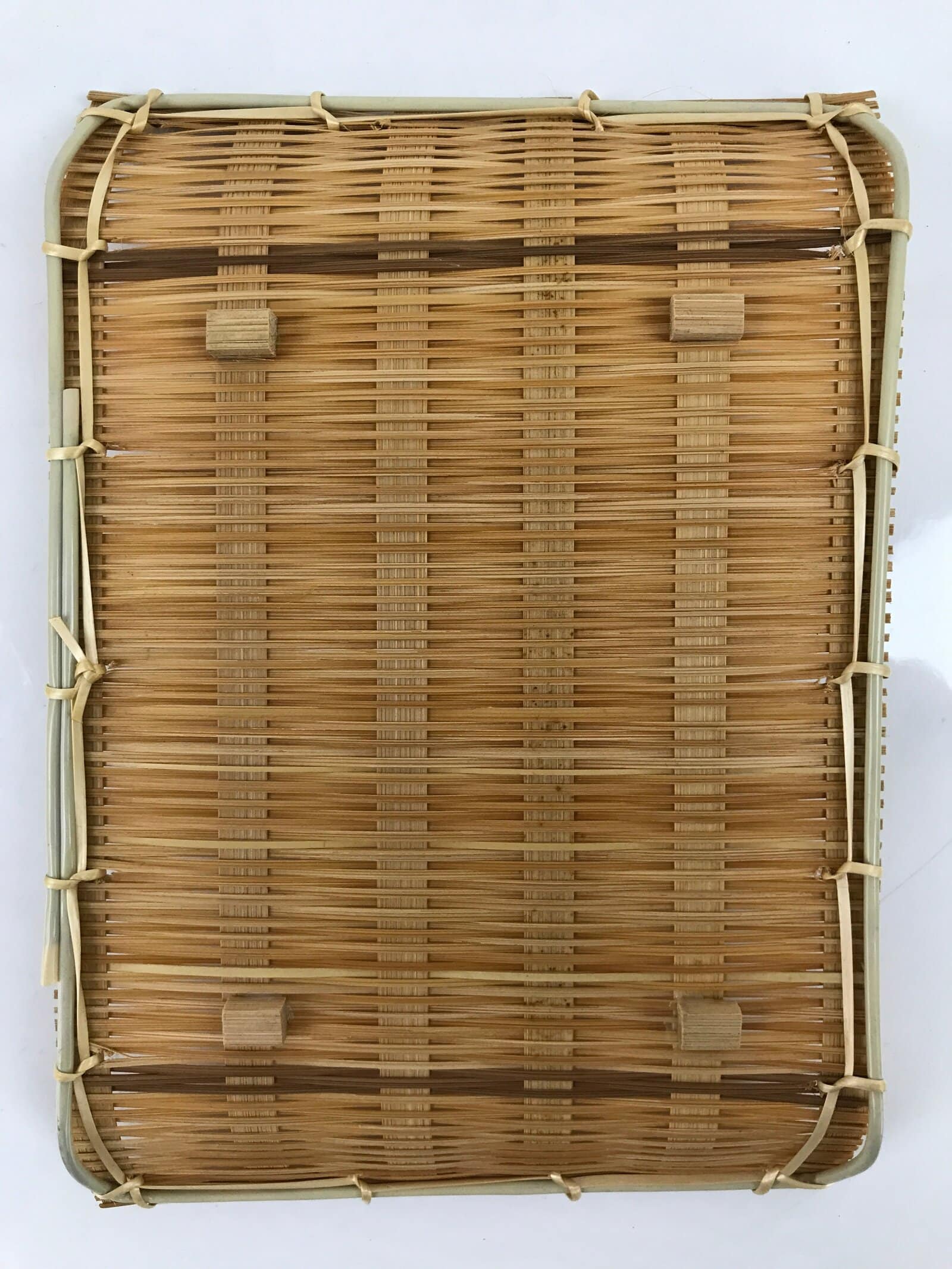 This is a vintage Japanese bamboo plate. Woven with finely cut, thin strips of bamboo, this lightweight plate stands on four small block legs and has a plastic pipe frame to give it strength. This can be used for many purposes including for traditional wagashi and mochi sweets and for presenting rolled wet hand towels (oshibori) for guests. This item can also be used as a general serving or trinket tray.