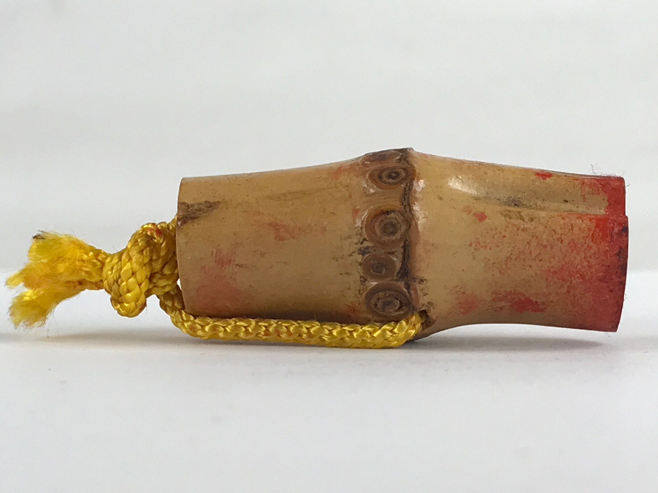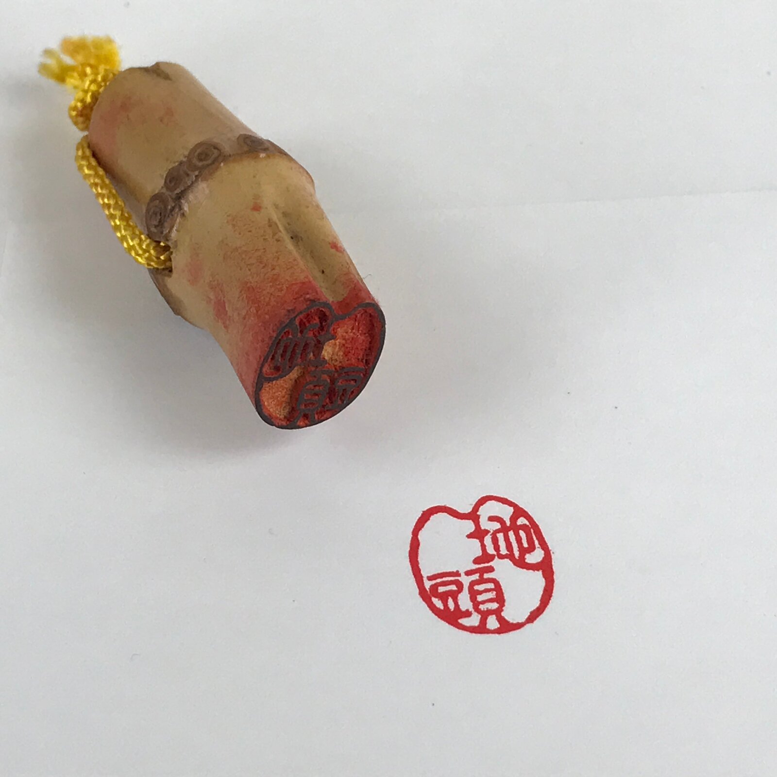 This is a vintage Japanese bamboo stamp, Hanko. A family name is carved in the kanji “地頭 Jitou” on the bamboo section. Heart-shaped bamboo joints are unique to see. It has a yellow string.