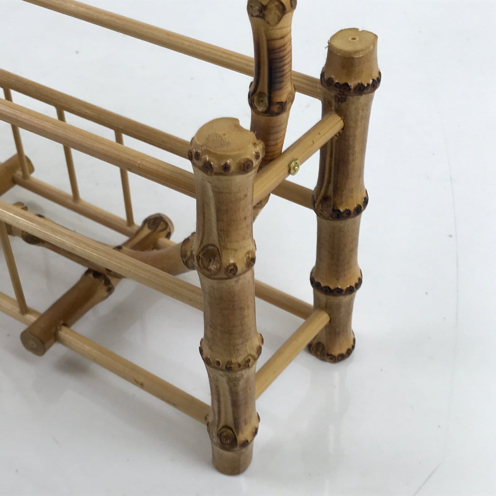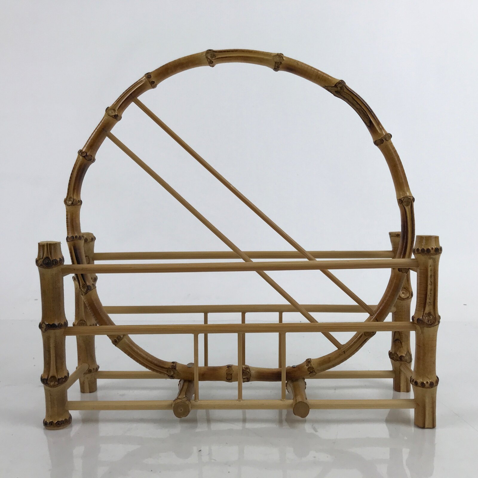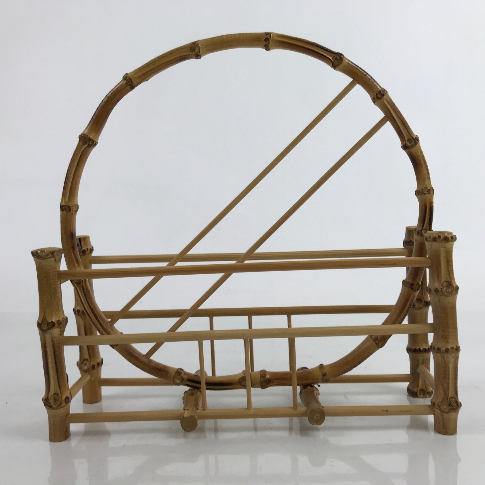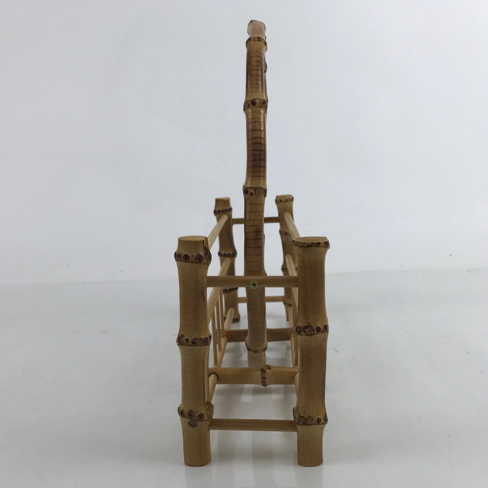 This is a vintage Japanese storage stand made uniquely for holding uchiwa hand fans. It is made of bamboo branches in a natural brown bamboo color with a shiny clear coating. Perfect for a tabletop or side table, it can hold approximately three to four fans comfortably on each side without overflow. At the very center is a round ring that helps separate the two sides, but also acts as a handle for carrying.