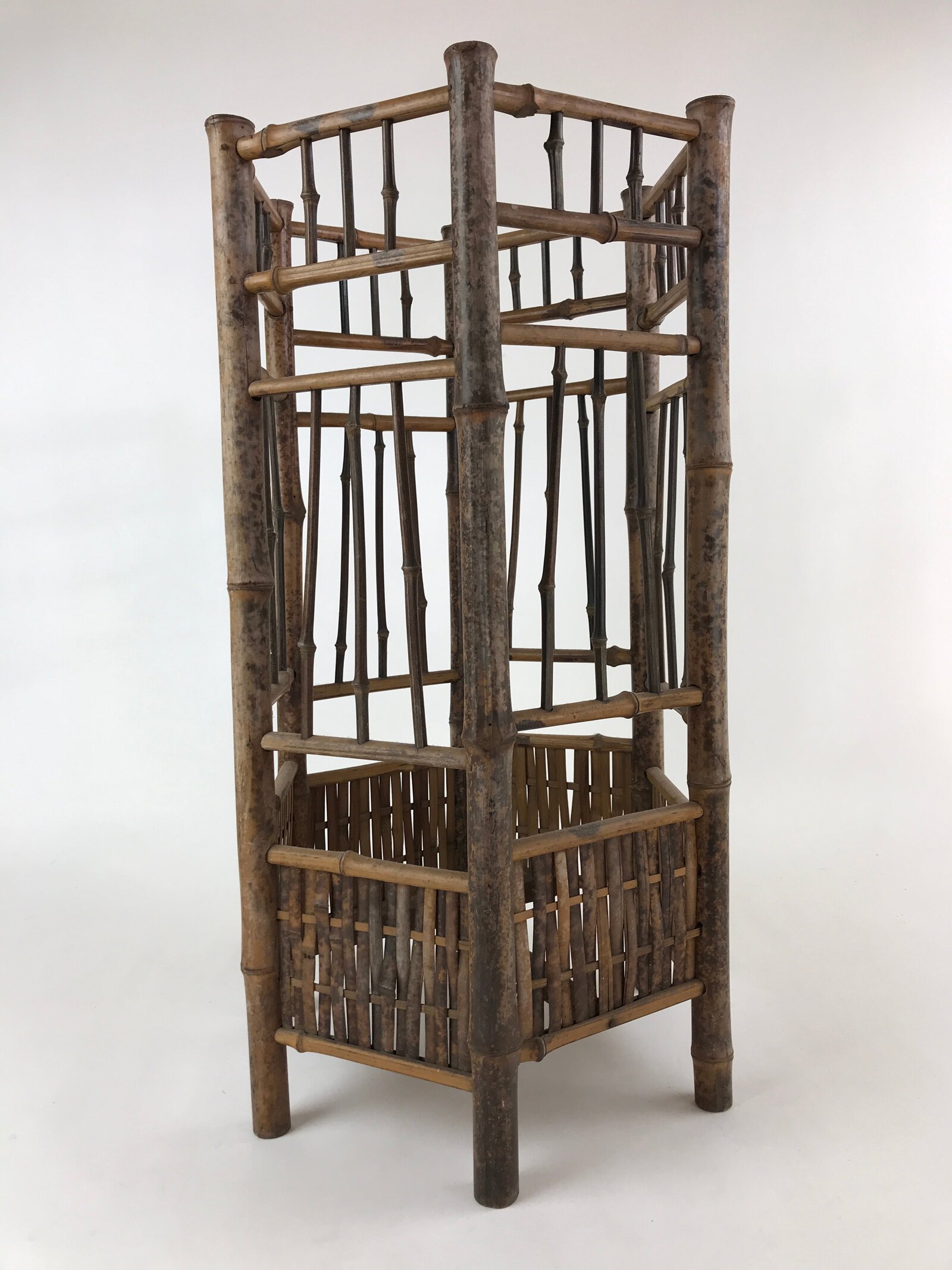This is a vintage Japanese bamboo umbrella stand, or kasatate. It has an open bottom and beautiful lattice work on the bottom. It is a hexagon shape and is fairly steady. The top of the poles are very flat, so it can easily be converted into a small table with a tray or piece of glass.