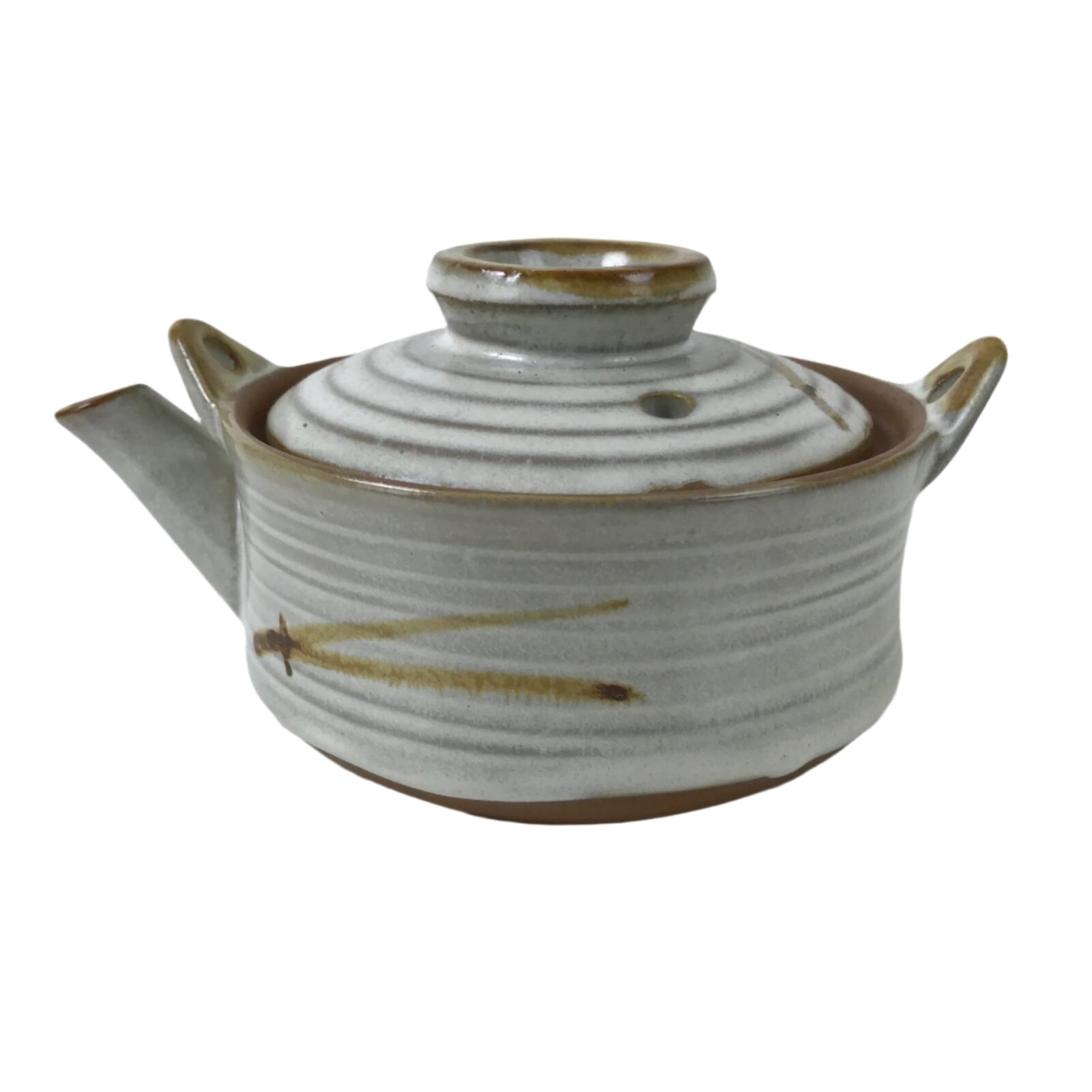 This vintage Japanese Banko ware ceramic teapot-shaped small donabe (earthenware pot) with a matching lid is beige with brown lines on the lid and the pot. This type of small-sized pot is used to serve soups or broth and is often seen in kaiseki food restaurants. It can also be used as a regular teapot. The handle is missing.