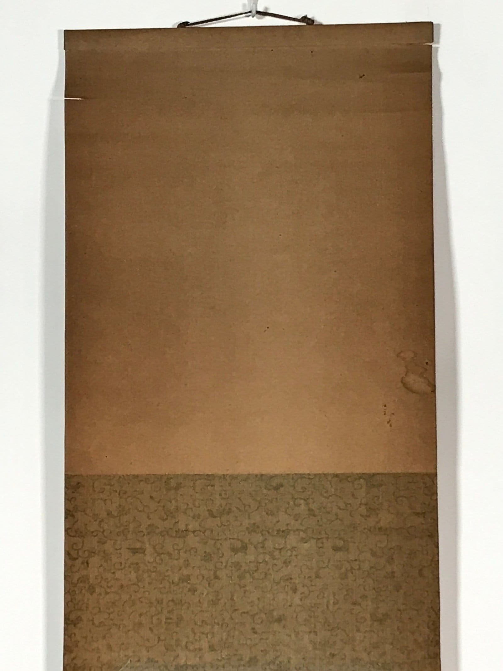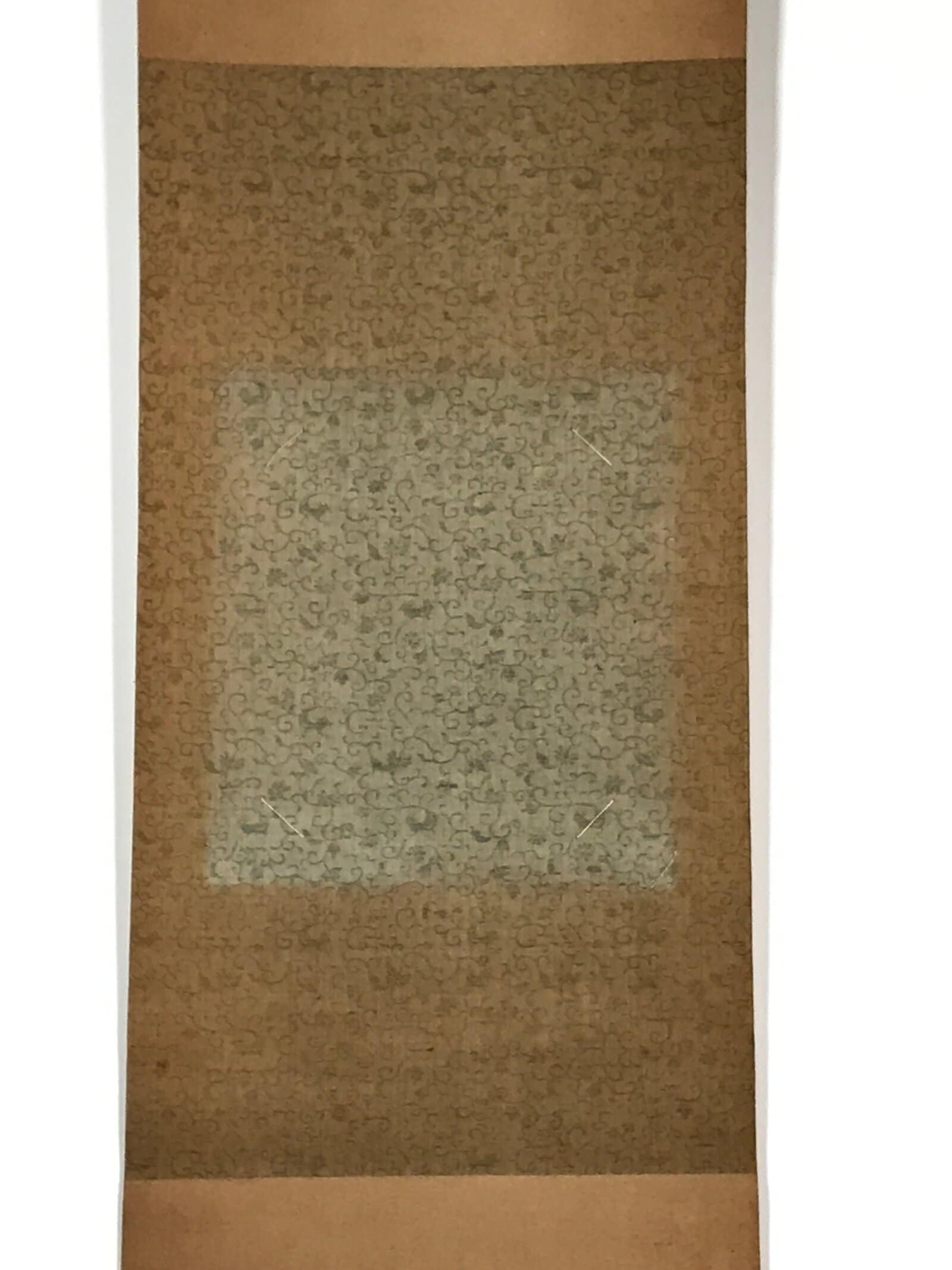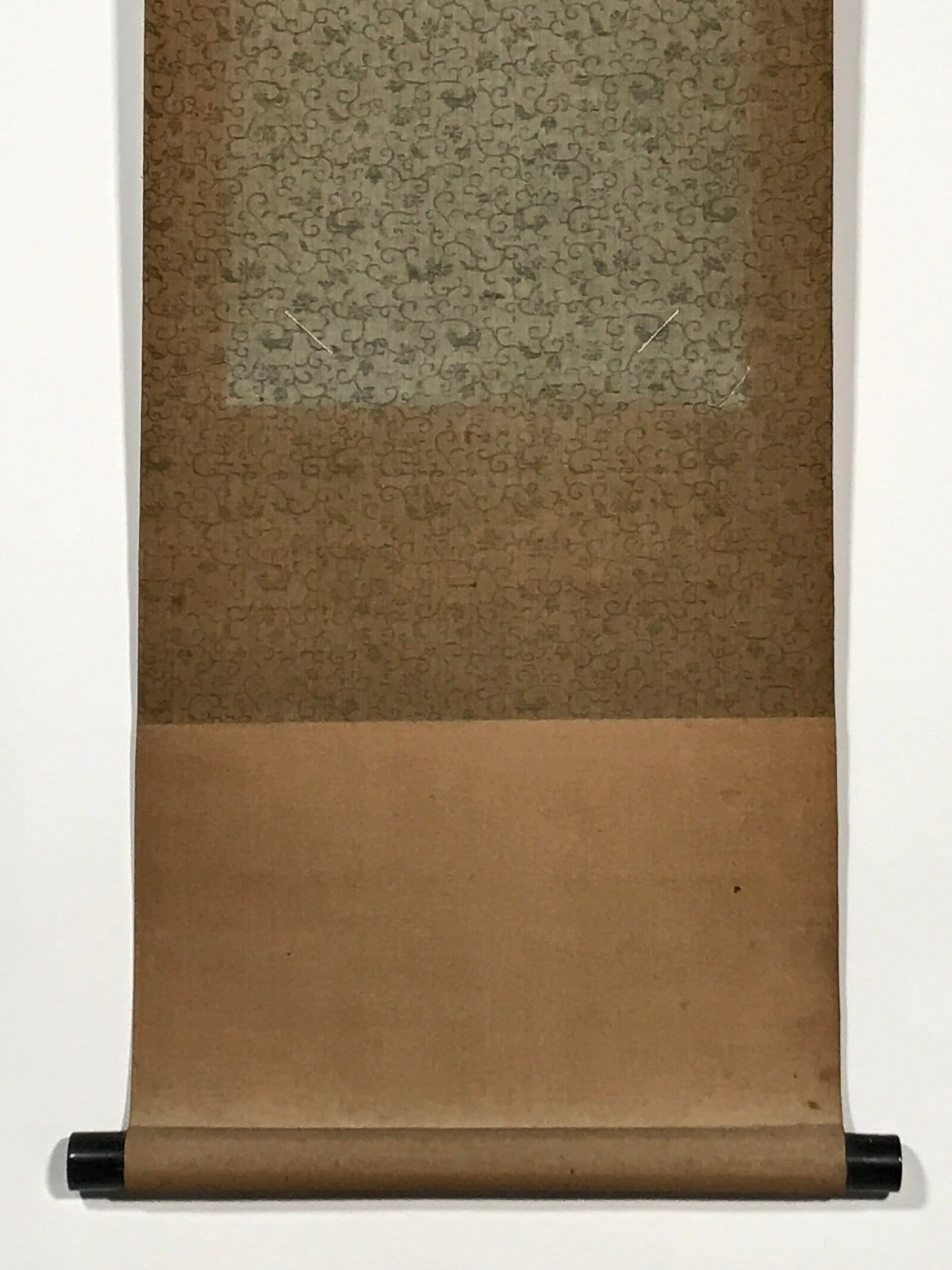 This vintage Japanese hanging scroll (kakejiku or makimono) is blank (no picture) and has thread holders. It can hold a shikishi-sized picture. This kakejiku has a brown floral pattern.