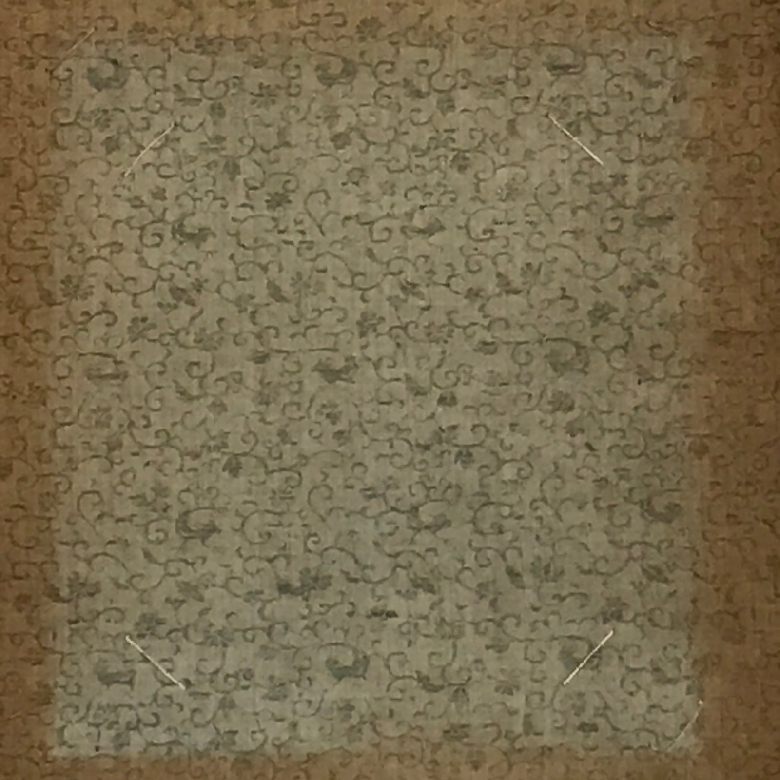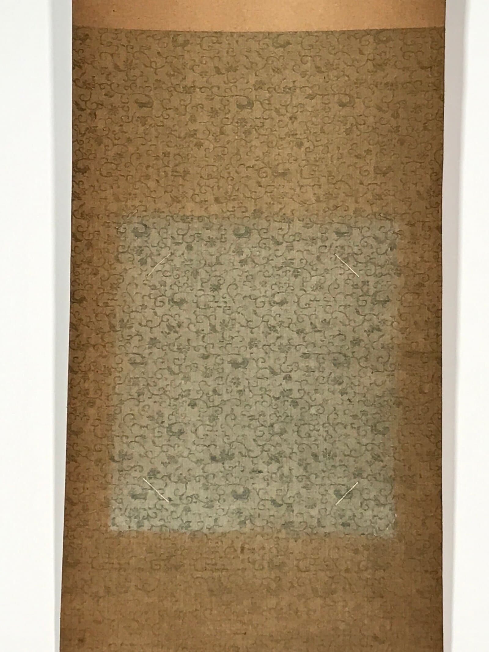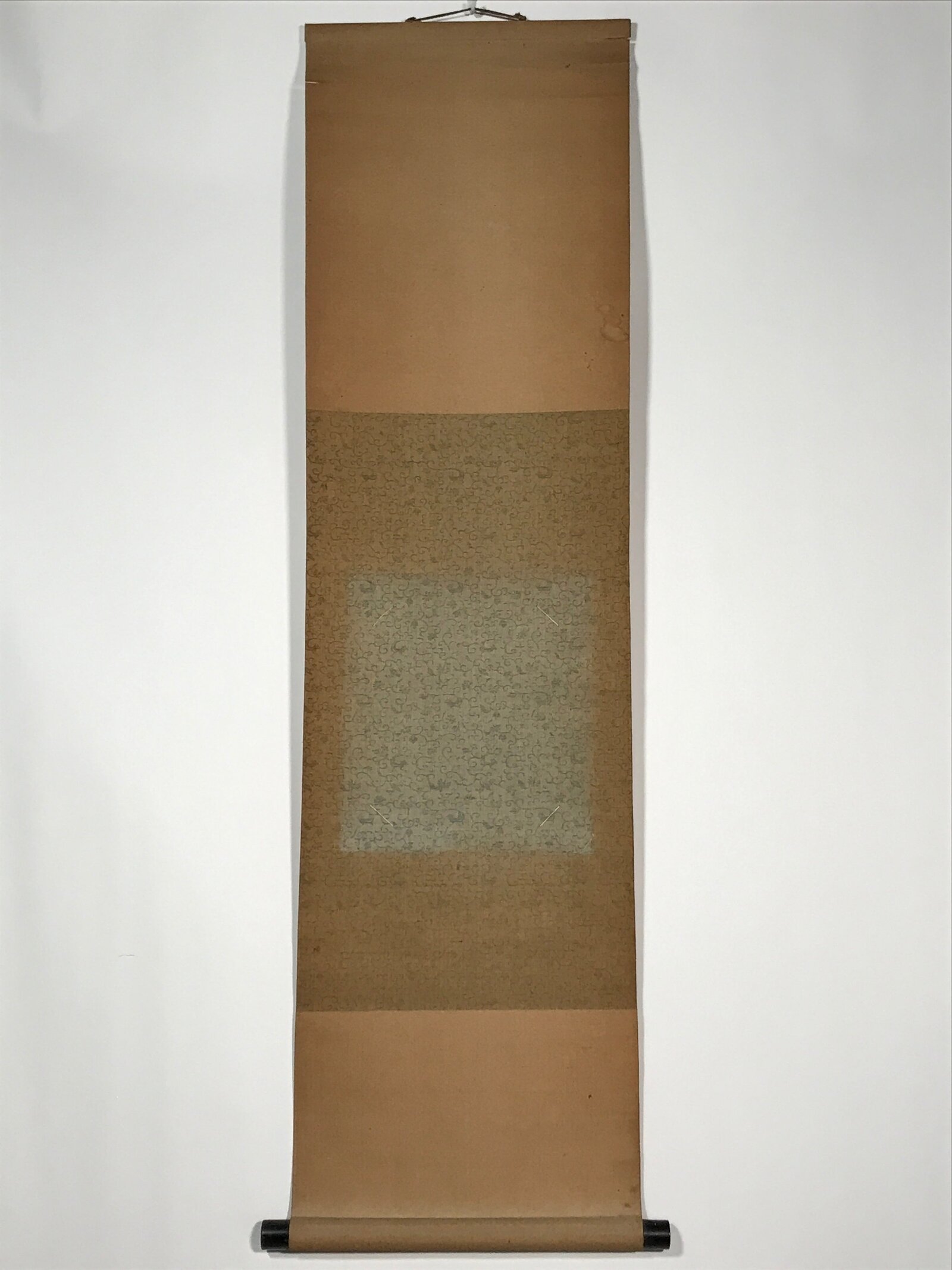 This vintage Japanese hanging scroll (kakejiku or makimono) is blank (no picture) and has thread holders. It can hold a shikishi-sized picture. This kakejiku has a brown floral pattern.