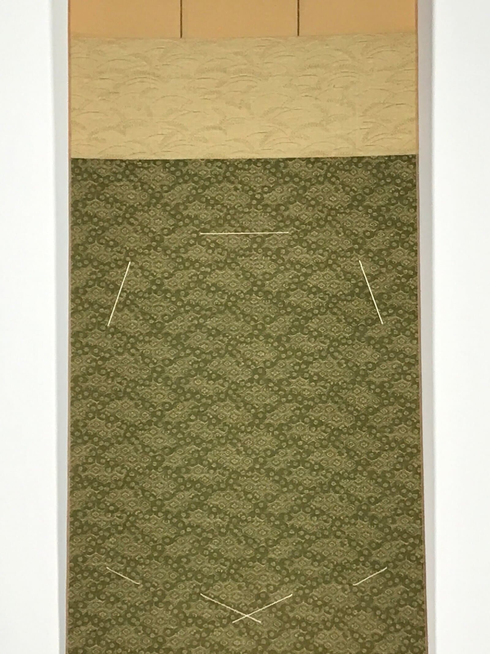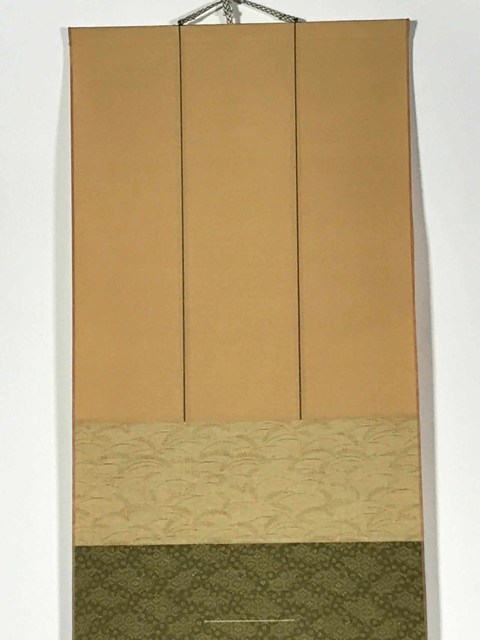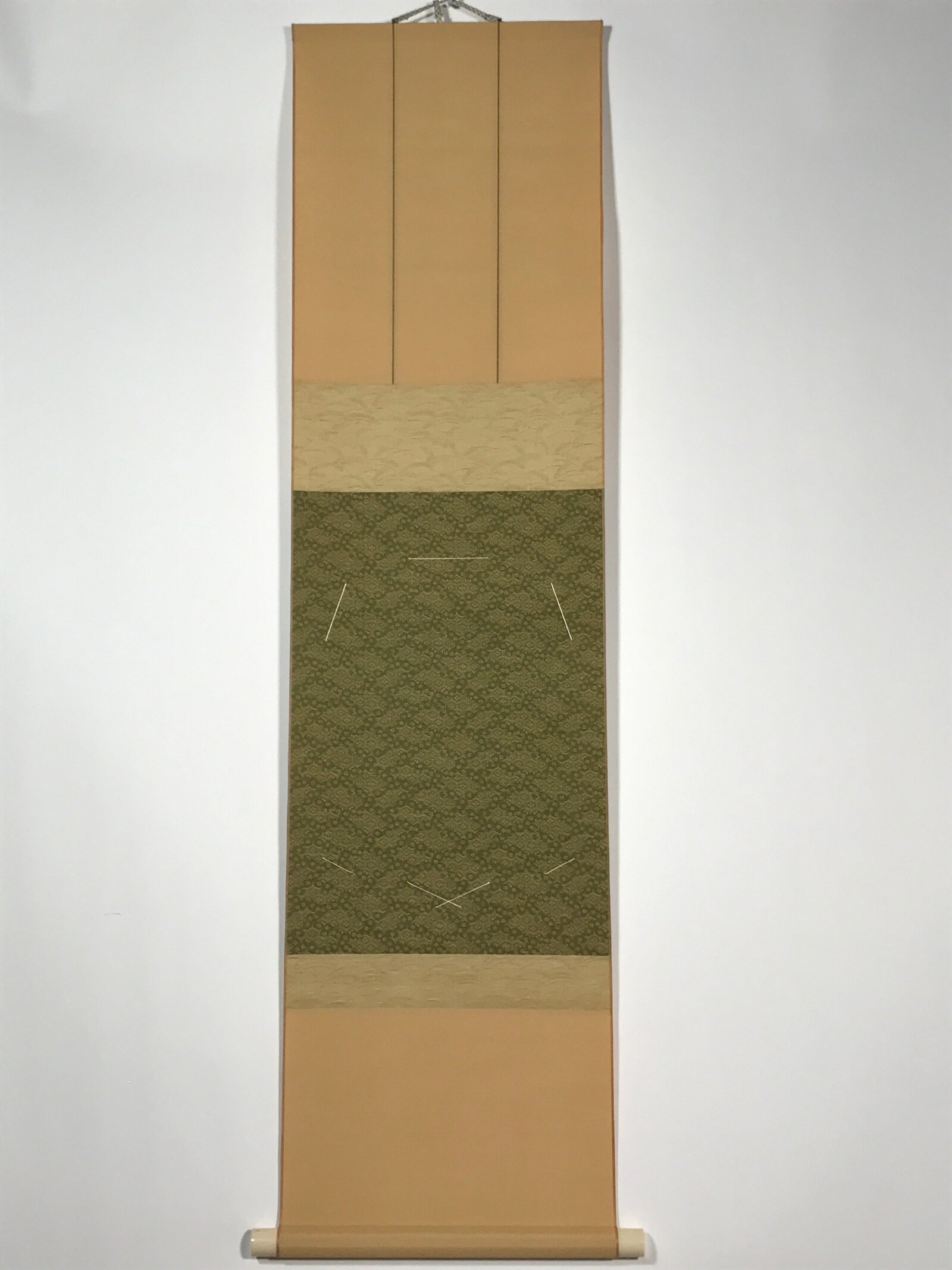 This vintage Japanese hanging scroll (kakejiku or makimono) is blank (no picture) and has thread holders. It can hold a shikishi-sized picture. This kakejiku features a floral green pattern at the center.