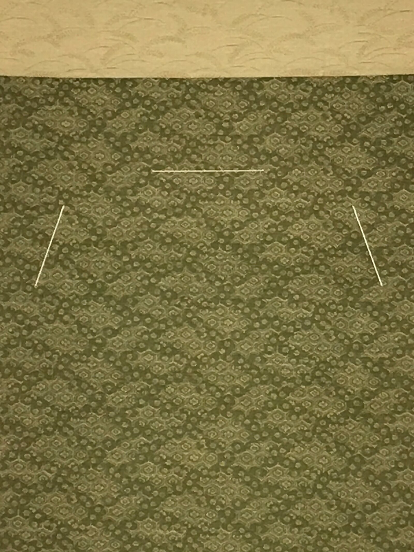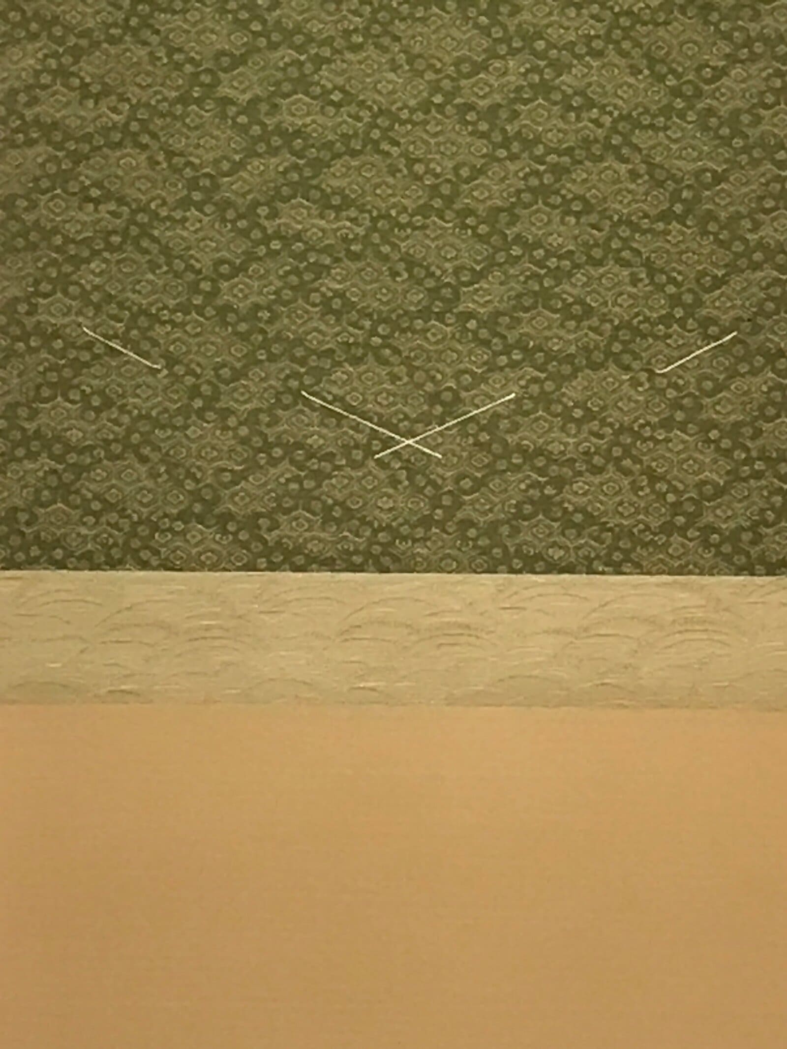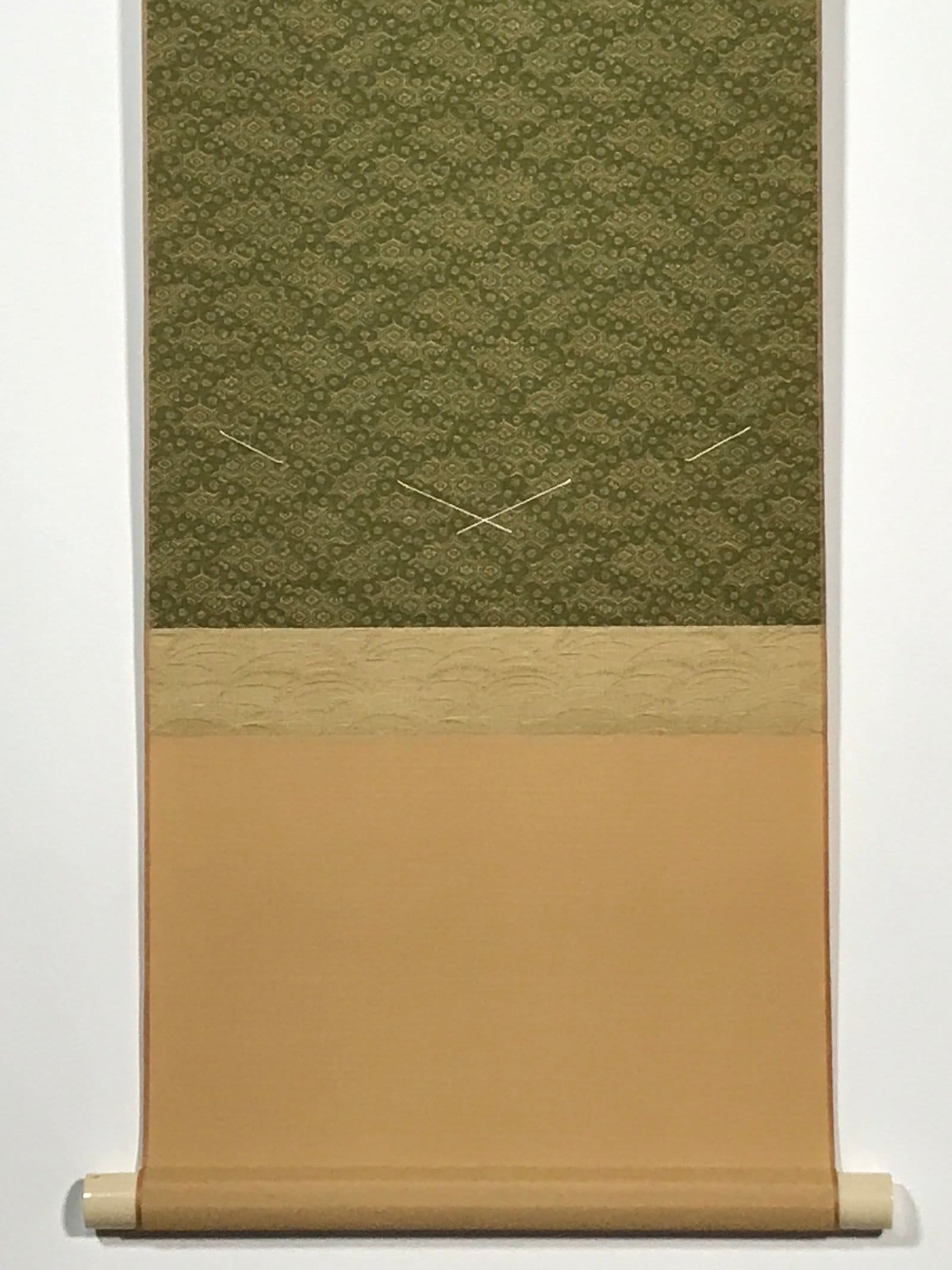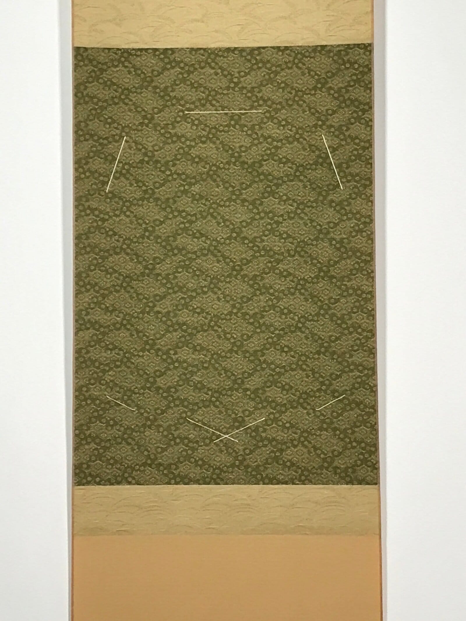 This vintage Japanese hanging scroll (kakejiku or makimono) is blank (no picture) and has thread holders. It can hold a shikishi-sized picture. This kakejiku features a floral green pattern at the center.
