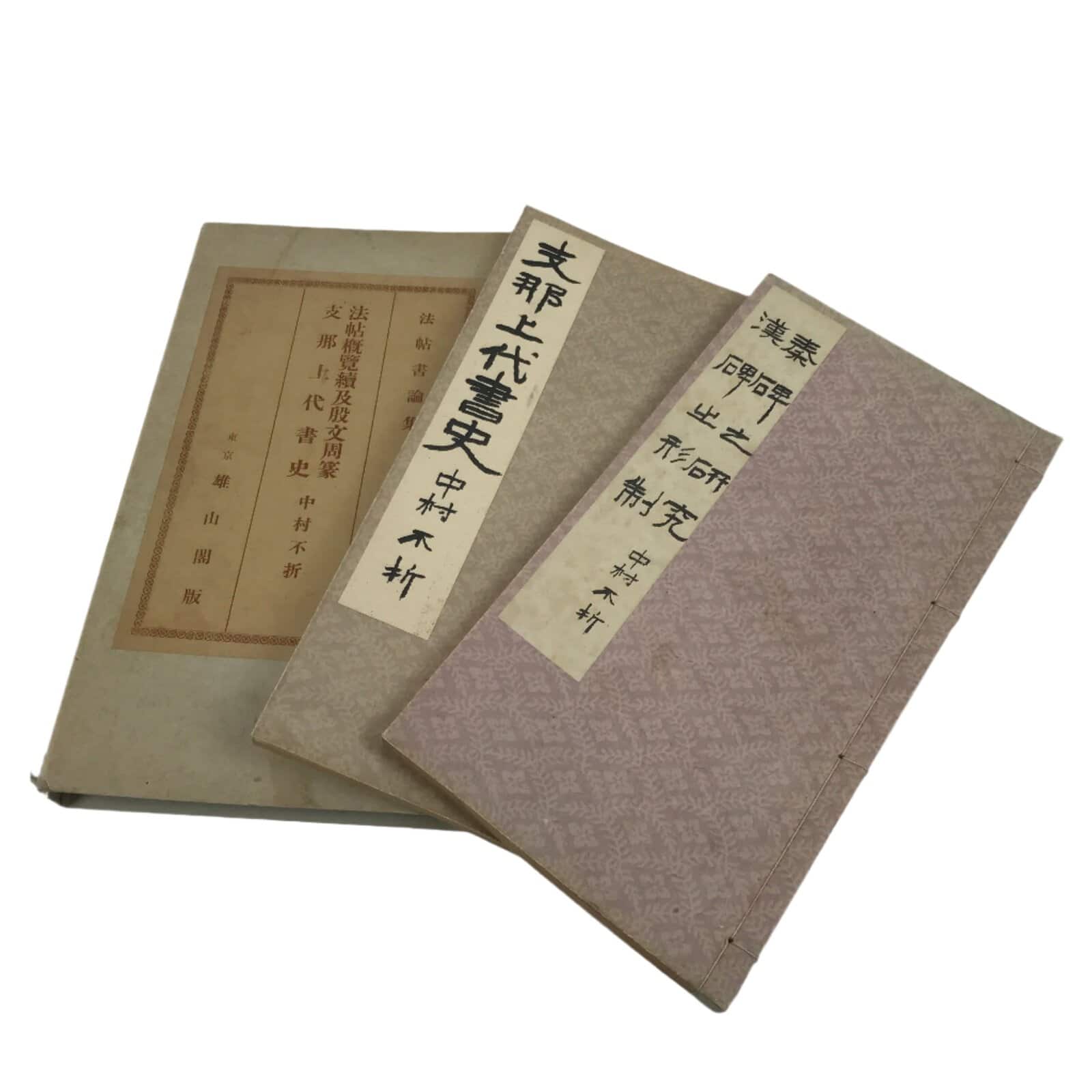 This vintage Japanese set of history books is about Ancient China. One book is about the apparition of Ancient Chinese writings and the other one is about Qin and Han stone monuments. The two books are written by Nakamura Fusetsu and were published in 1938 and 1939. The books are stored in a cardboard cover with a title on it but the books are slightly different from what is written on the cover.