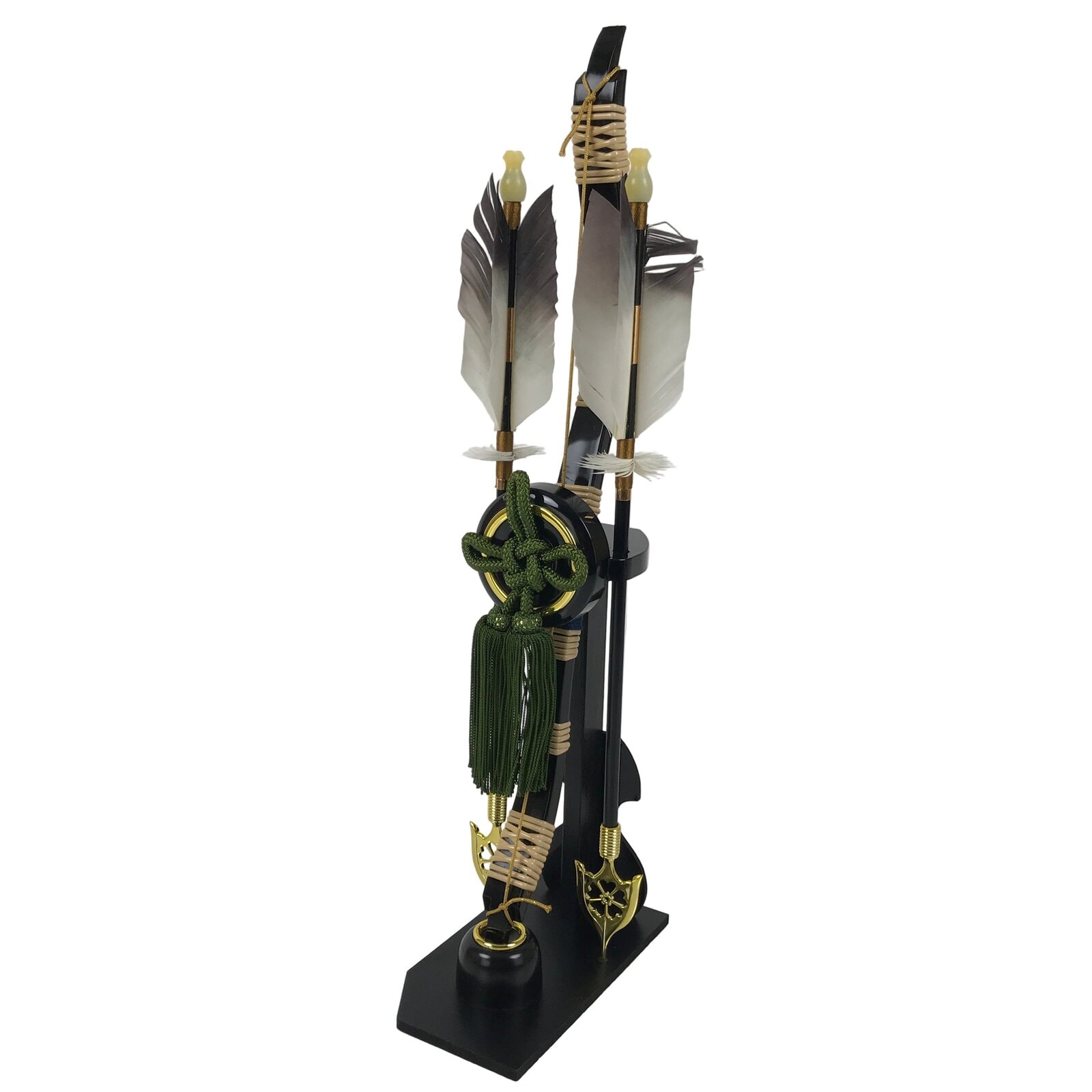This is a set of bows and arrow (Hamayumi) for display in one’s home. Hamayumi is said to ward off evil spirits from the house and bring fortune. It is also a talisman for the healthy growth of children and is often displayed during the Boys’ Day Festival (Children’s Day) every May. It is a combination of black and gold colors as well as a green braided cord and tassel on the front.