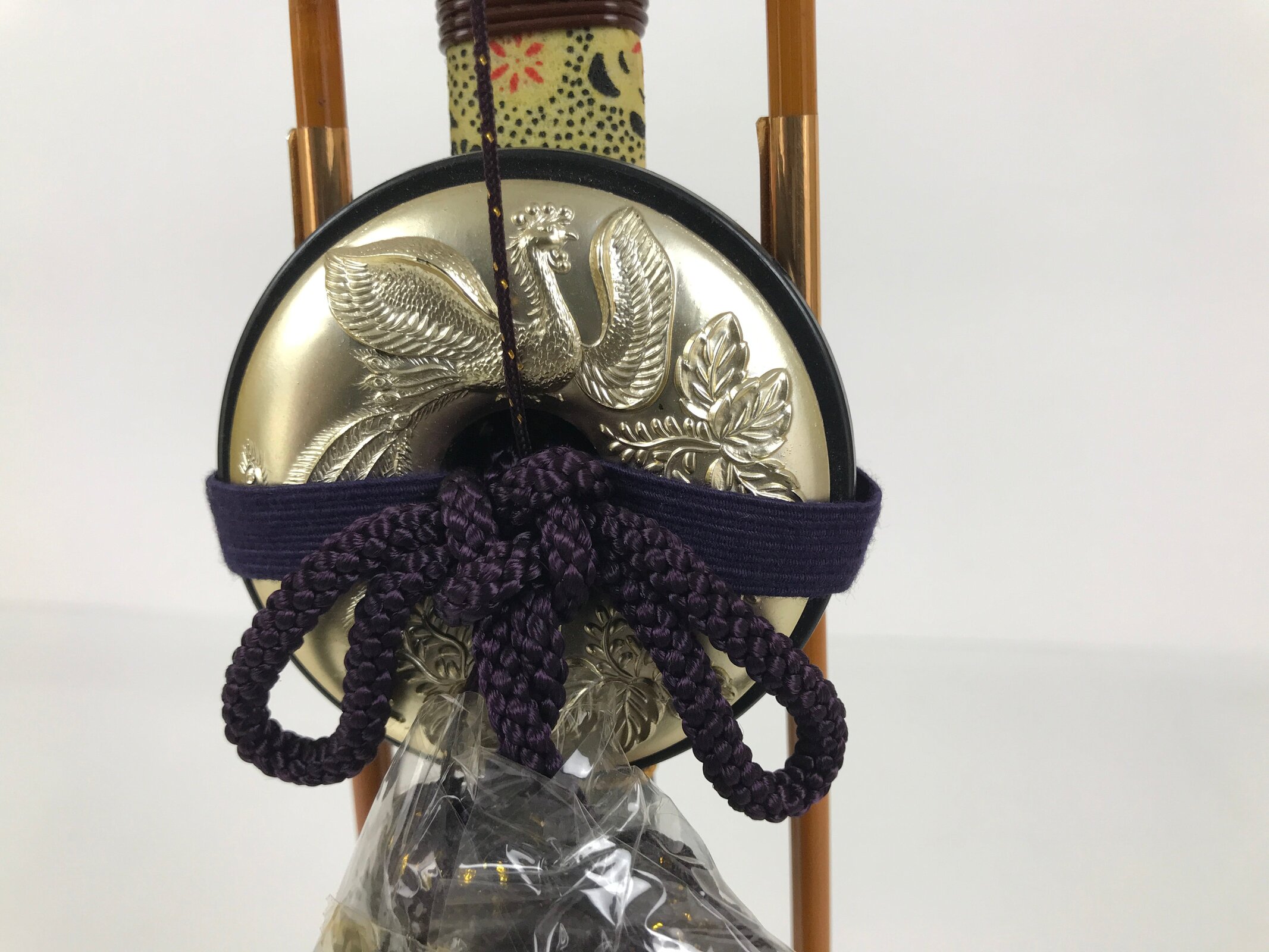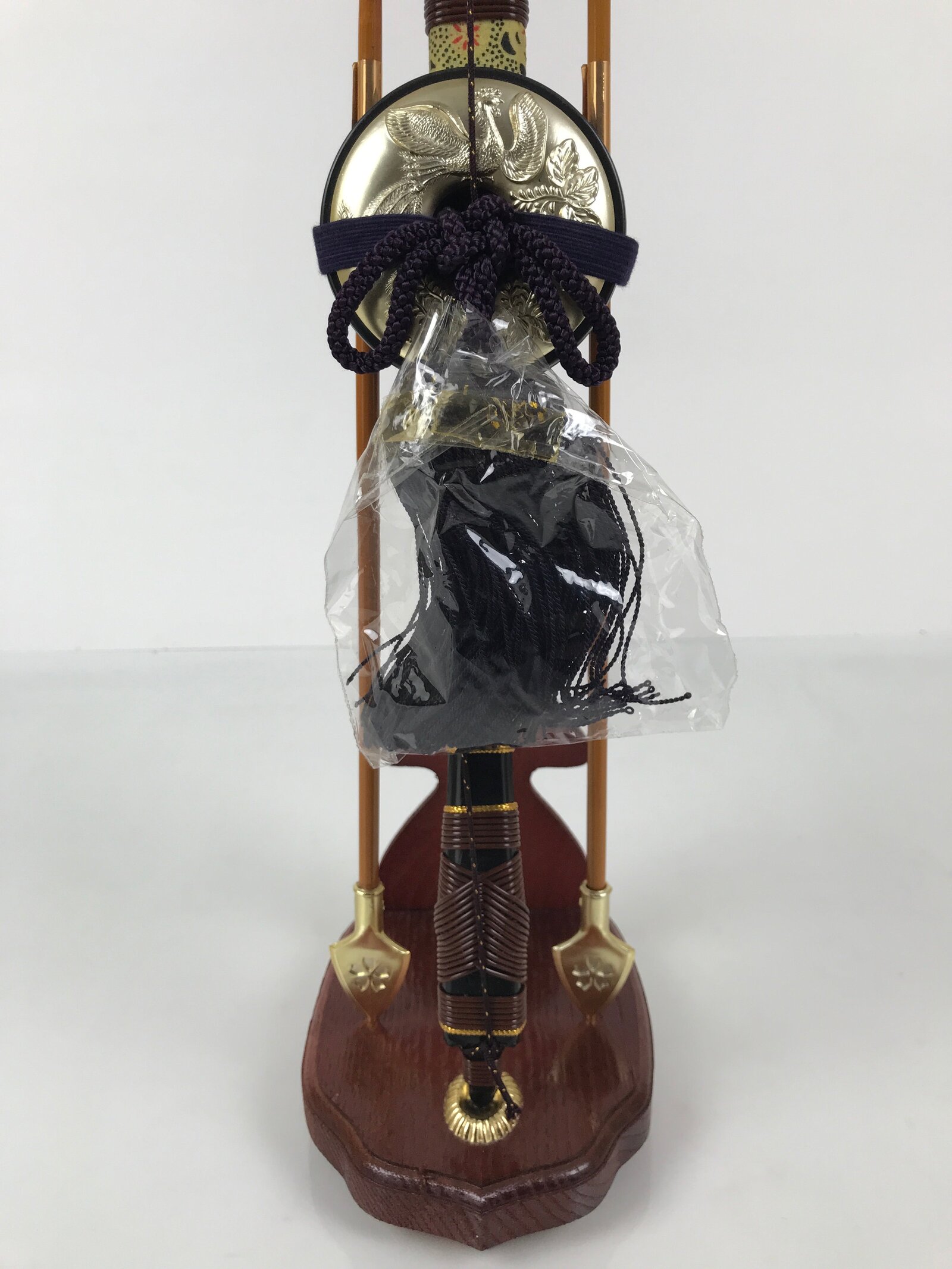 This set features a bow with arrows (Hamayumi) for display in one’s home. Hamayumi is said to ward off evil spirits from the house and bring fortune. It is also a talisman for the healthy growth of children and is often displayed during the Boys’ Day Festival (Children’s Day) every May. It may complement the kabuto helmet often displayed during that holiday. This set features a combination of black and brown with golden details, along with a deep purple braided cord and tassel on the front. This item comes in a cardboard box.