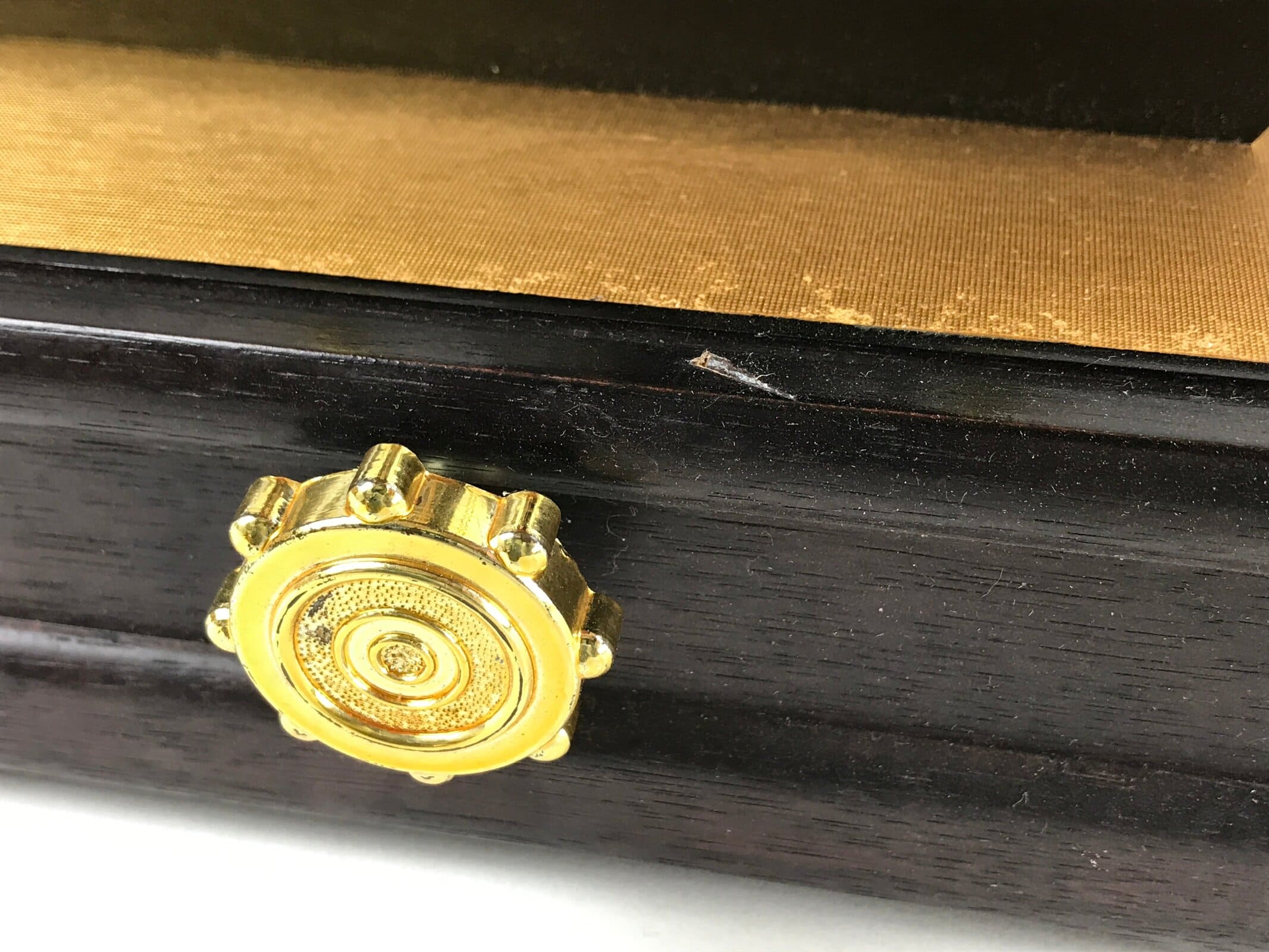 This piece contains a built-in music box that sounds when the gold knob on the front is turned