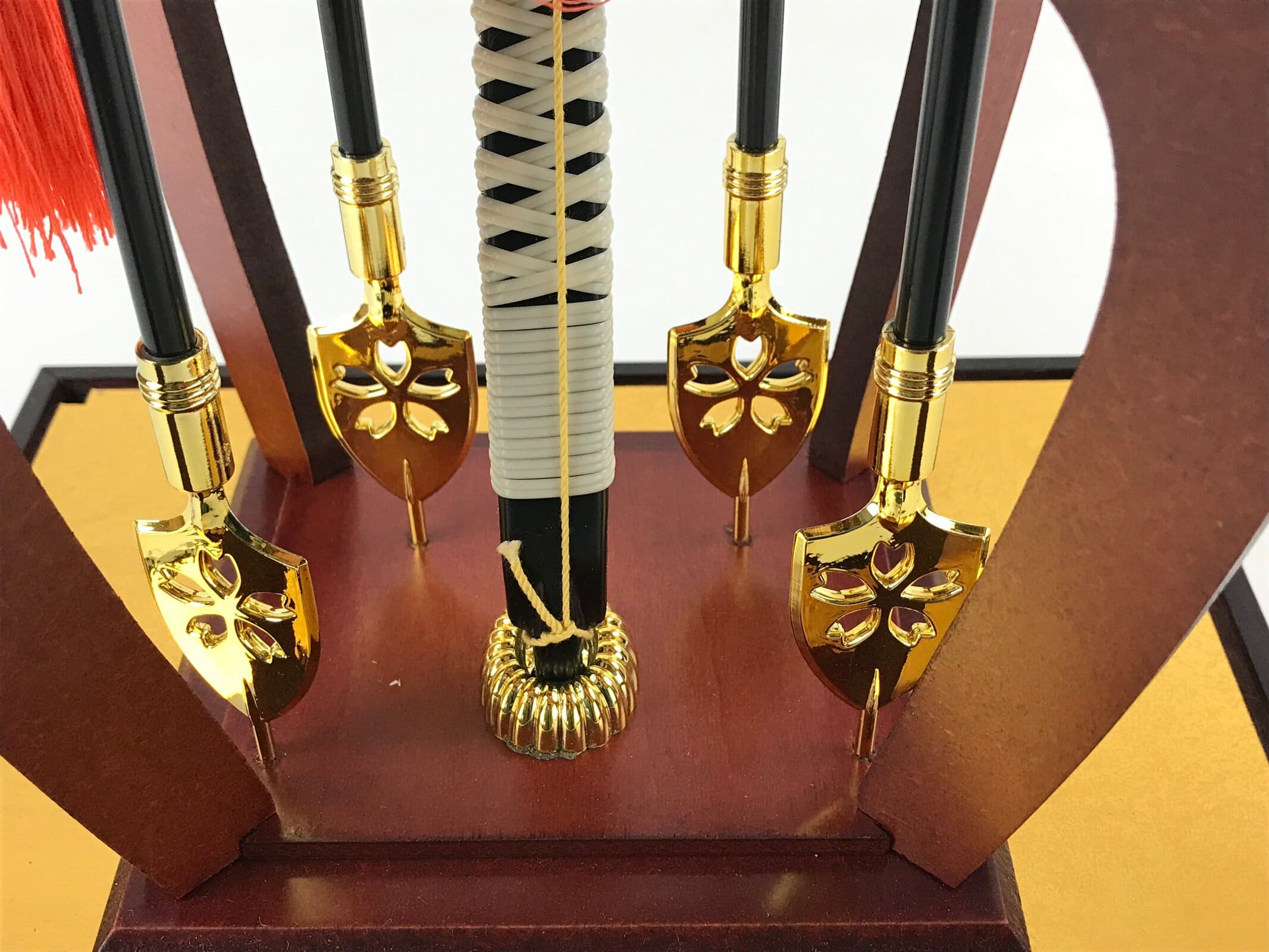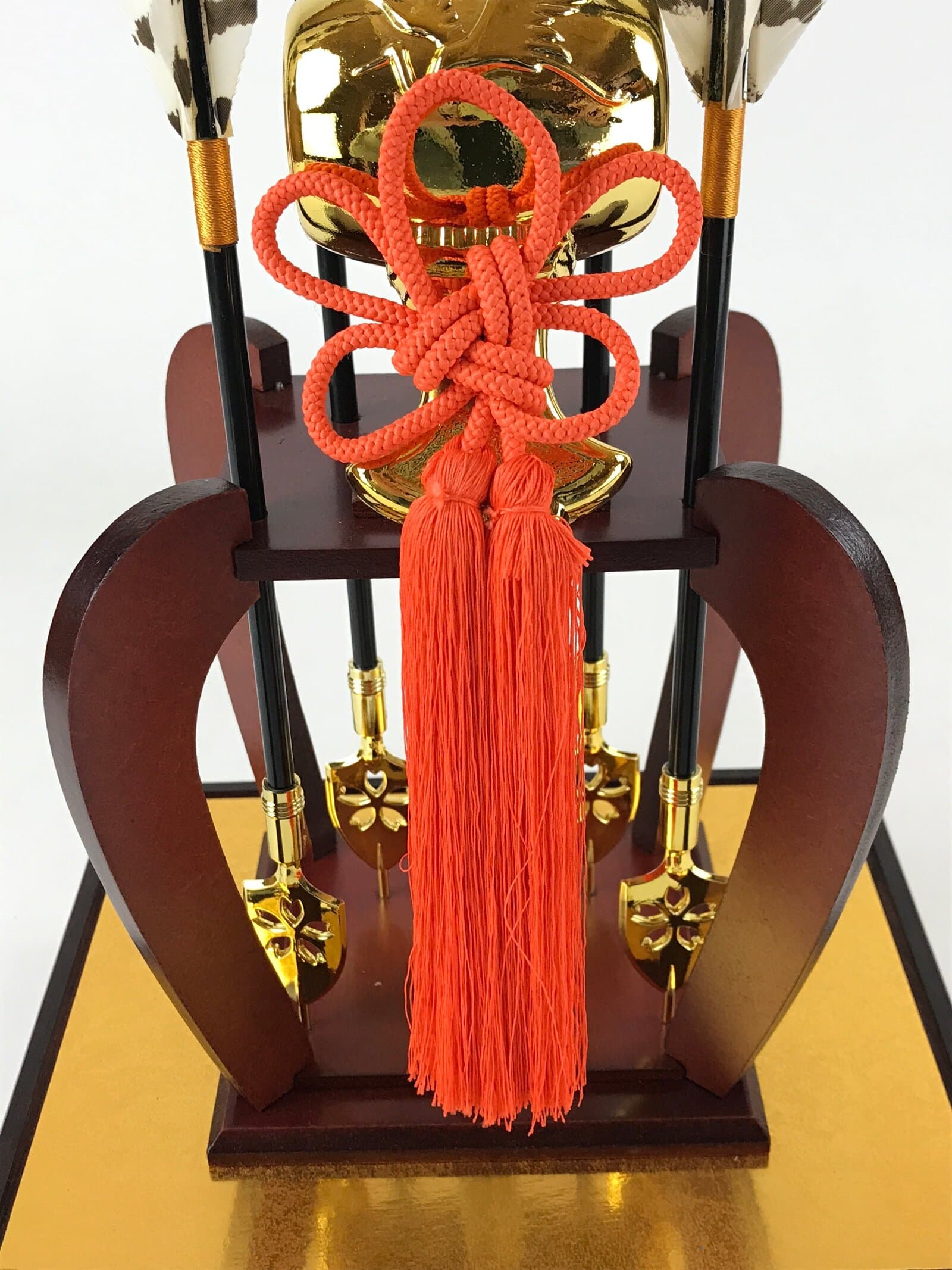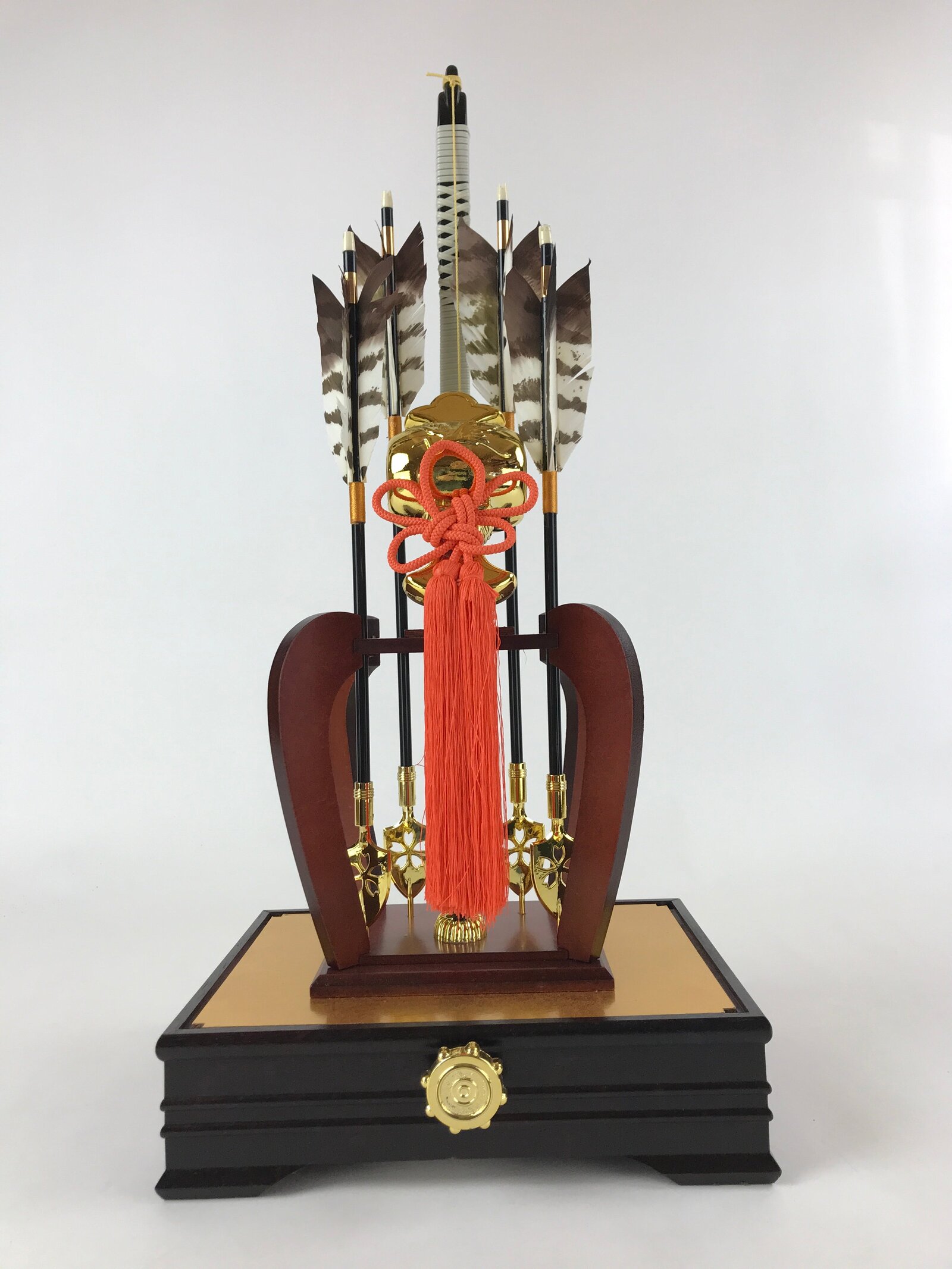 This is a set of bow, arrows, and a lucky gavel (Hamayumi) for display in one’s home. Hamayumi is said to ward off evil spirits from the house and bring fortune. It is also a talisman for the healthy growth of children and is often displayed during the Boys’ Day Festival (Children’s Day) every May. It is a combination of gold, black, and brown wood colors as well as a green silk handle on the bow and a bright orange tassel. There is a groove on the platform to place a glass case (not included).