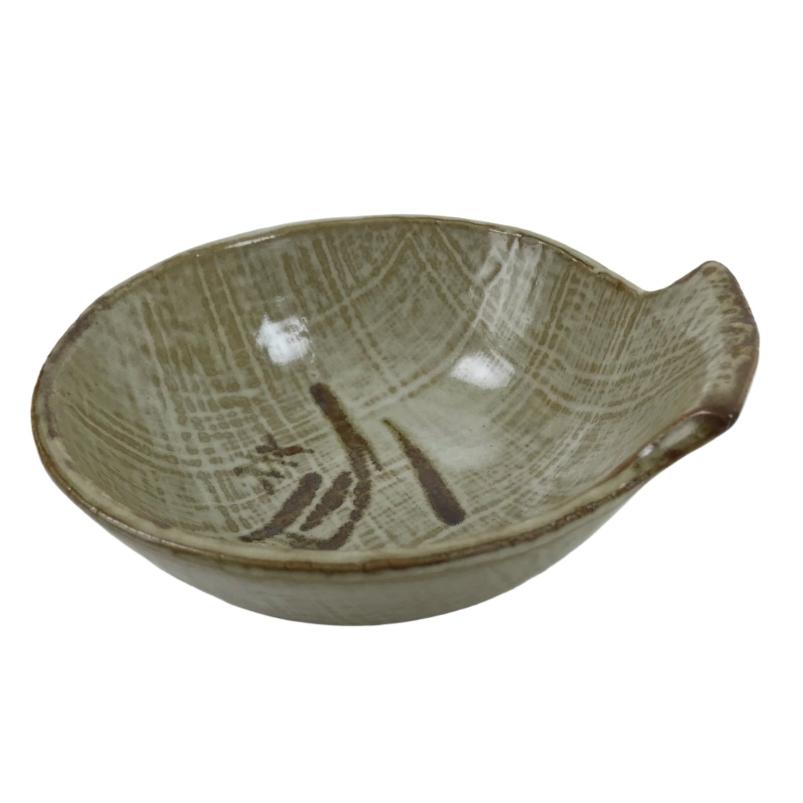 This vintage Japanese ceramic small bowl (kobachi) is light brown and white with a brown spike of rice at the center. This type of bowl is generally used for retrieving food from nabe hot pot, shabu shabu, or other shared dishes. It is to catch any drips or be used as a dipping bowl (as in the case of shabu shabu). The tapered part of the rim is to grip like a handle for easy lifting and maneuvering at the dining table.