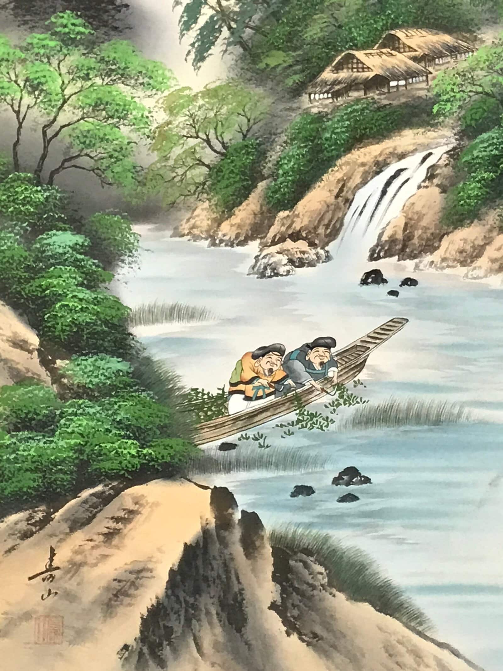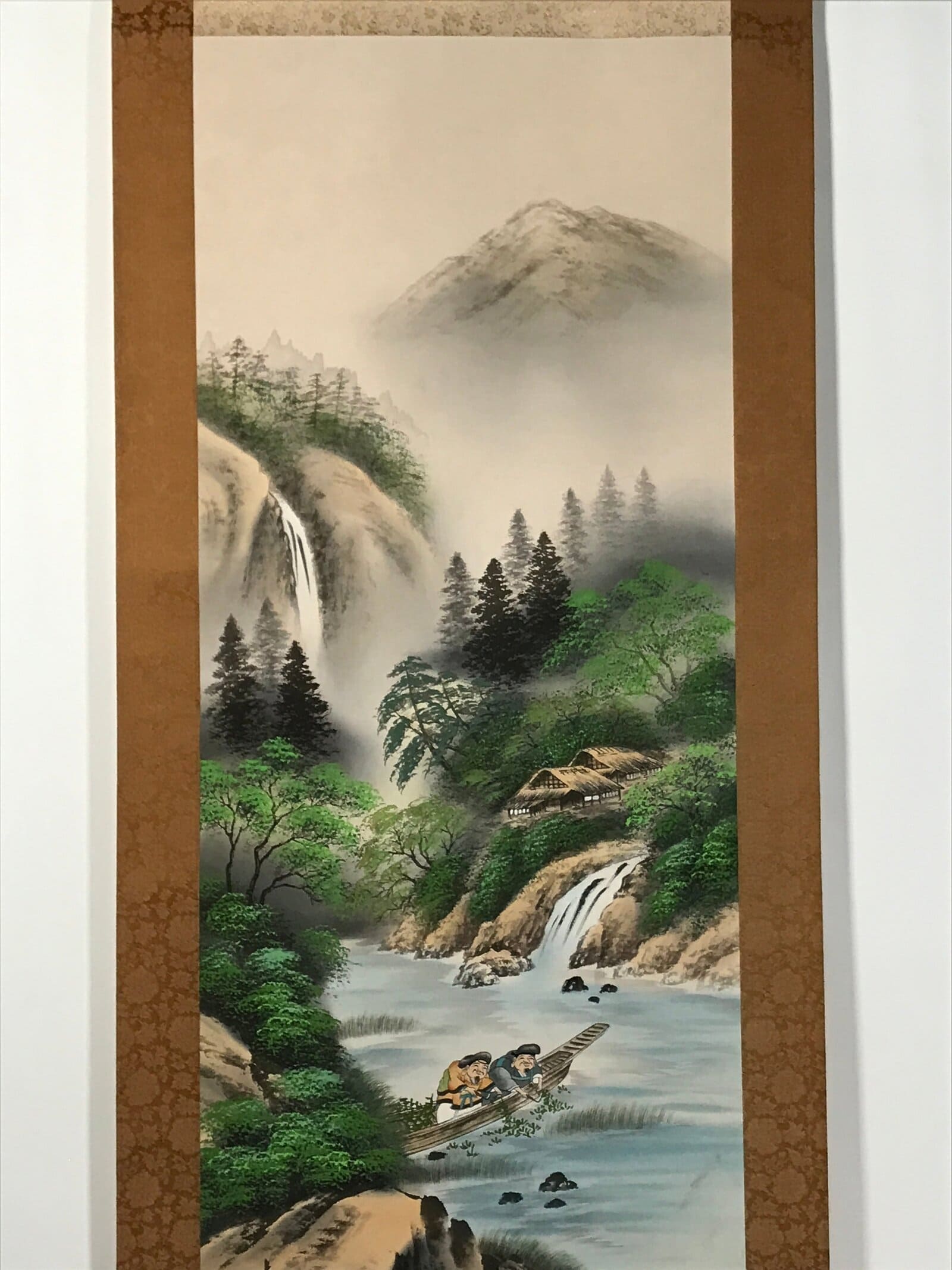 This vintage Japanese boxed hanging scroll (called kakejiku or makimono) features two men on a boat collecting river-weed plants. There is a high mountain in the background, and some houses and waterfalls. Various types of trees are also painted. This type of kakejiku is called sansui, literally mountains and water. It is painted in color, mostly green, brown, and blue. This piece is signed with a name and a red seal. The box has inscriptions on the outside and the inside of the lid.