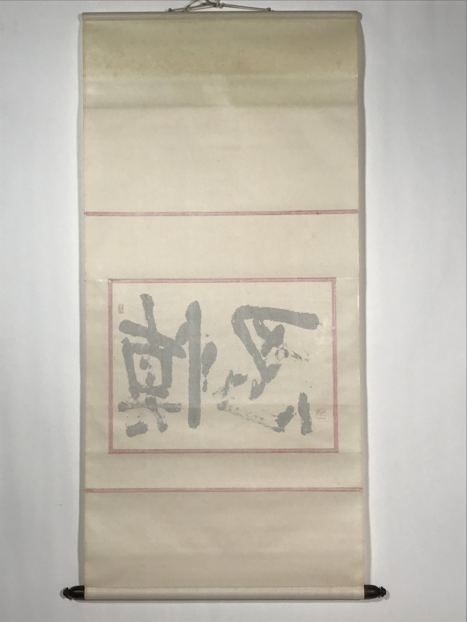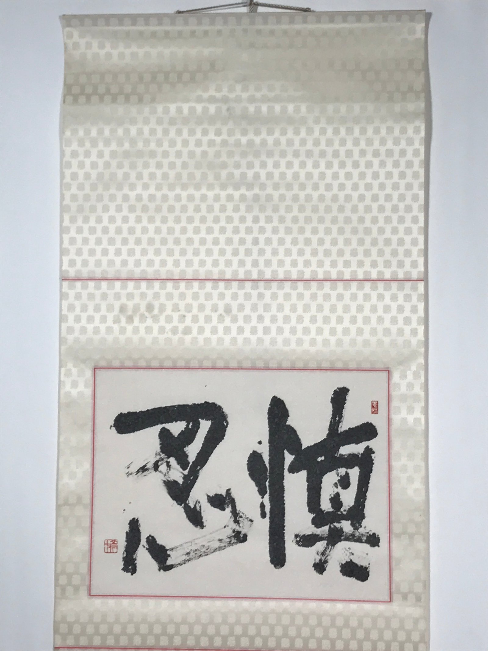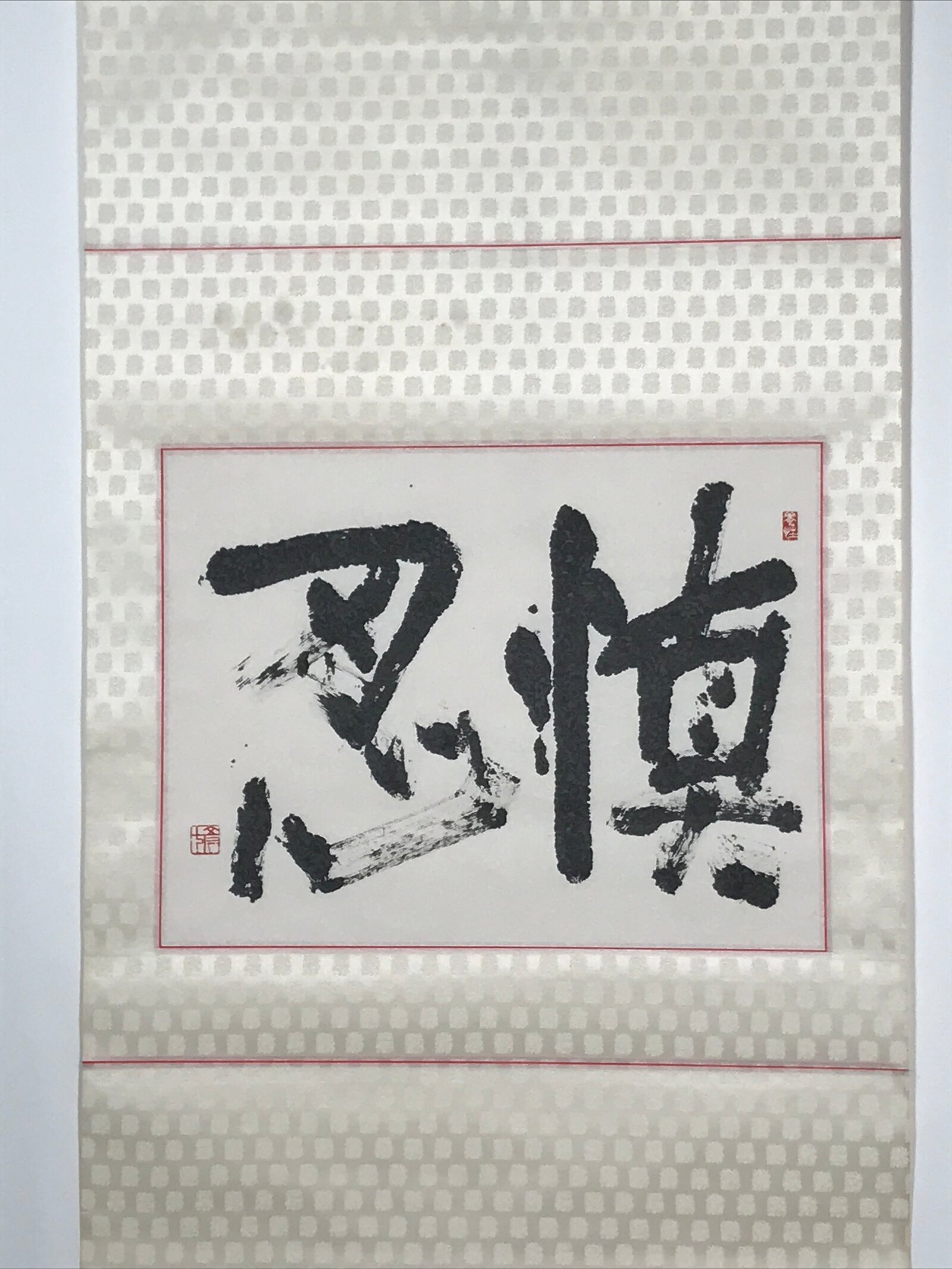 This vintage Japanese hanging scroll (kakejiku or makimono) features monochrome calligraphy with two big Japanese characters which says Shin Nin meaning endure and abstain. This piece is signed with red seals. It is stored in a wooden box.