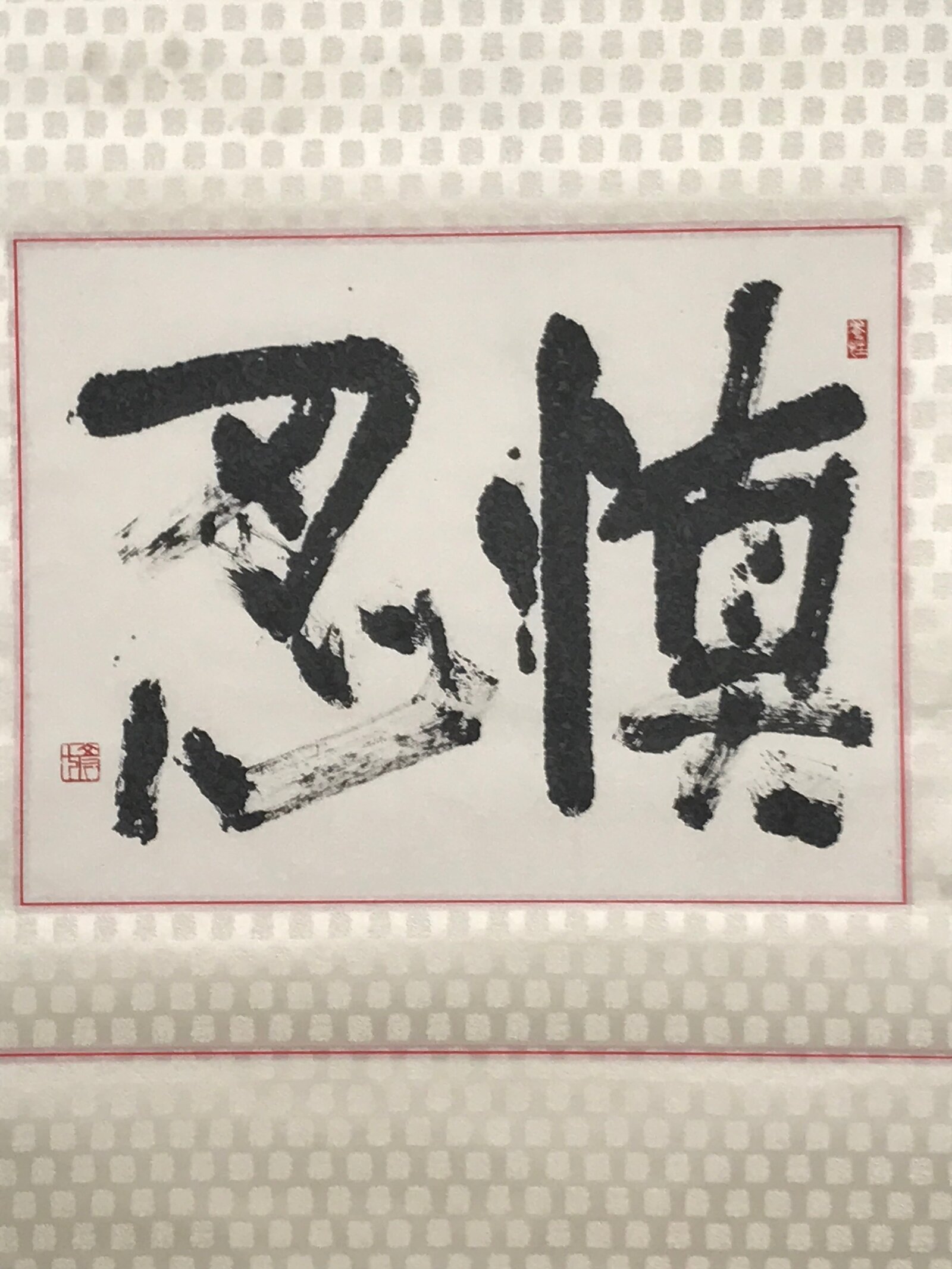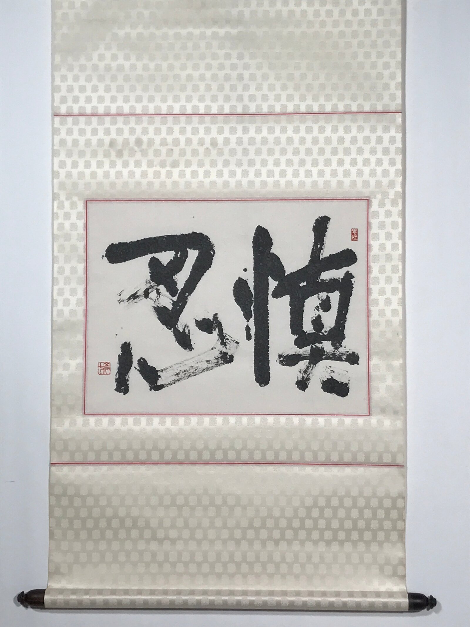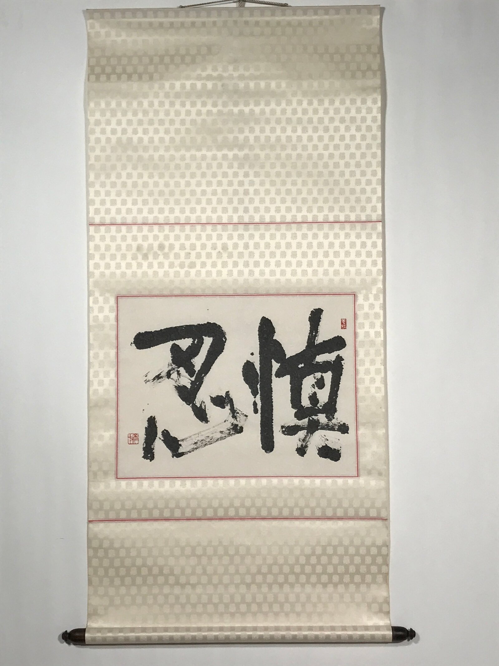 This vintage Japanese hanging scroll (kakejiku or makimono) features monochrome calligraphy with two big Japanese characters which says Shin Nin meaning endure and abstain. This piece is signed with red seals. It is stored in a wooden box.