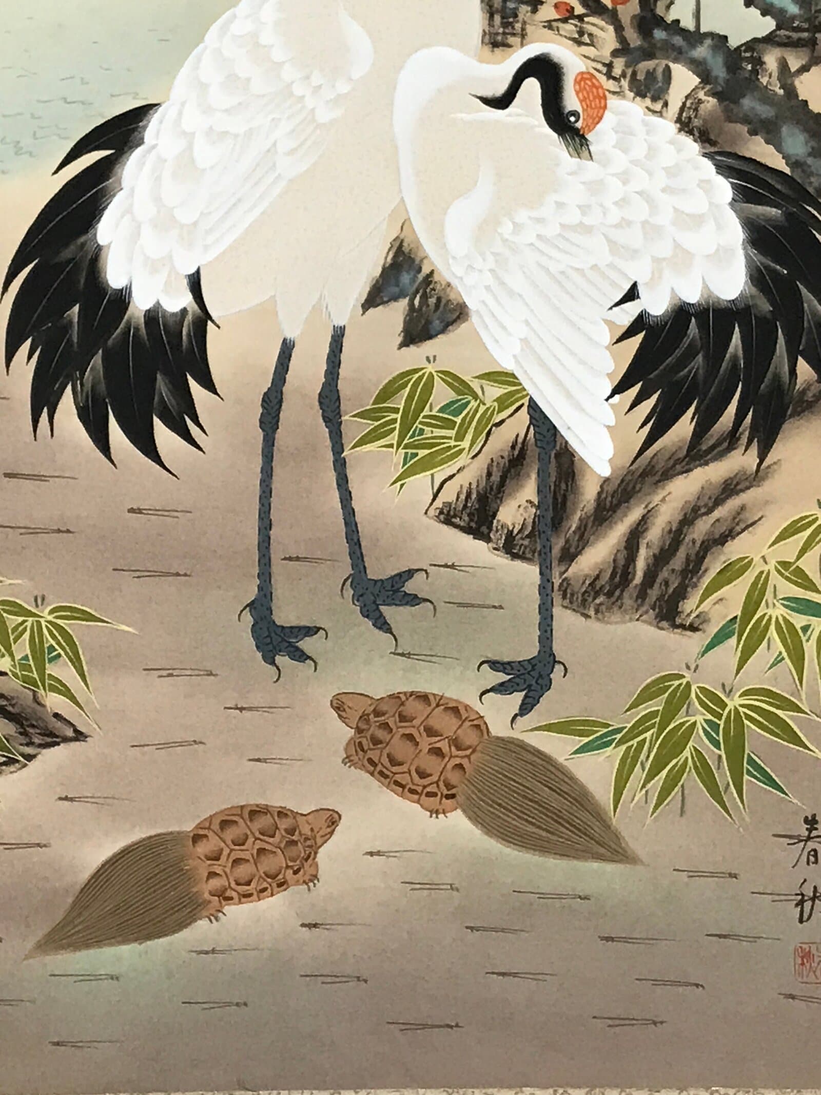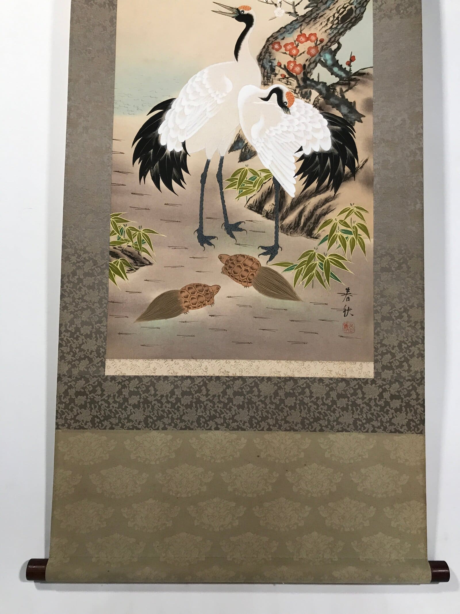This vintage Japanese boxed hanging scroll (kakejiku or makimono) features two cranes standing next to a pine tree and plum trees bearing red and white blossoms. There are two turtles in the foreground and a rising red sun in the background. This piece is signed with a name and a red seal. The box has inscriptions on the outside and the inside of the lid.