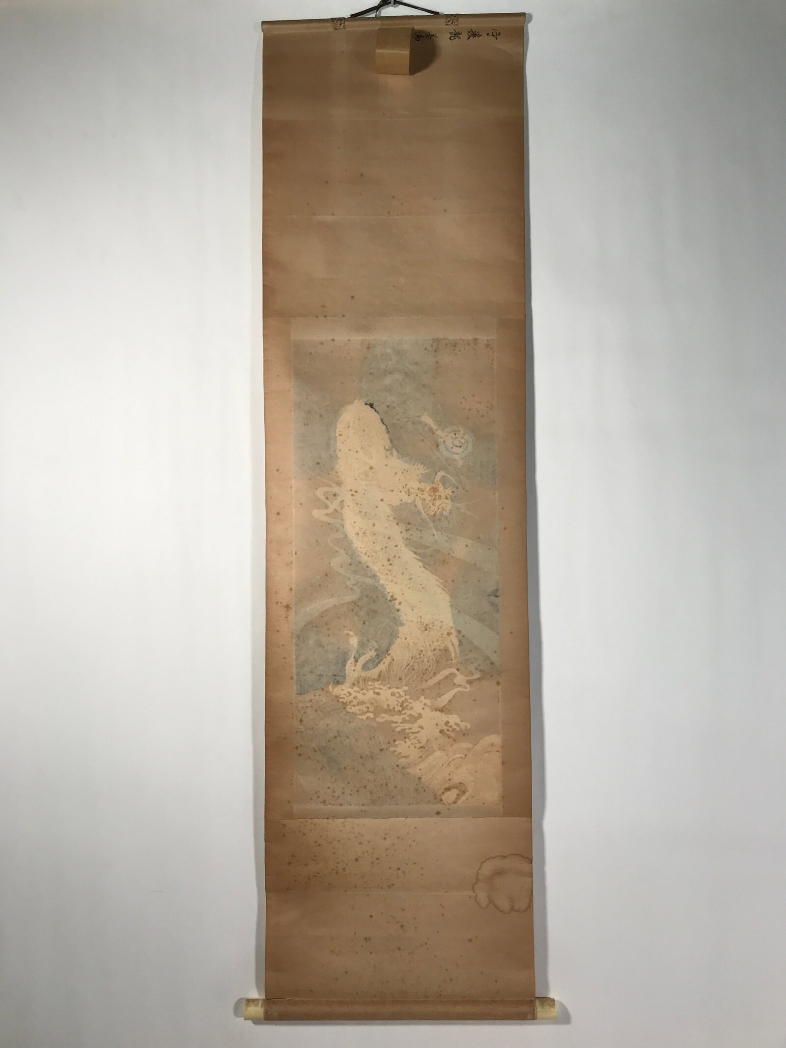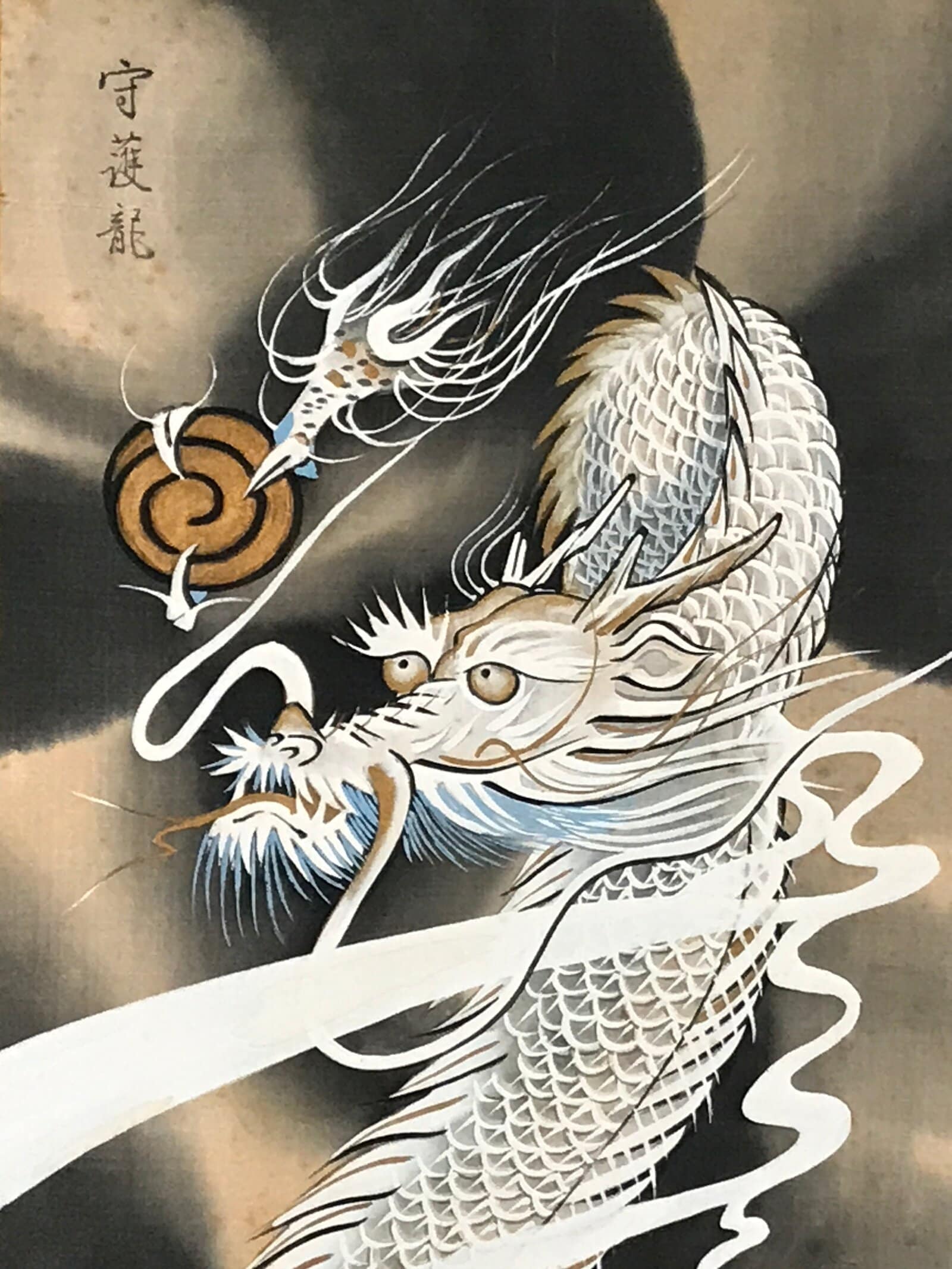 This vintage Japanese hanging scroll (kakejiku or makimono) features a picture of a white dragon holding a ball. The piece is painted using only three colors: white, black, and gold. Yet, it is a very powerful image. This piece is titled, signed, and has a red seal. The title is written on the outside of the scroll. The wooden box has inscriptions and a label on the outside and the inside of the lid.