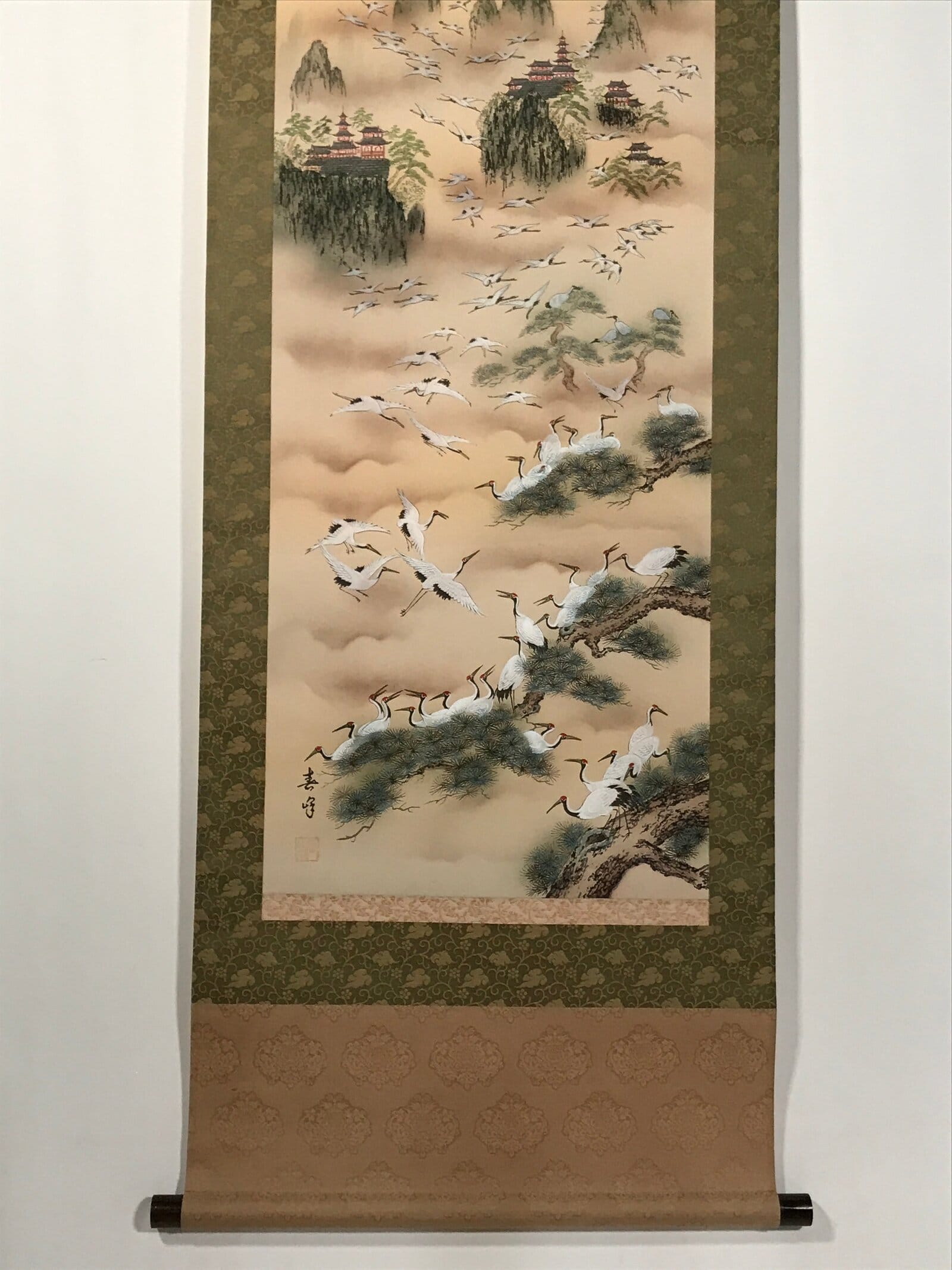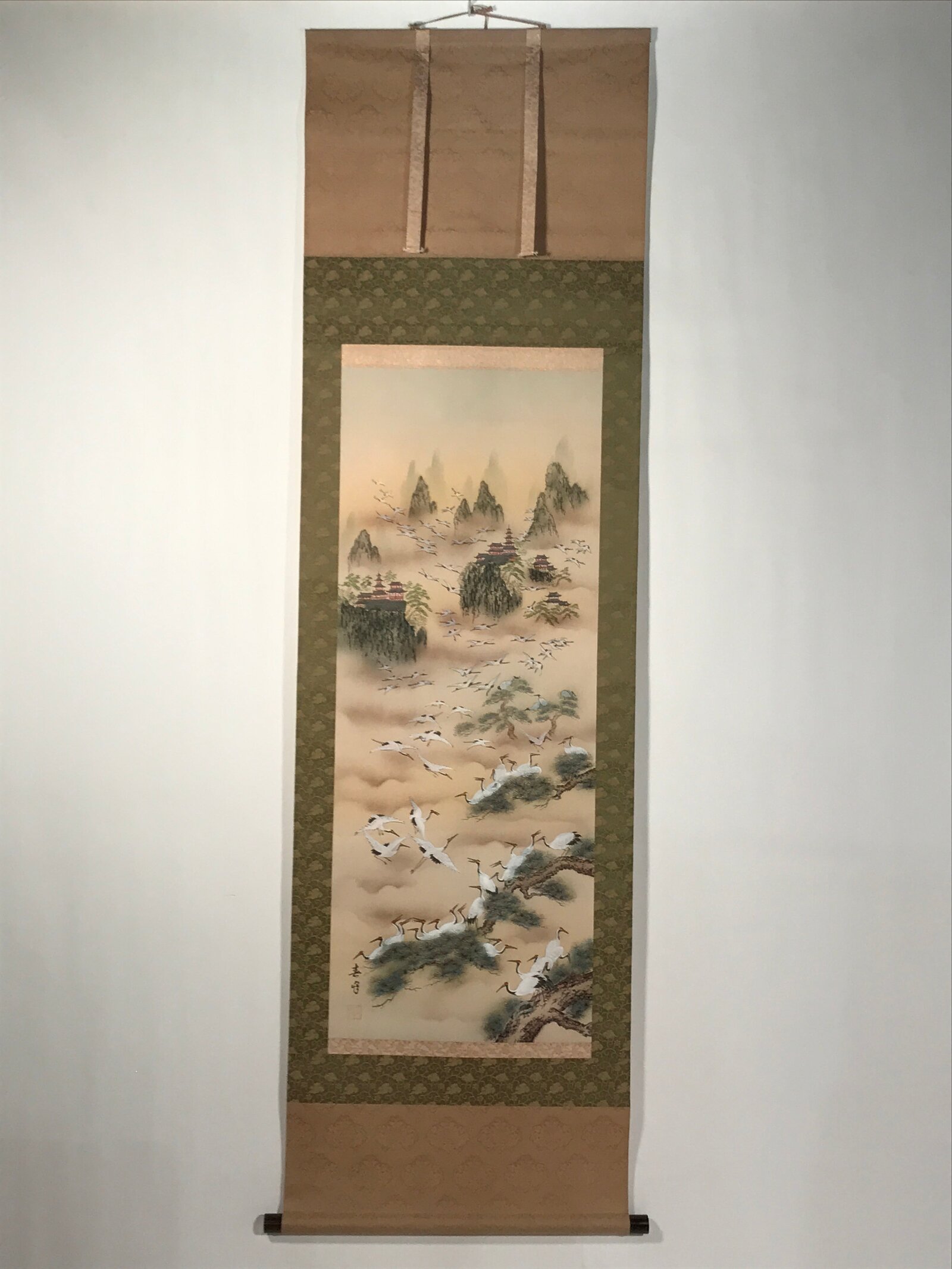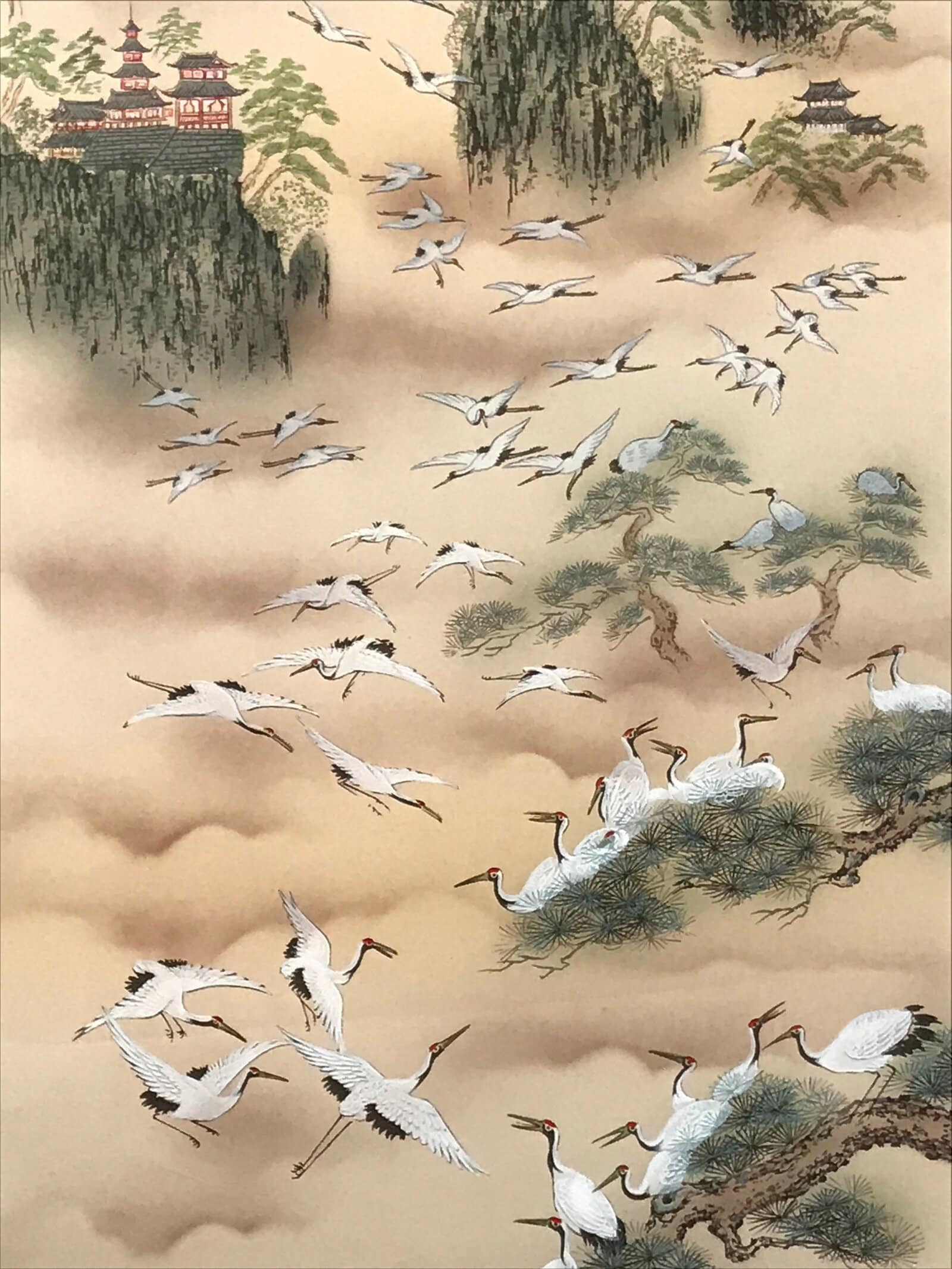 January 24, 2026Japanese Boxed Hanging Scroll Vtg Kakejiku Hundred Cranes Flying Temples KJ153