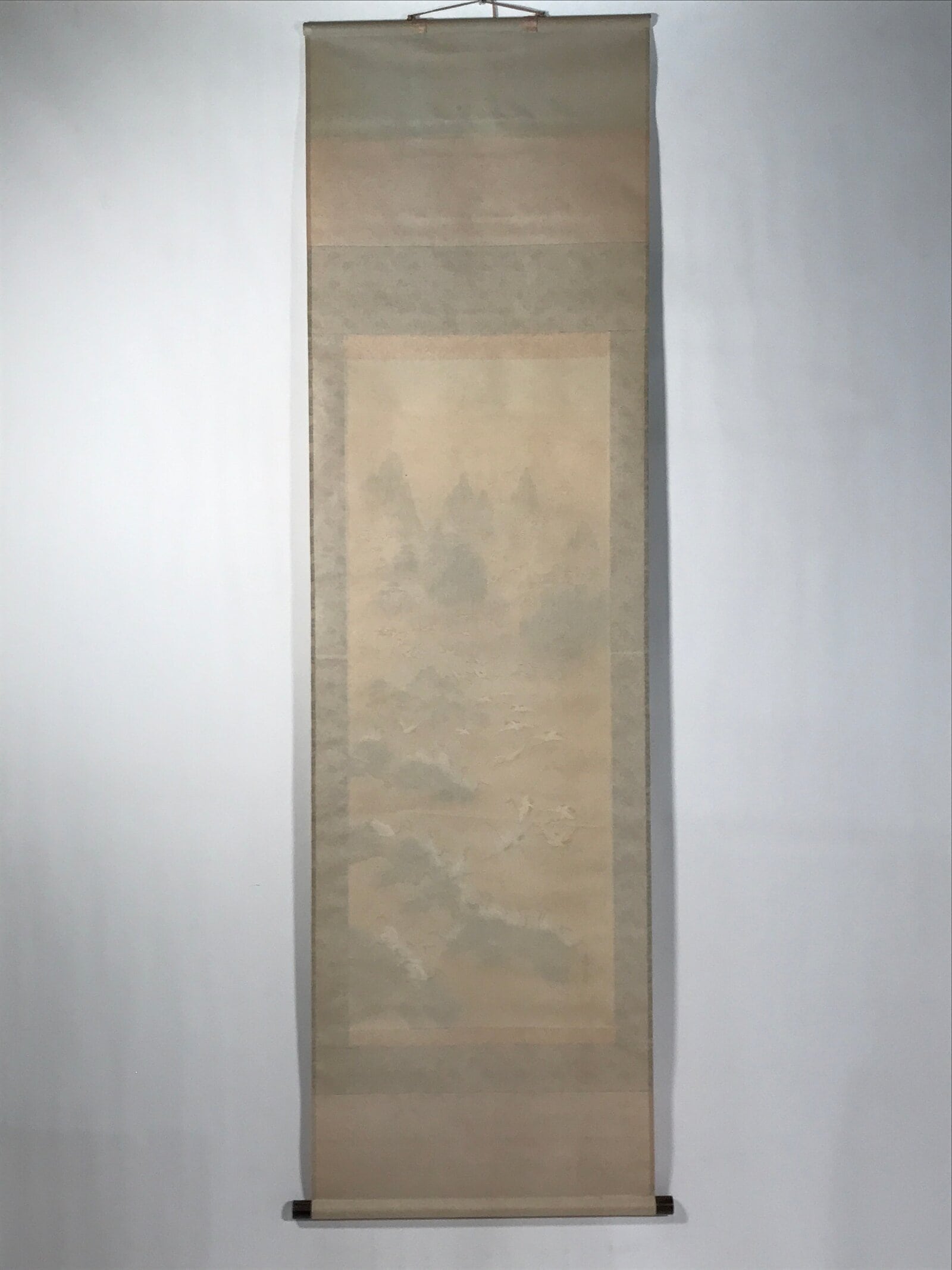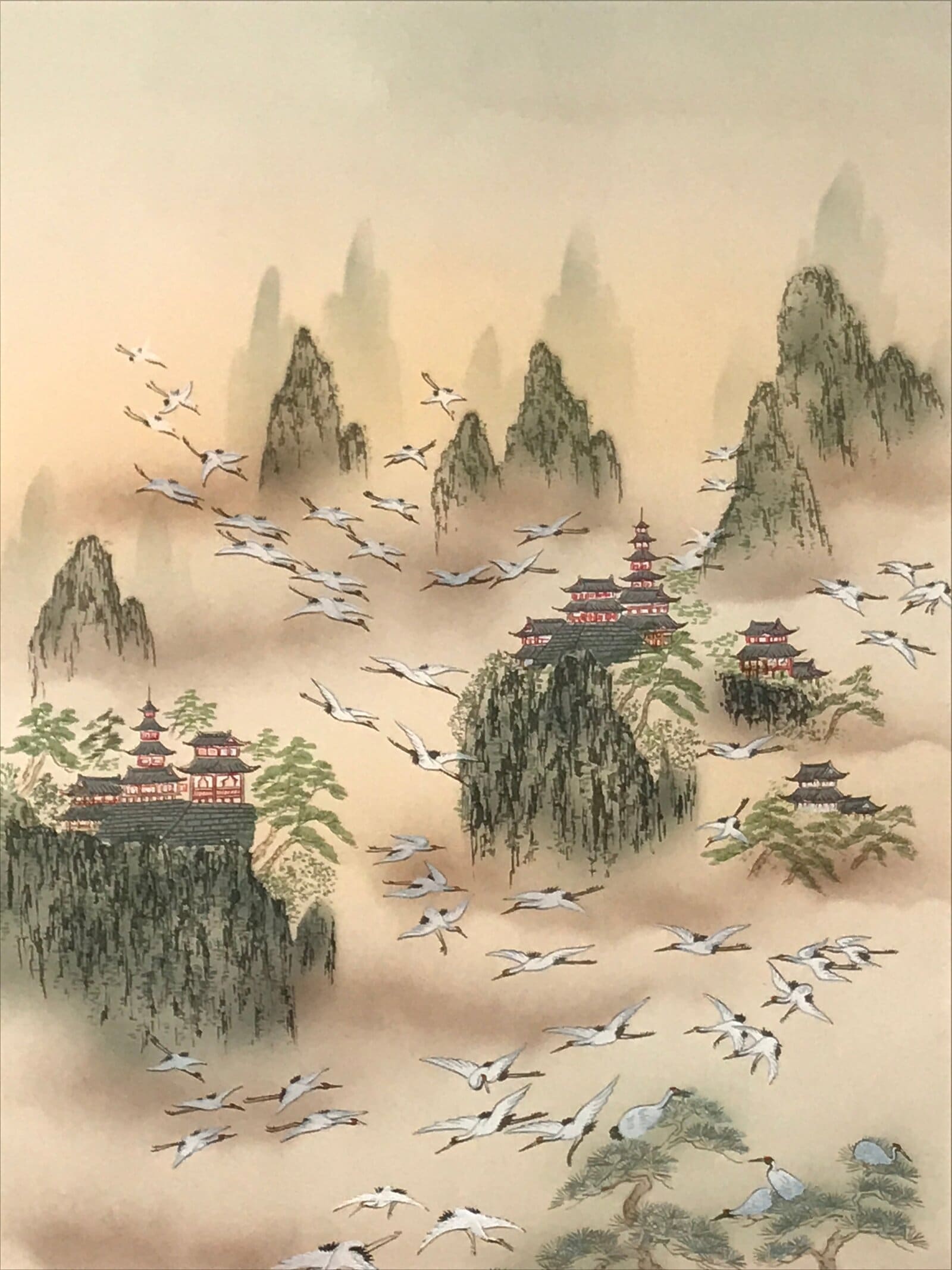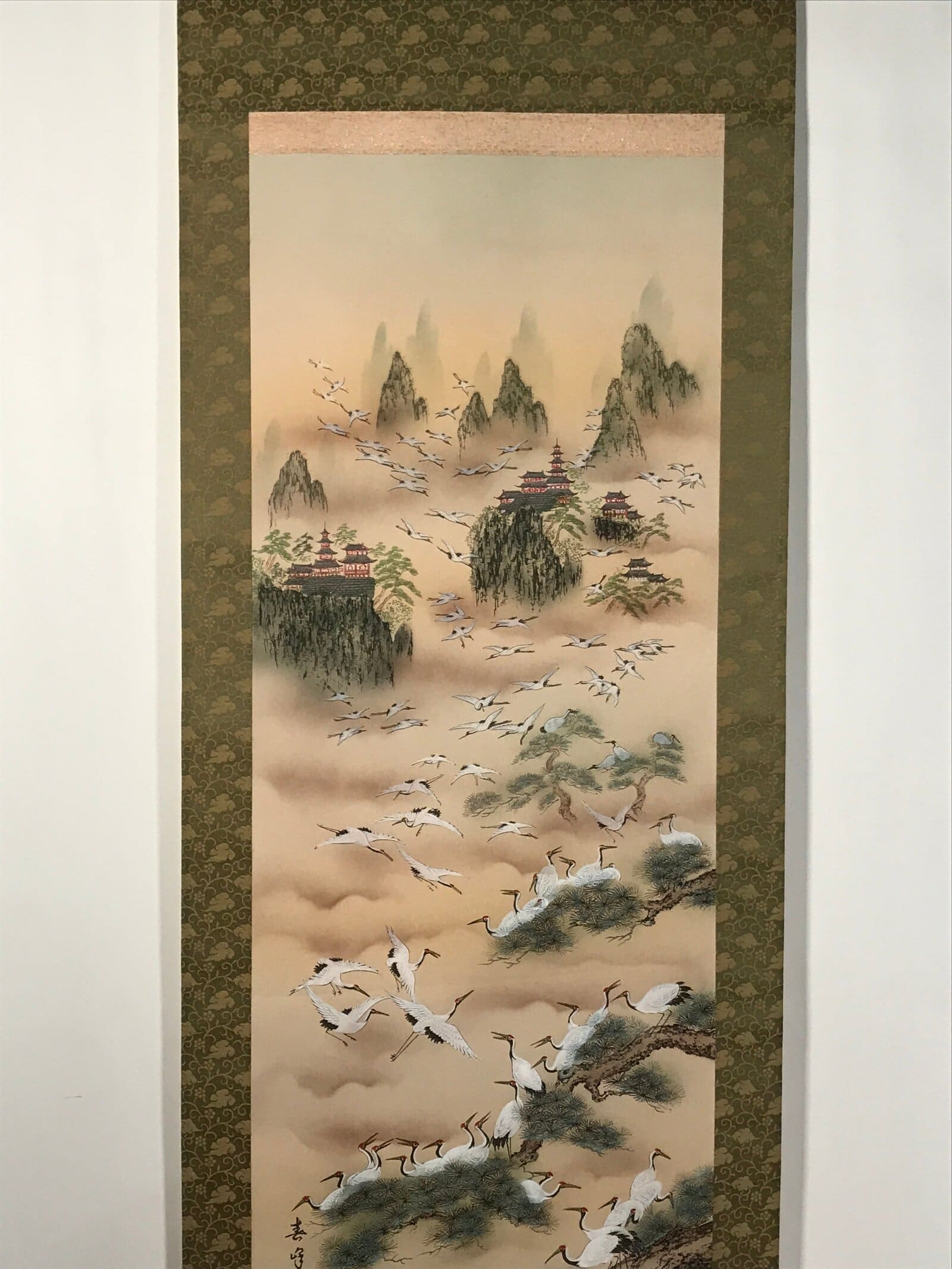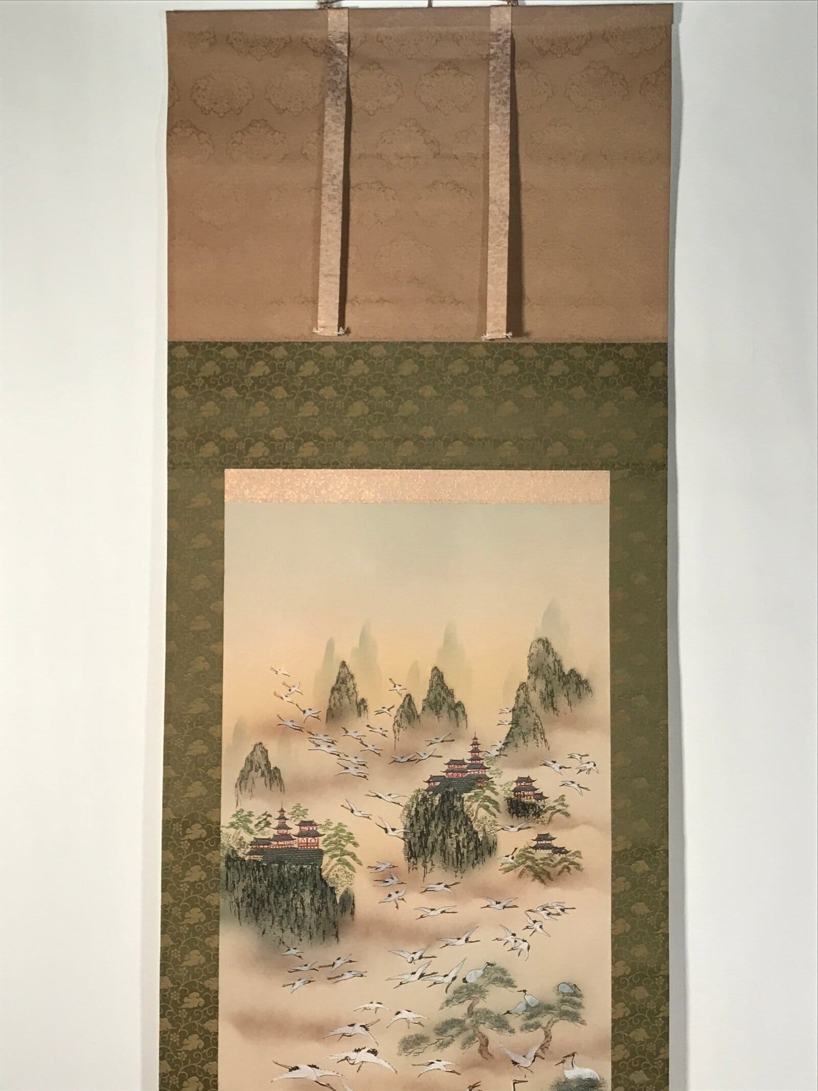 January 24, 2026Japanese Boxed Hanging Scroll Vtg Kakejiku Hundred Cranes Flying Temples KJ153