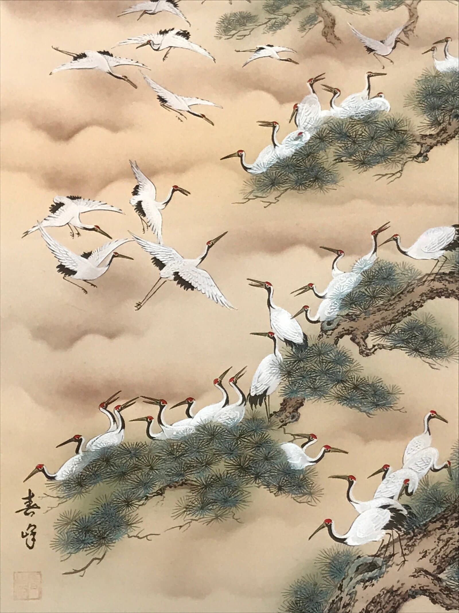 This vintage Japanese boxed hanging scroll (kakejiku or makimono) is titled ‘A Hundred Cranes’ and features a hundred cranes flying above a mountain landscape. Some cranes are resting on standing pine trees in the foreground. The mountains in the background resemble those in China, and some buildings on top of the mountains are also painted. This piece is signed with a name and a red seal. The box has inscriptions on the outside and the inside of the lid.