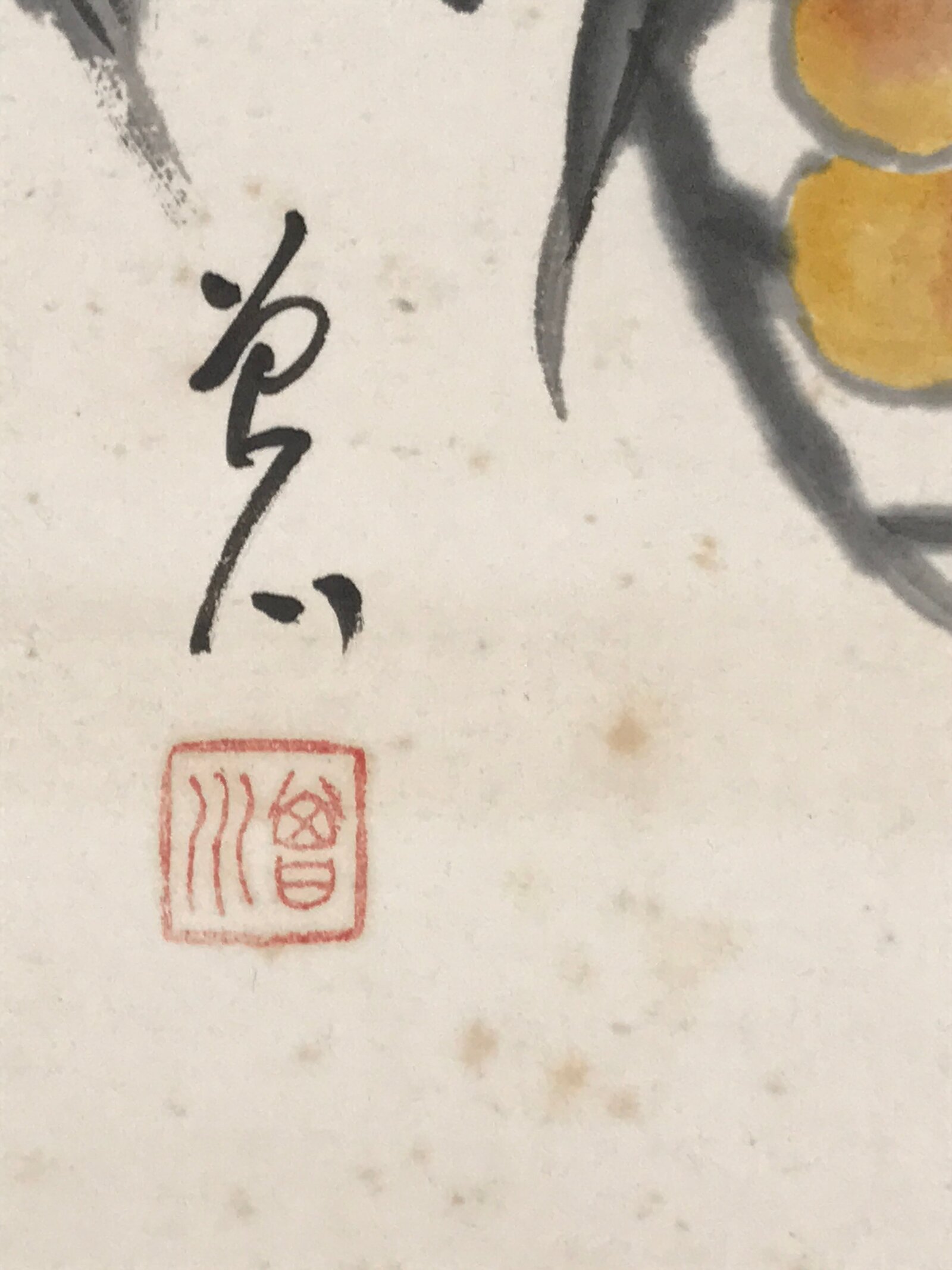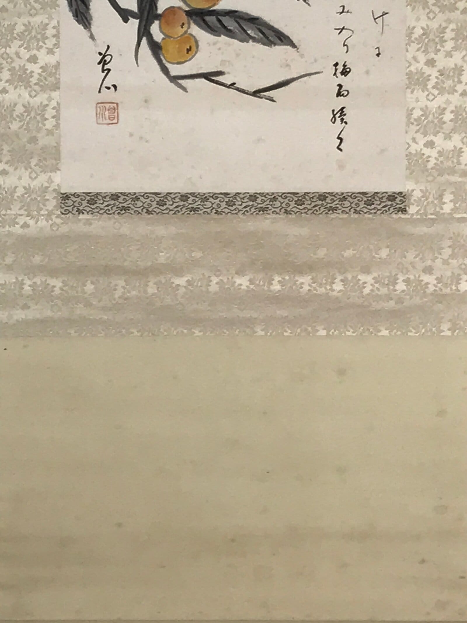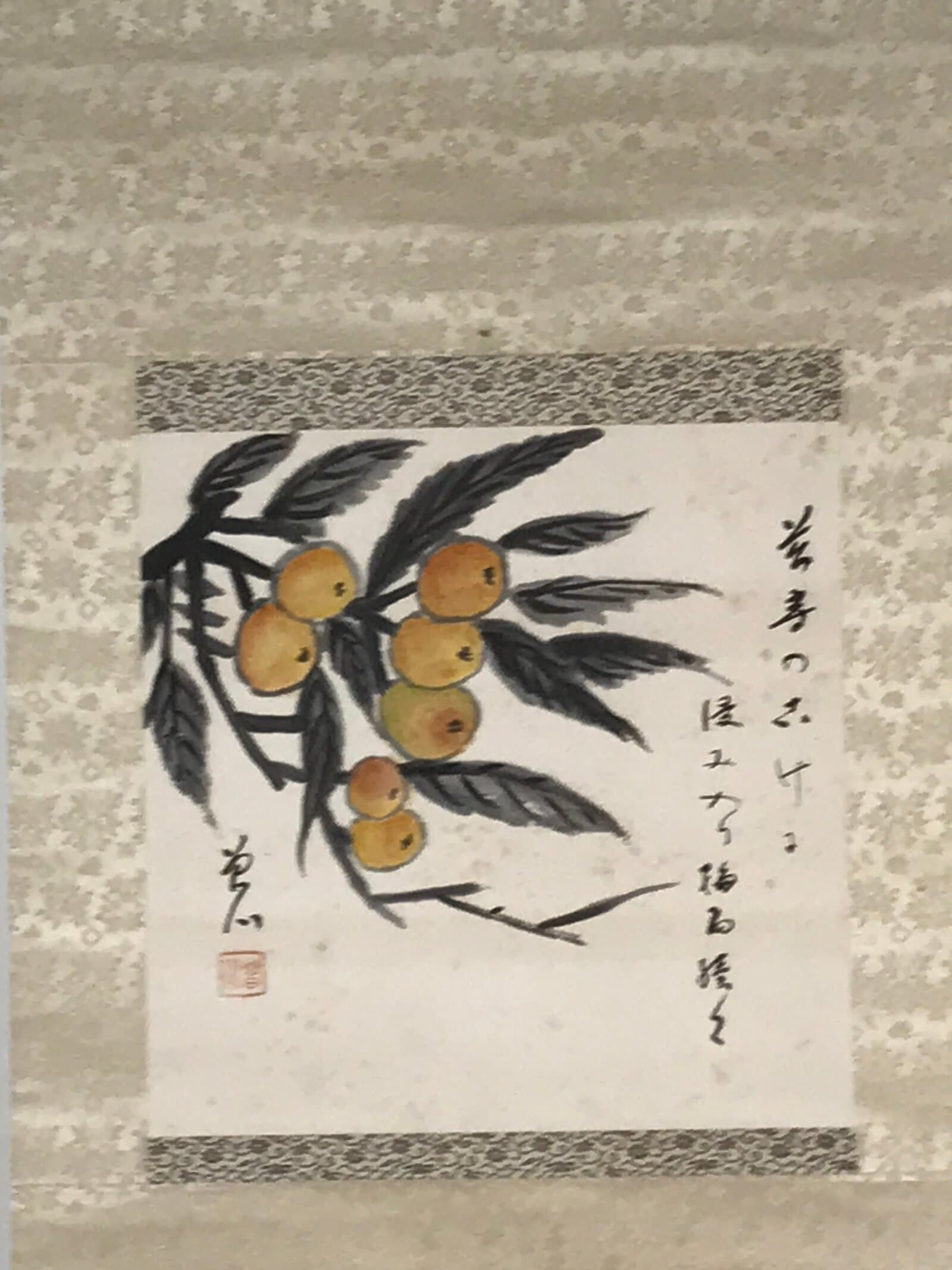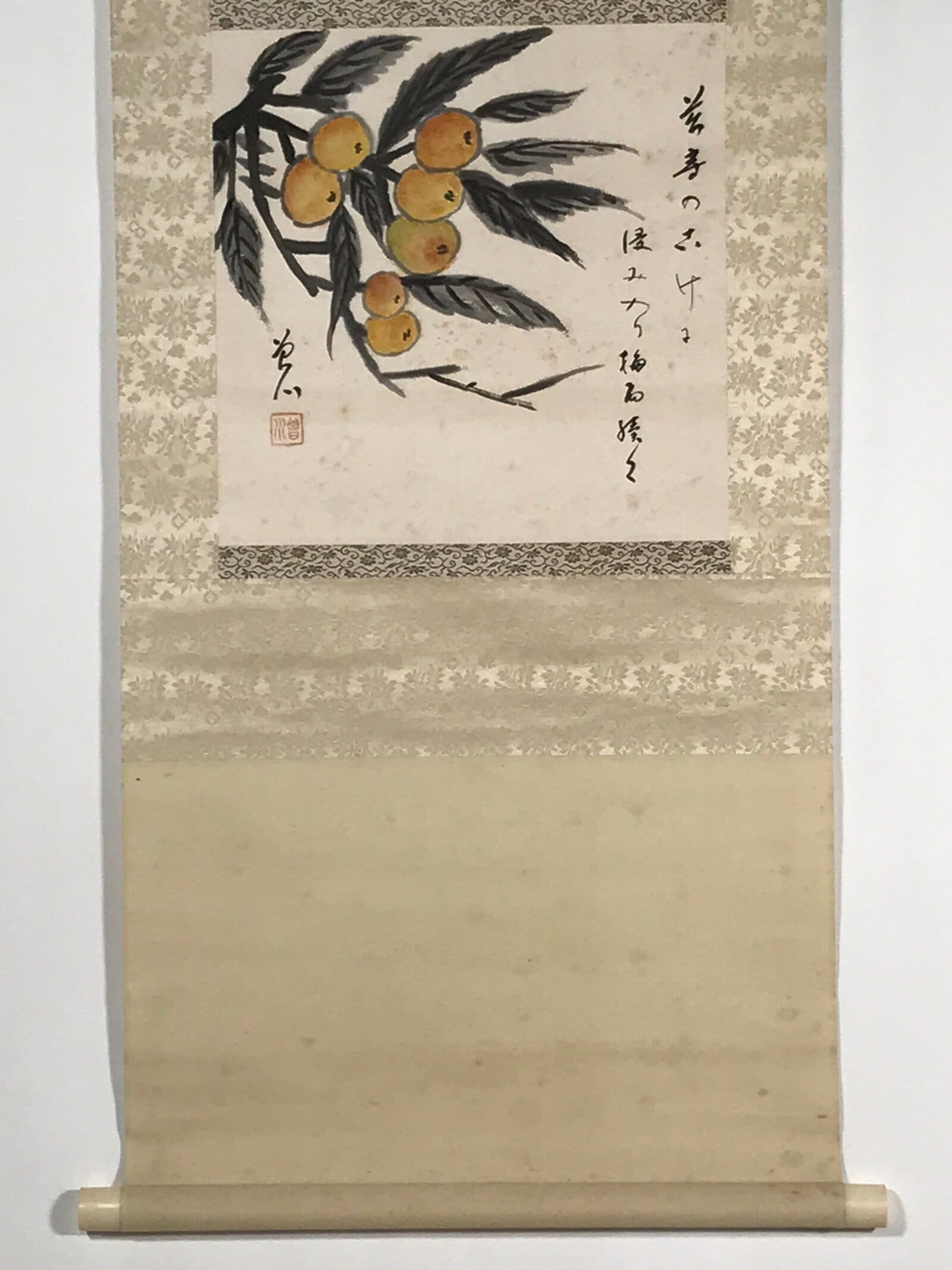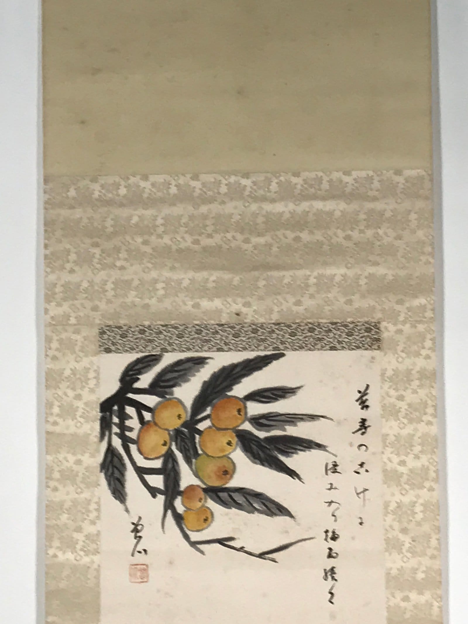 This vintage Japanese hanging scroll (kakejiku or makimono) features a Japanese loquat tree bearing fruits. On the right, there is a poem written in black ink. This piece is signed and has a red seal. It is stored in a wooden box with the title on the lid.