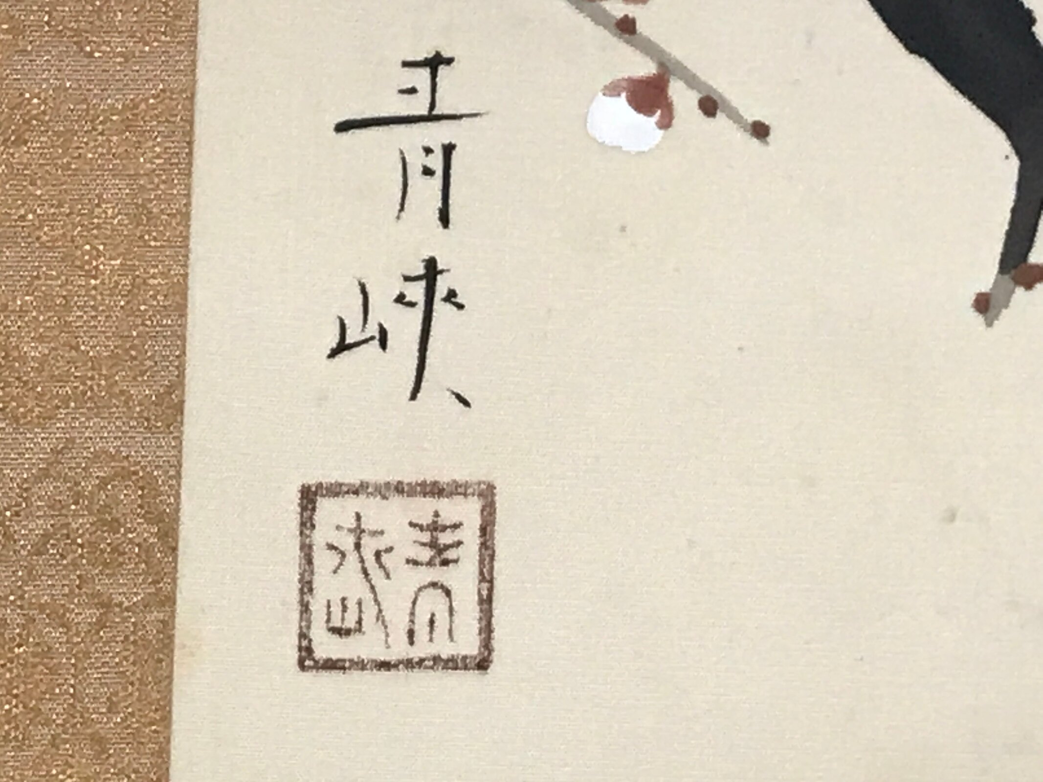 This vintage Japanese hanging scroll (kakejiku or makimono) features a plum tree in blossom with a black, white, and orange bird sitting on one branch. There is also some green bamboo foliage on the left. This bird is called kibitaki in Japanese, a narcissus flycatcher. This piece is signed and has a red seal. The scroll is stored in a wooden box with a sticker on one side.