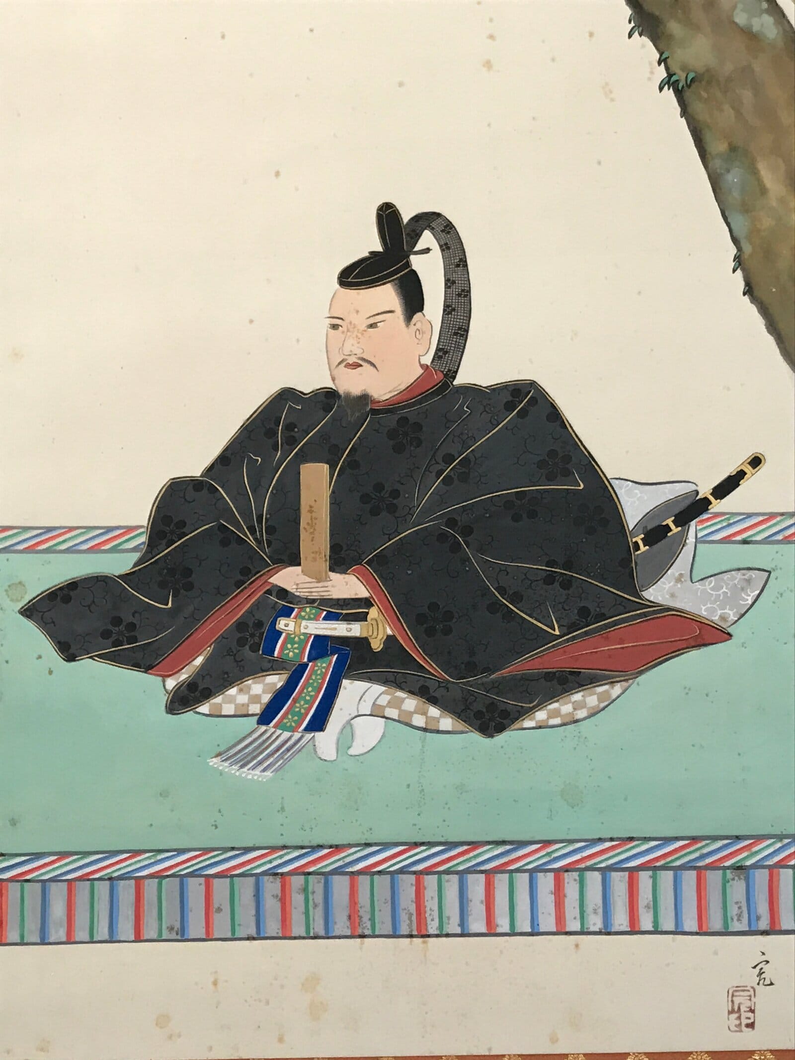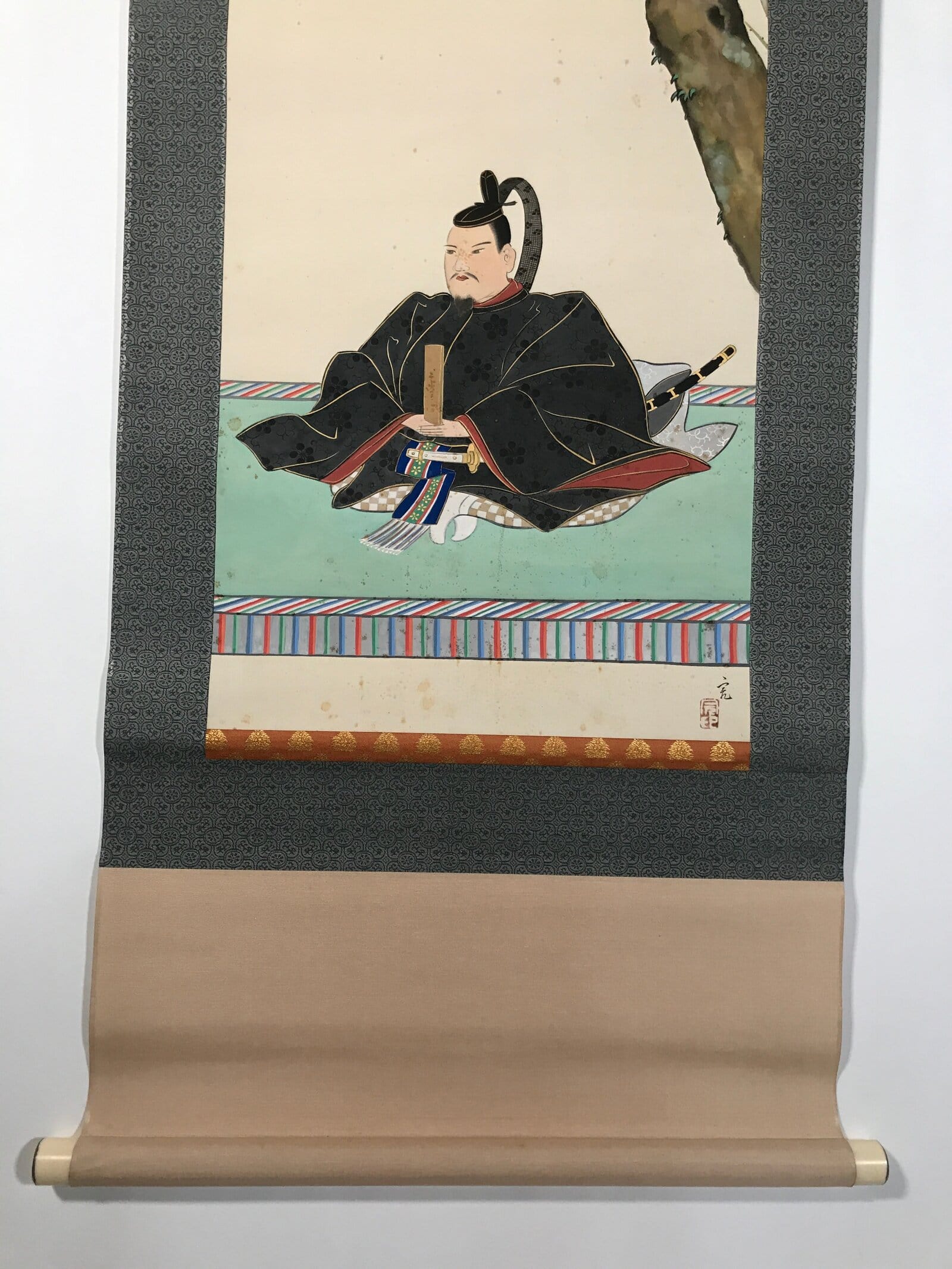 This vintage Japanese boxed hanging scroll (kakejiku or makimono) is a portrait of Sugawara no Michizane, a politician of the Heian period. The man is dressed in a black kimono and is sitting under a matsu pine tree. The scroll is signed with a name and a red seal, and has inscriptions on the outside. The lid of the matching wooden box has inscriptions on the outside and the inside.